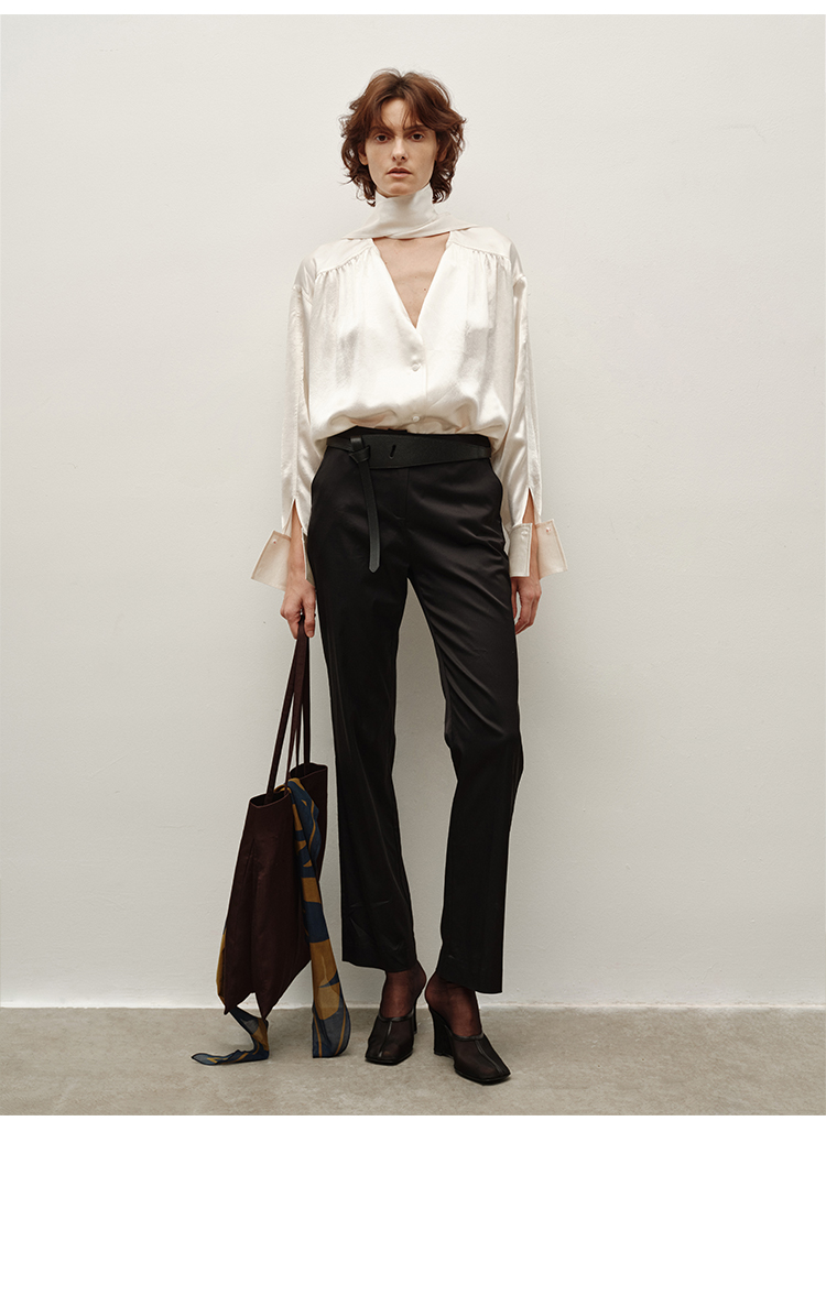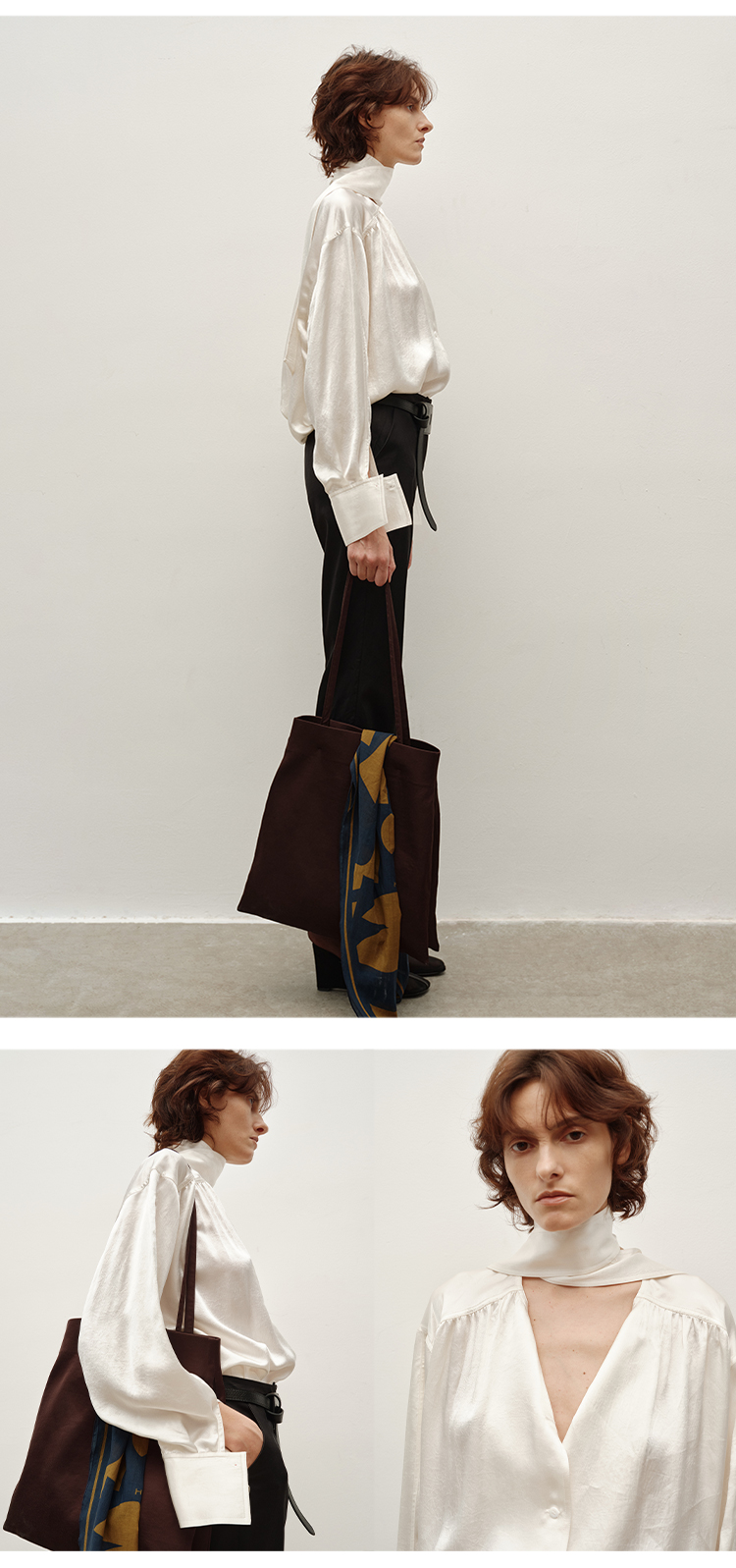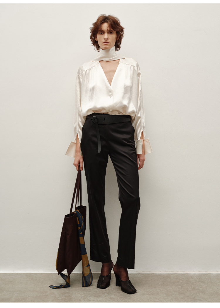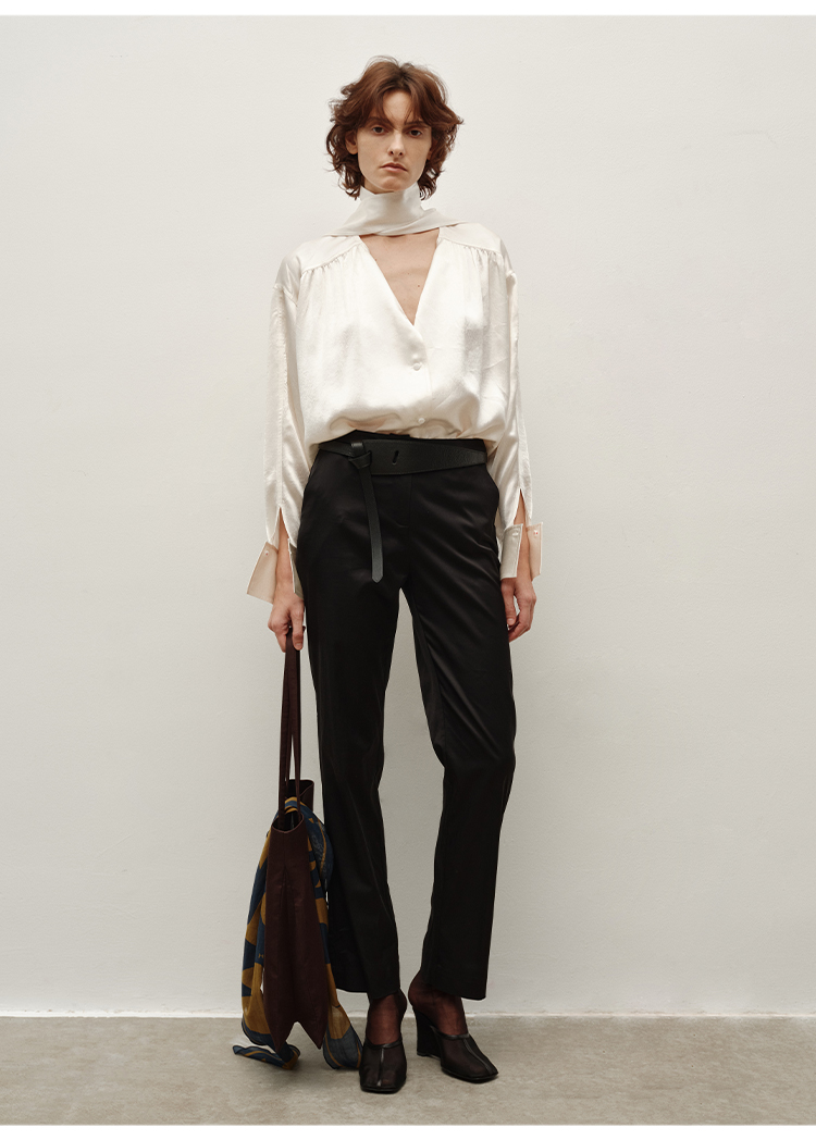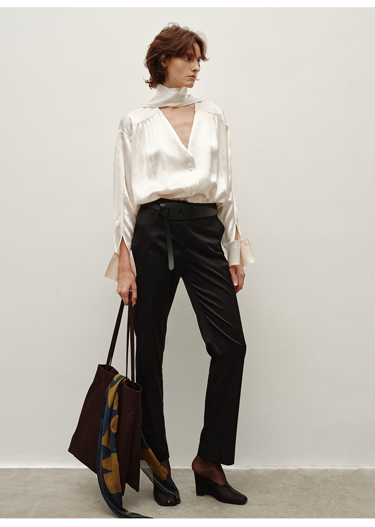HIDEMI 进口百分醋酸飘带领设计感v领折叠袖压褶重工衬衫上衣