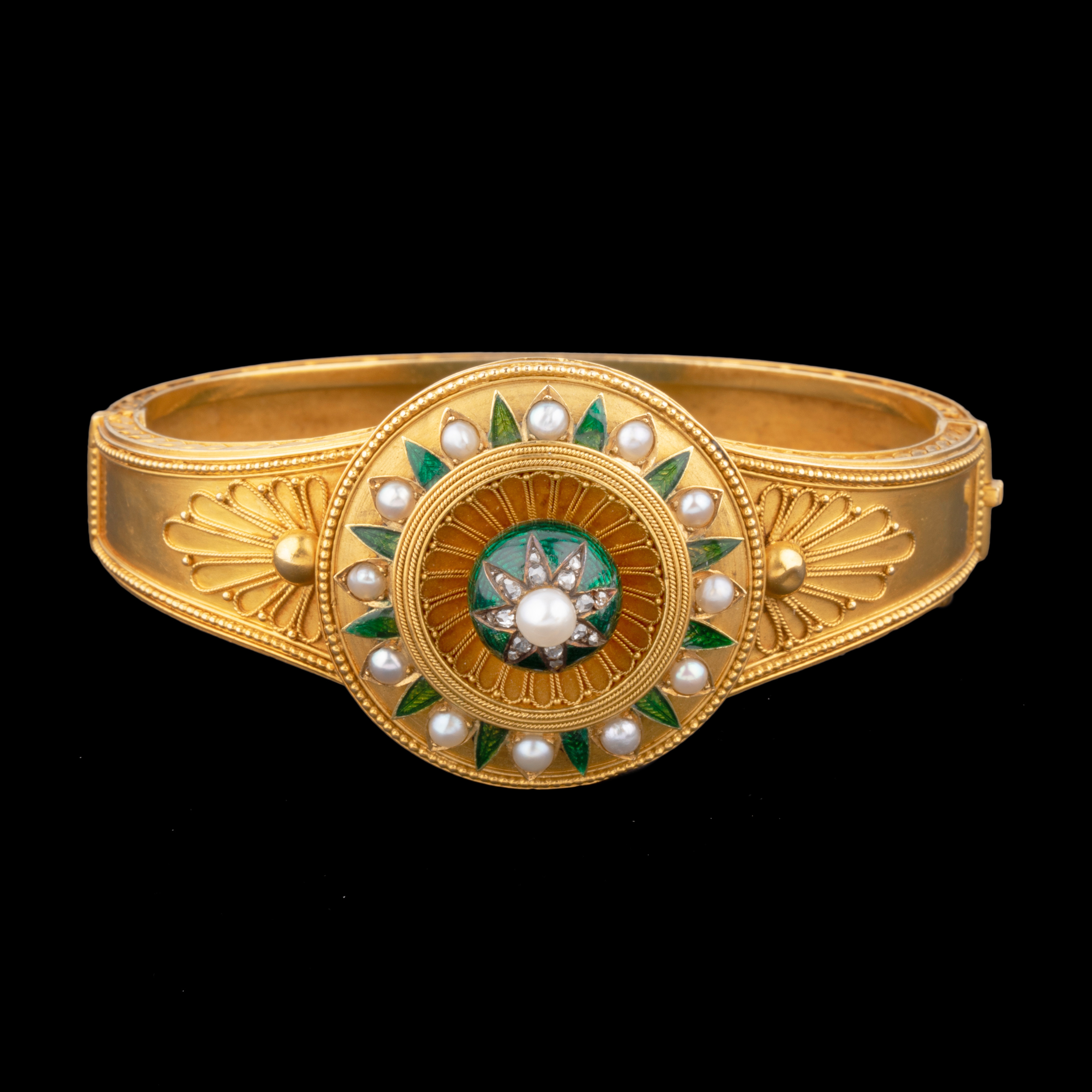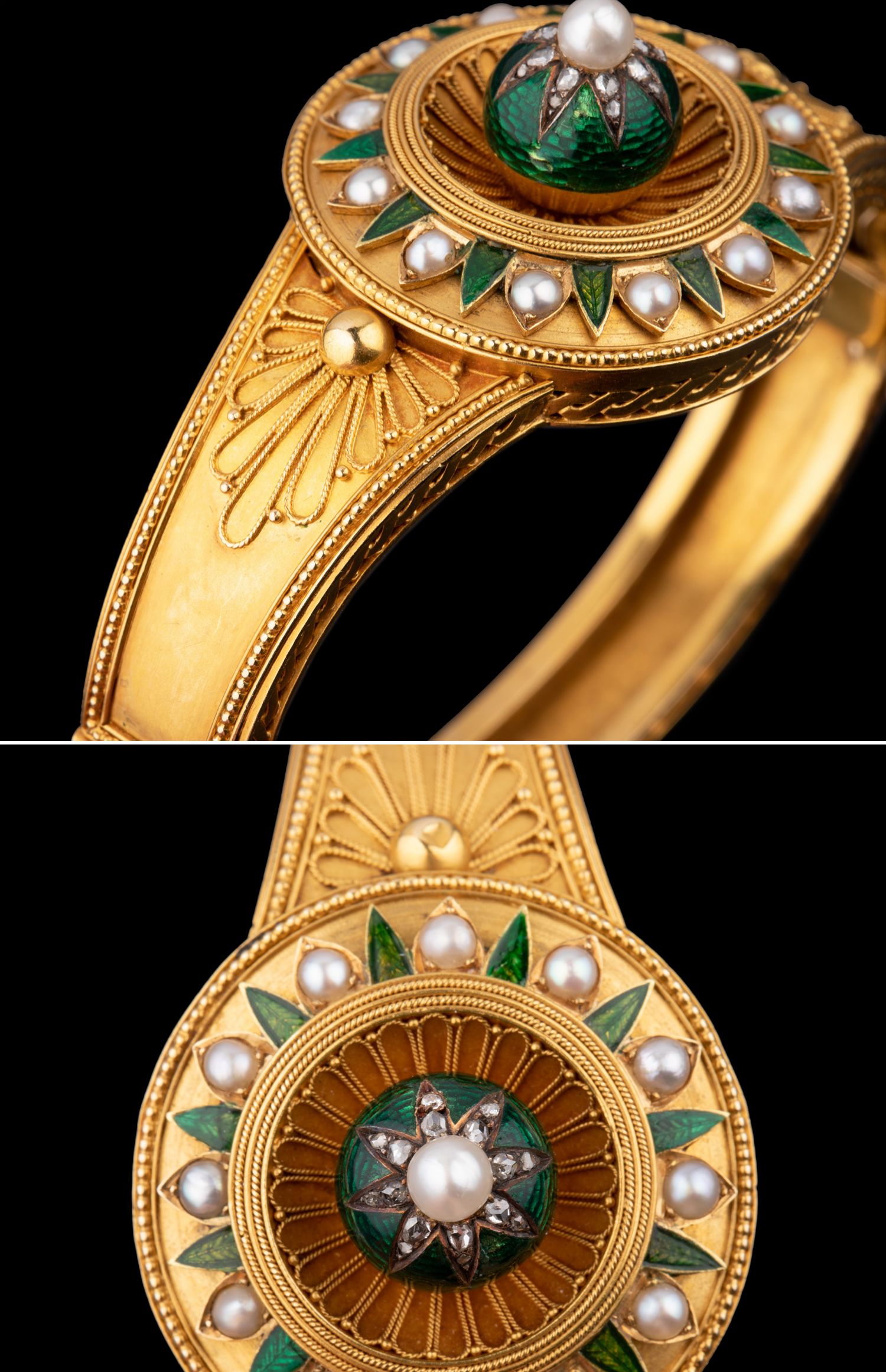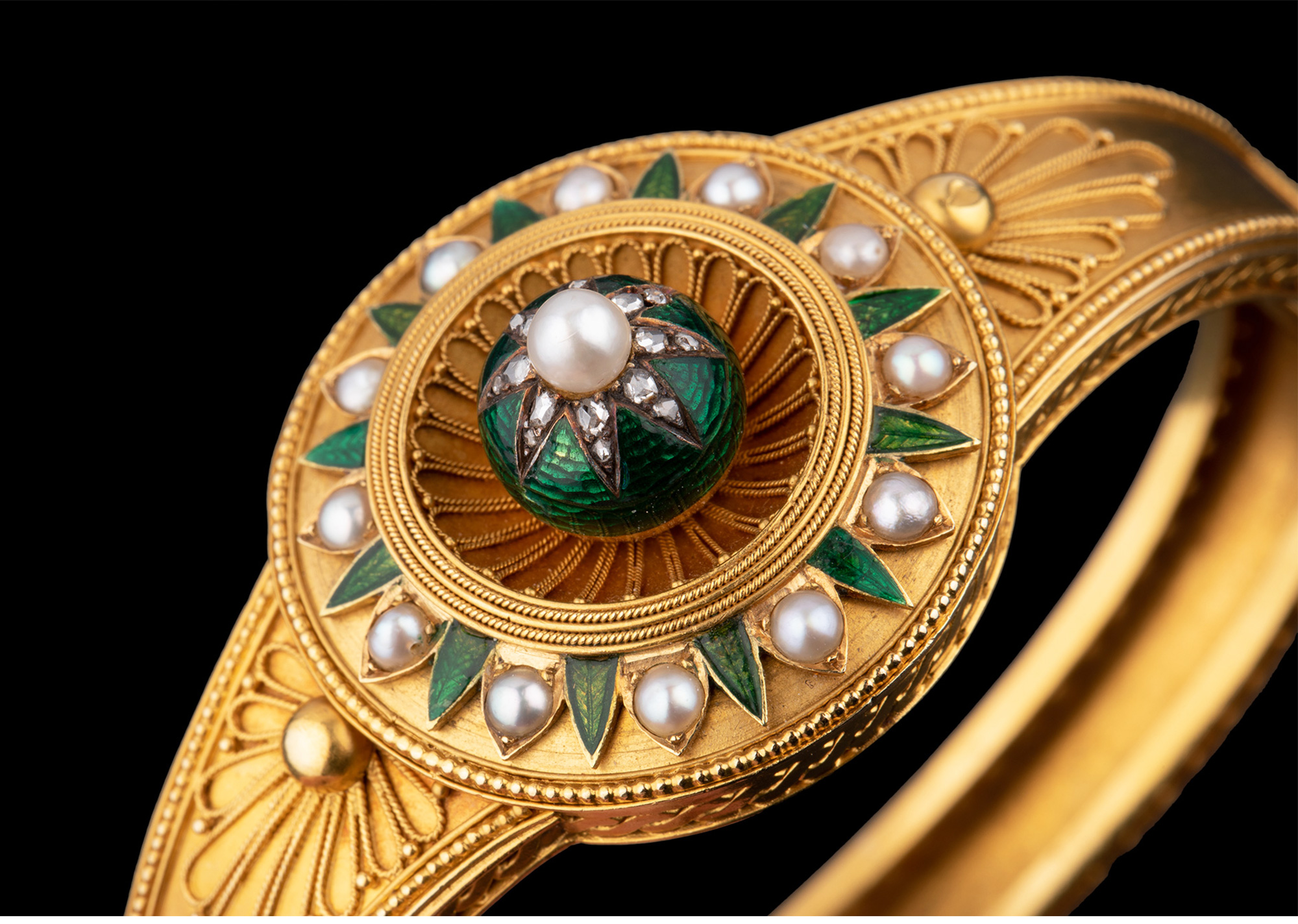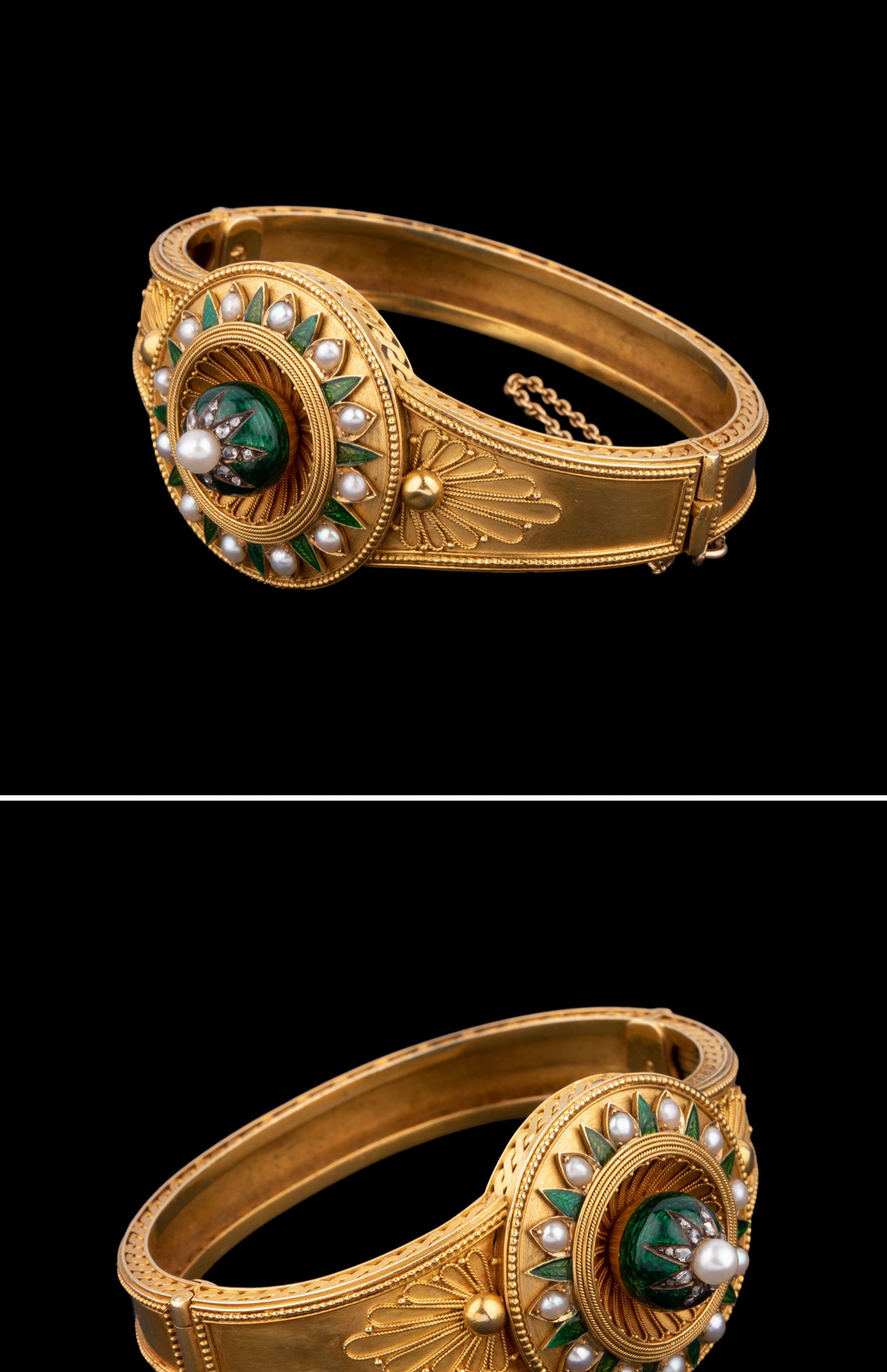 独角鹿西洋古董珠宝首饰C.G工坊18k金镶嵌钻石珍珠祖母绿圆章手镯