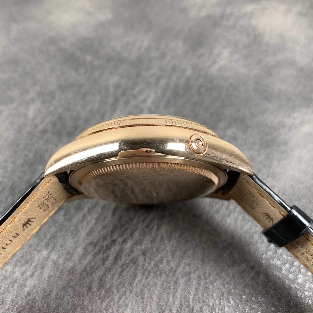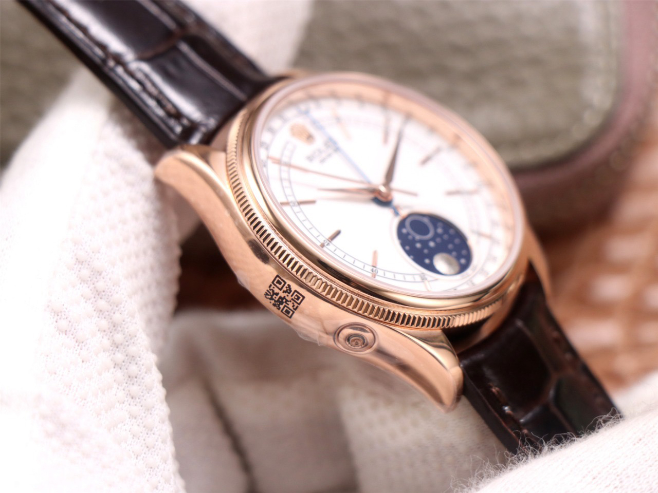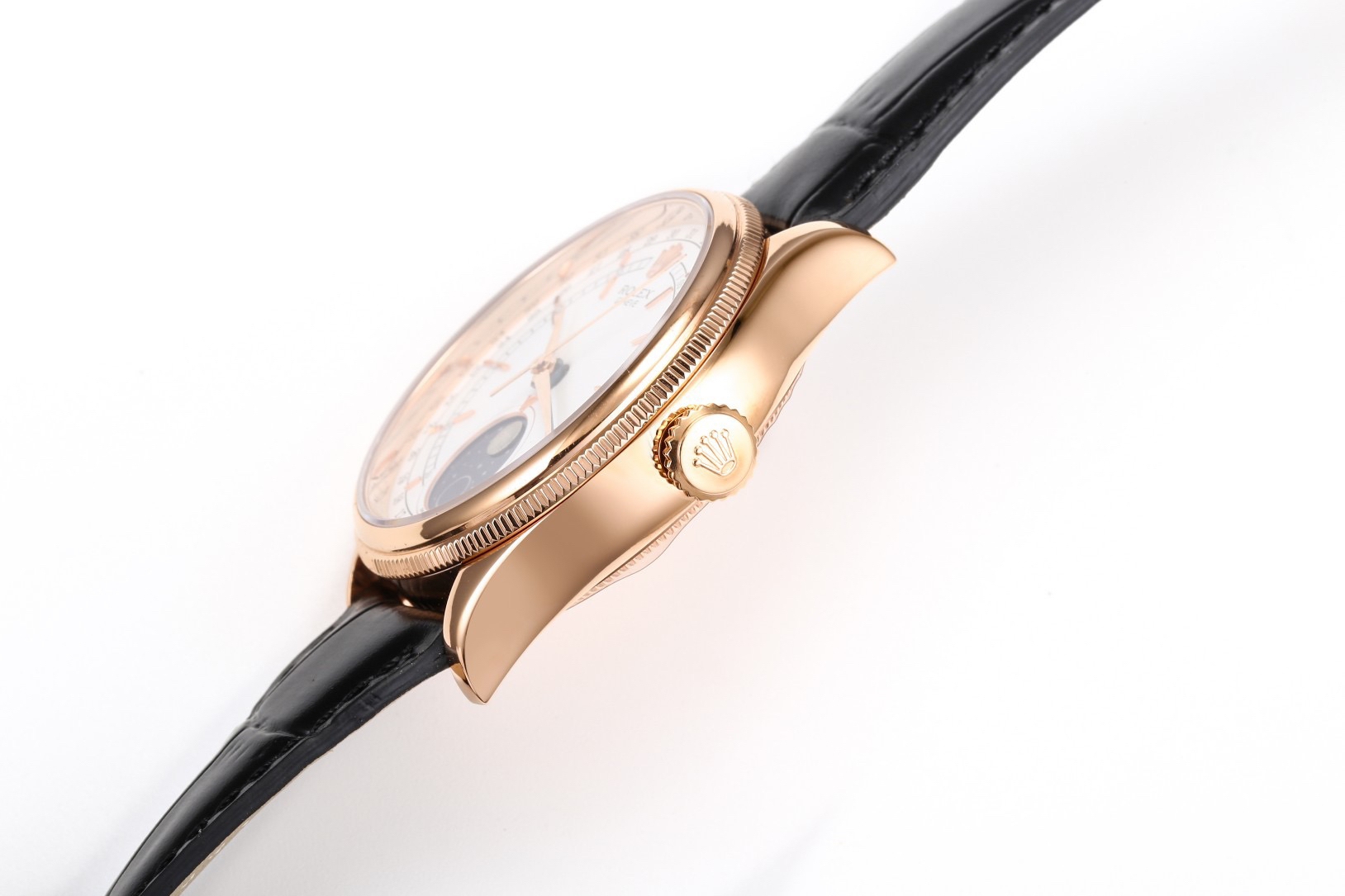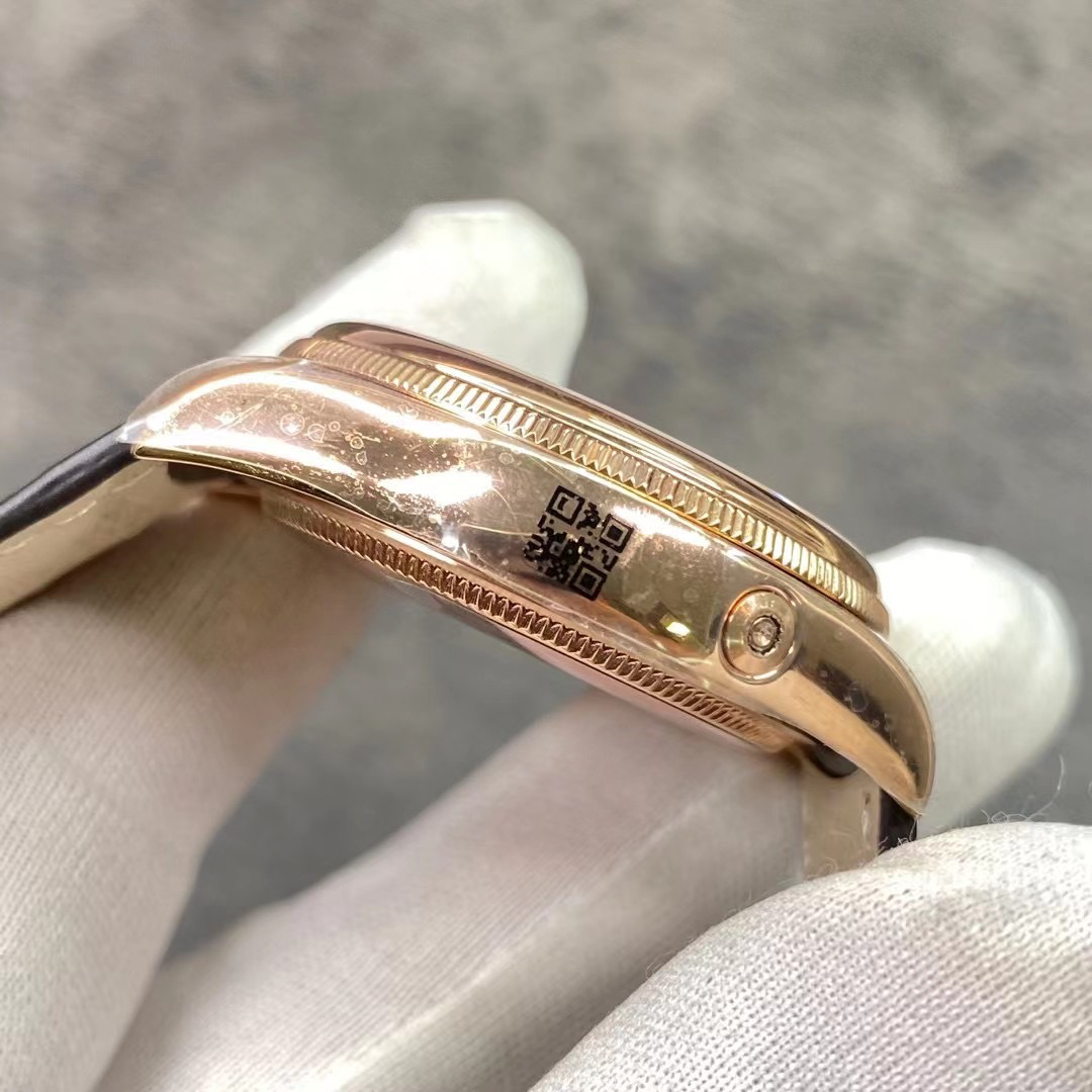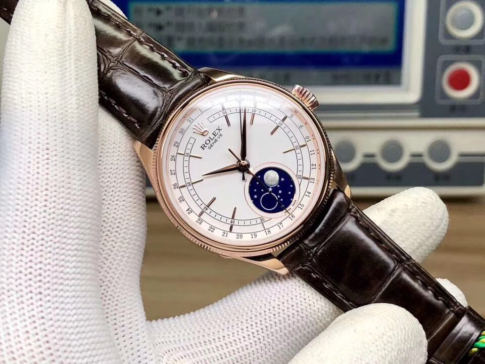 ZZ 劳力士 切利尼系列50535 月相腕表全玫瑰金,红金技术。厚度达到包金一般的标准。独家定制机芯,功能做到和原装一致。可以单独调节时针,来调节日历。8点位有一个按钮,来调节月相。同样,月相上的陨石