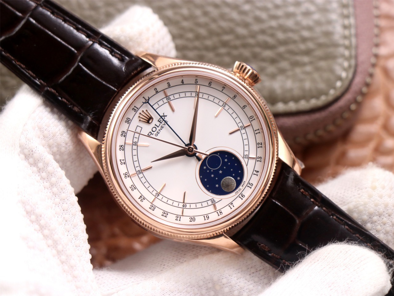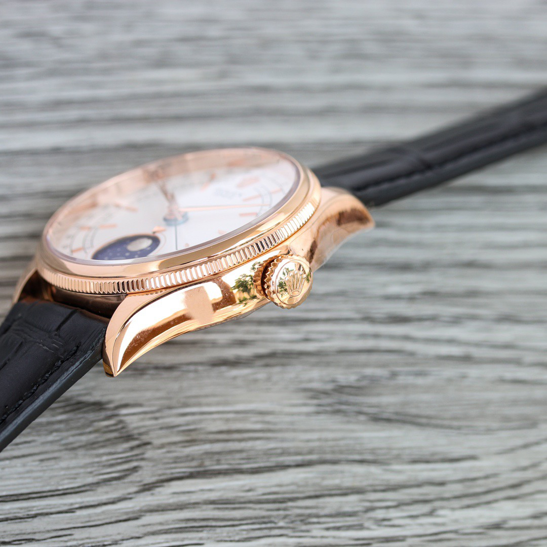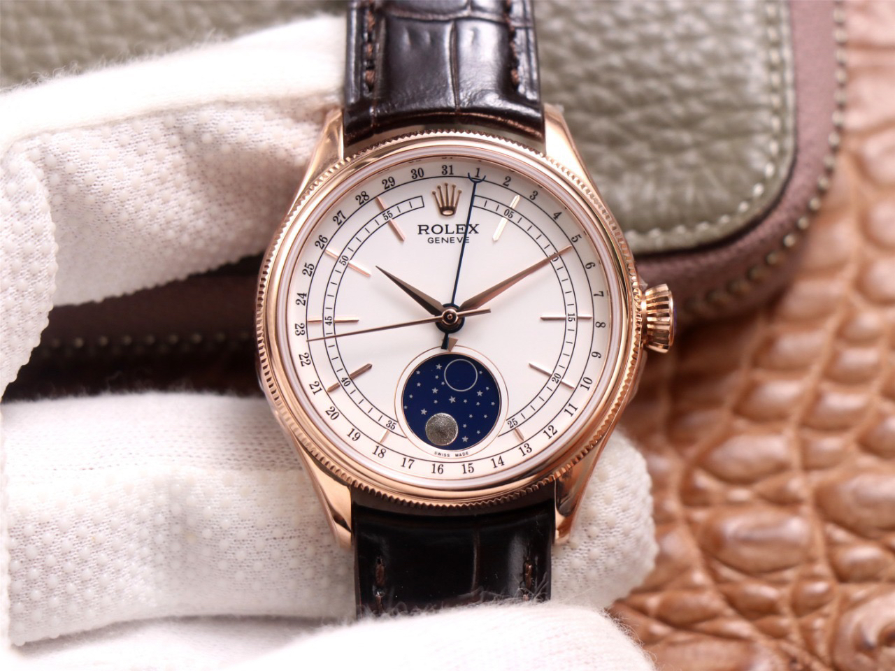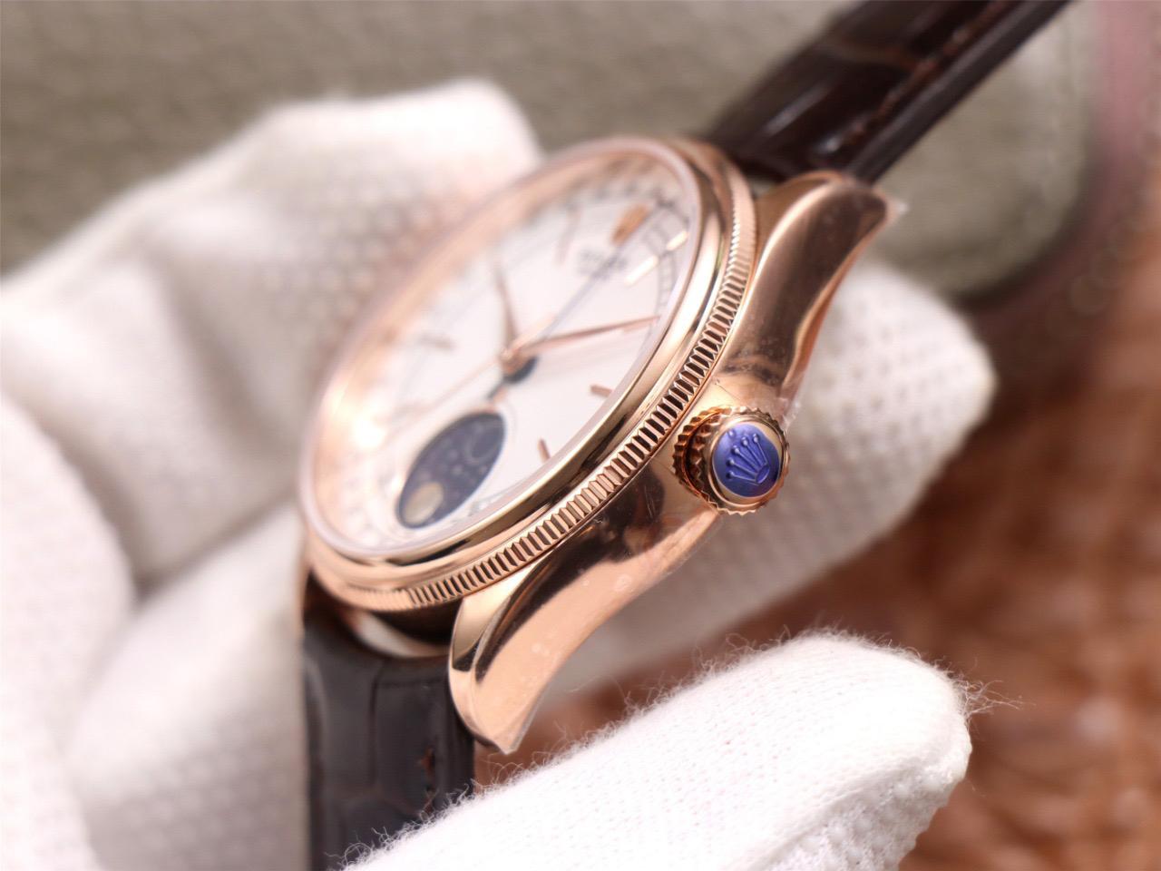 ZZ 劳力士 切利尼系列50535 月相腕表全玫瑰金,红金技术。厚度达到包金一般的标准。独家定制机芯,功能做到和原装一致。可以单独调节时针,来调节日历。8点位有一个按钮,来调节月相。同样,月相上的陨石