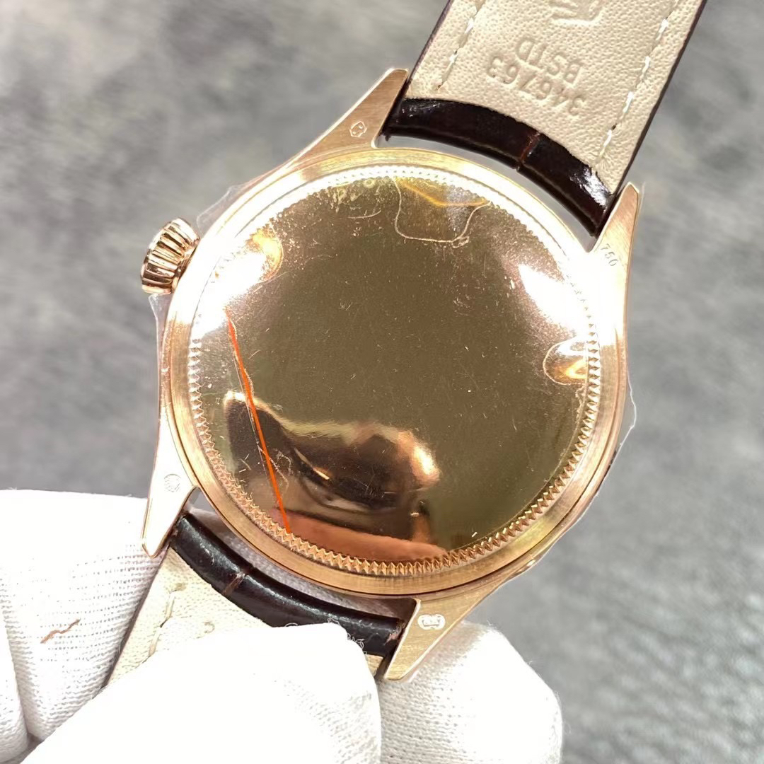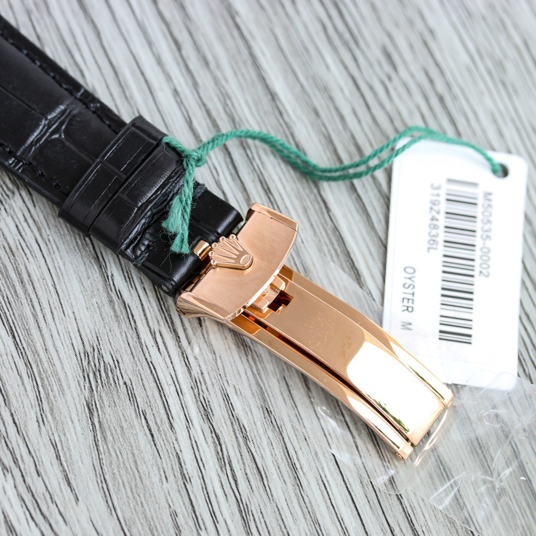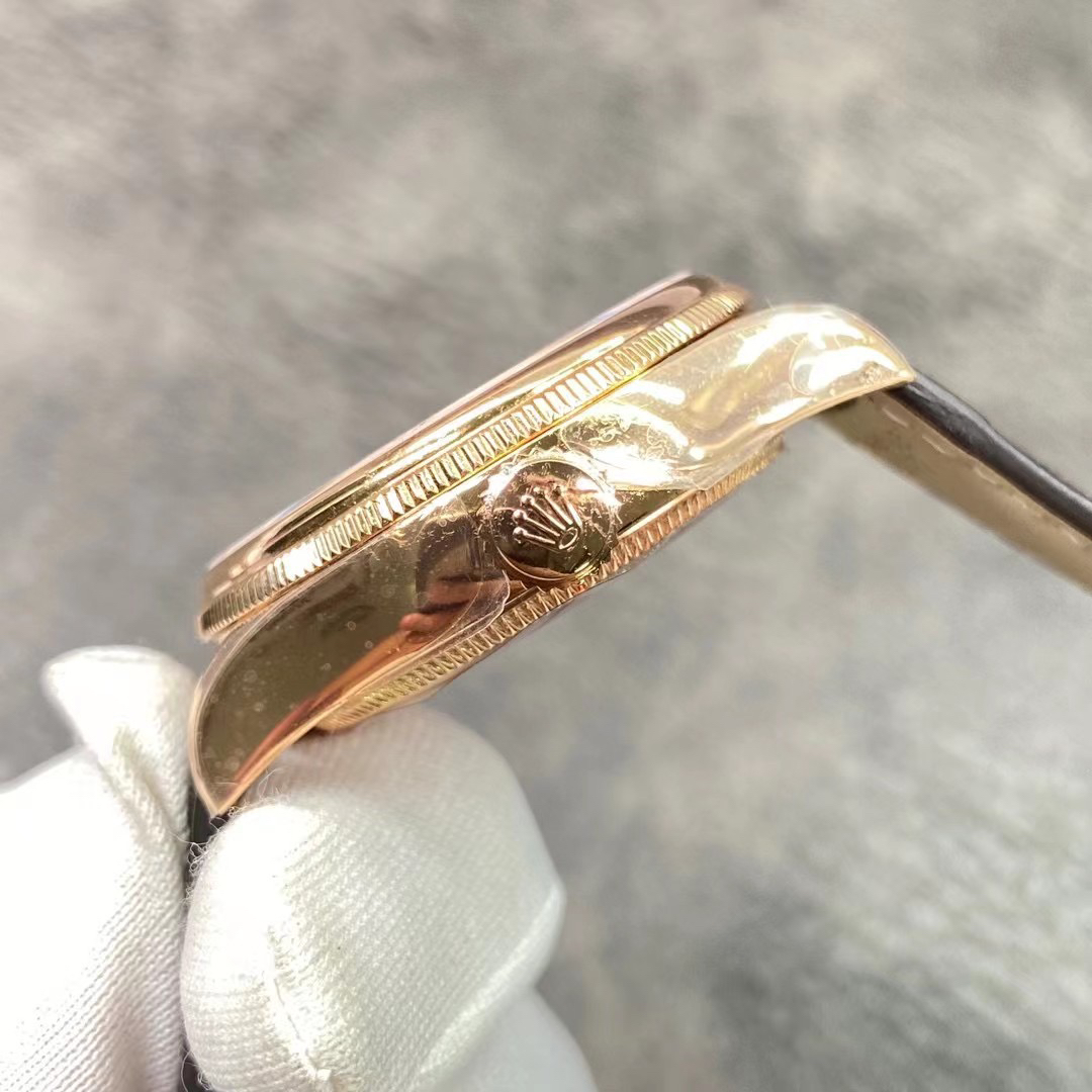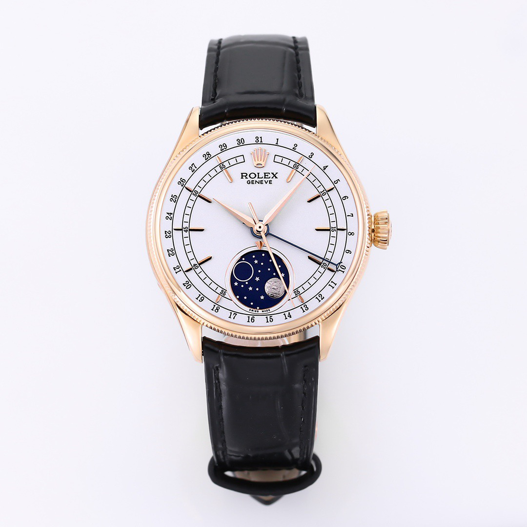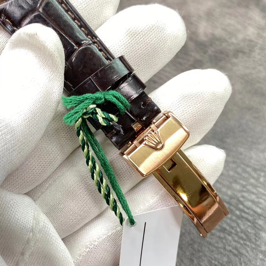 ZZ 劳力士 切利尼系列50535 月相腕表全玫瑰金,红金技术。厚度达到包金一般的标准。独家定制机芯,功能做到和原装一致。可以单独调节时针,来调节日历。8点位有一个按钮,来调节月相。同样,月相上的陨石