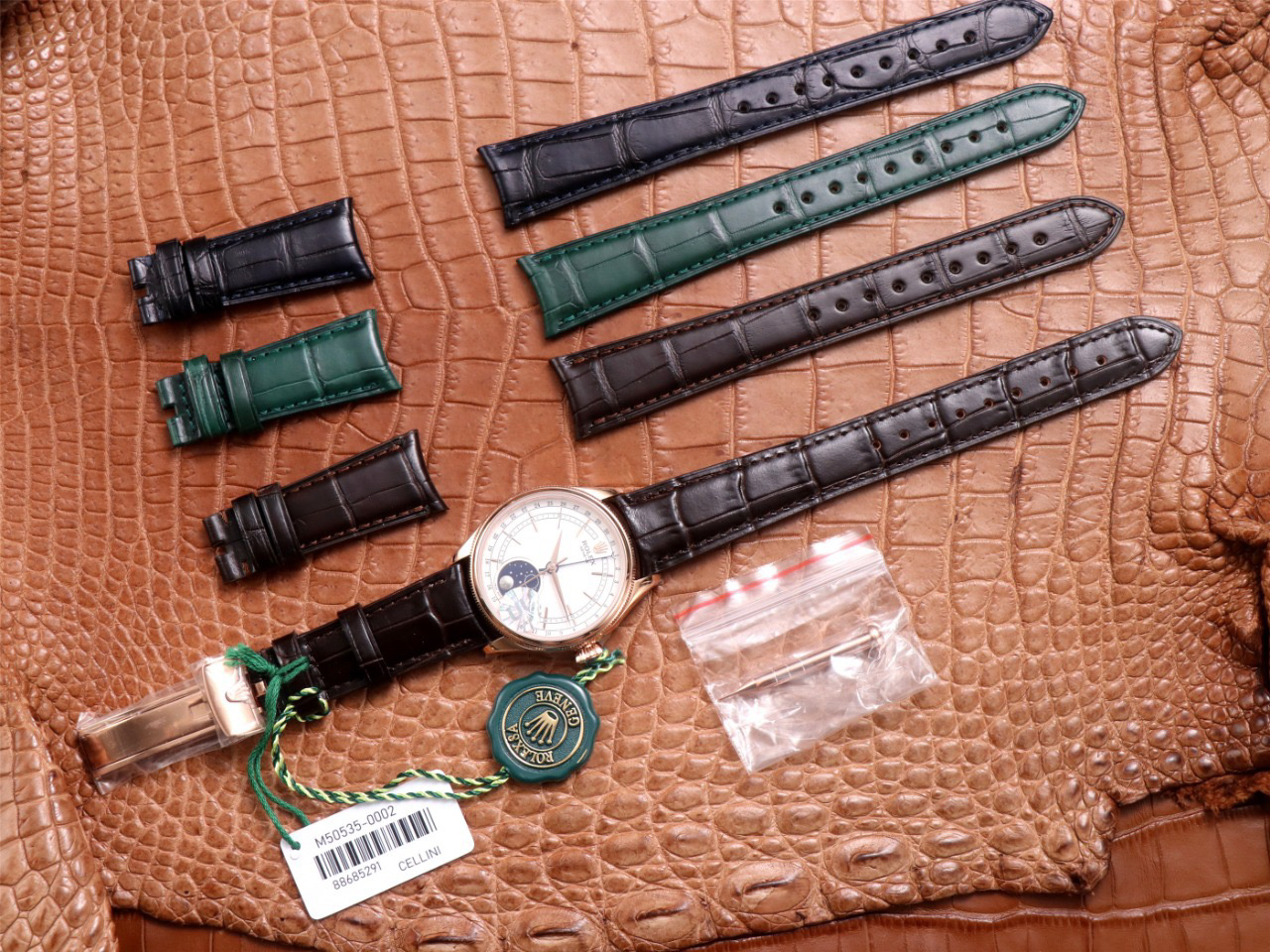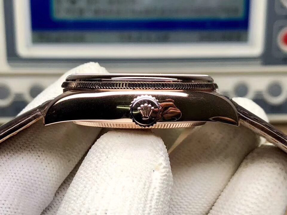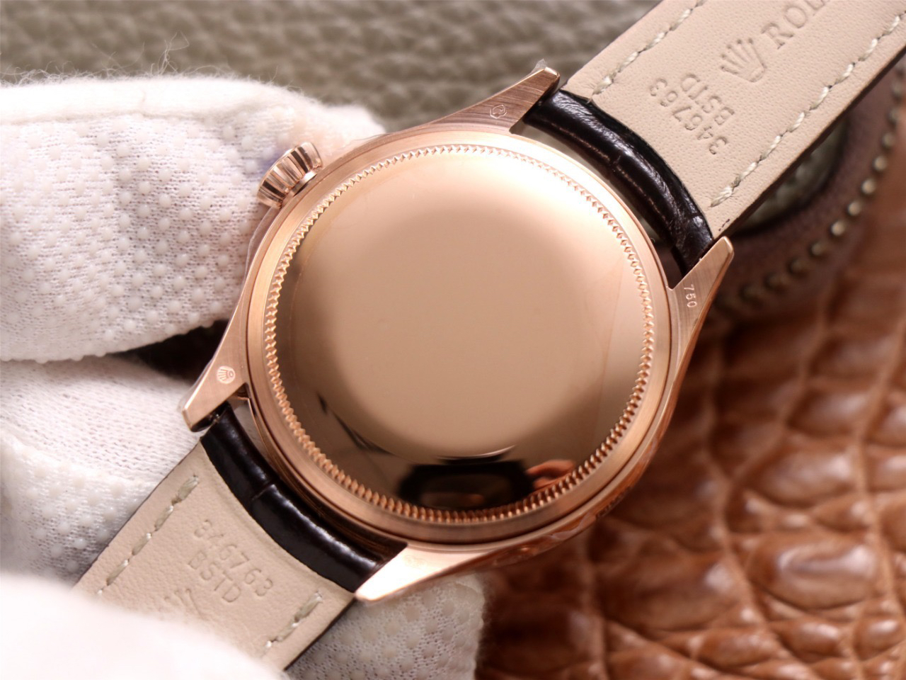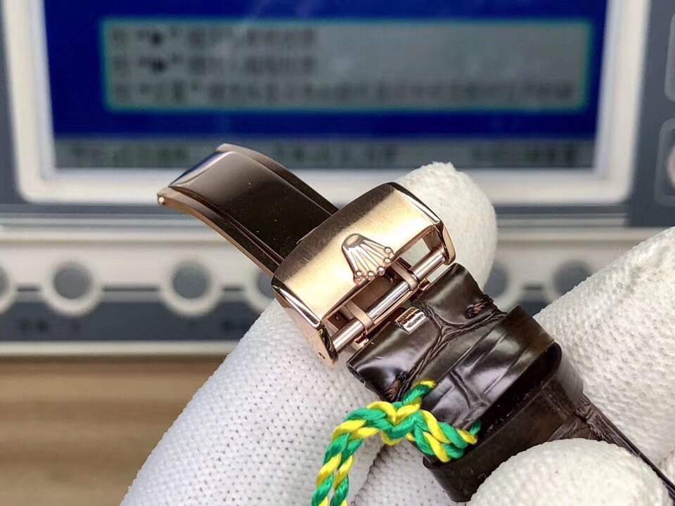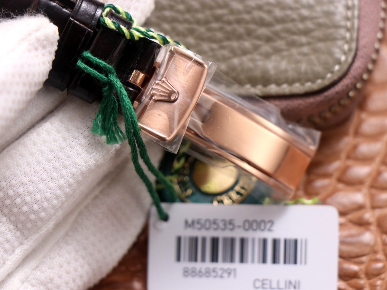 ZZ 劳力士 切利尼系列50535 月相腕表全玫瑰金,红金技术。厚度达到包金一般的标准。独家定制机芯,功能做到和原装一致。可以单独调节时针,来调节日历。8点位有一个按钮,来调节月相。同样,月相上的陨石