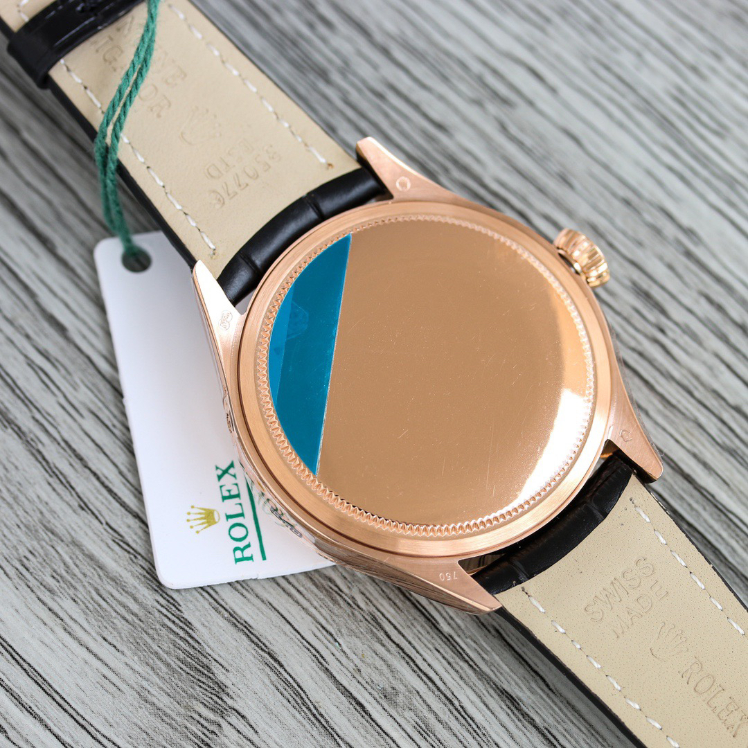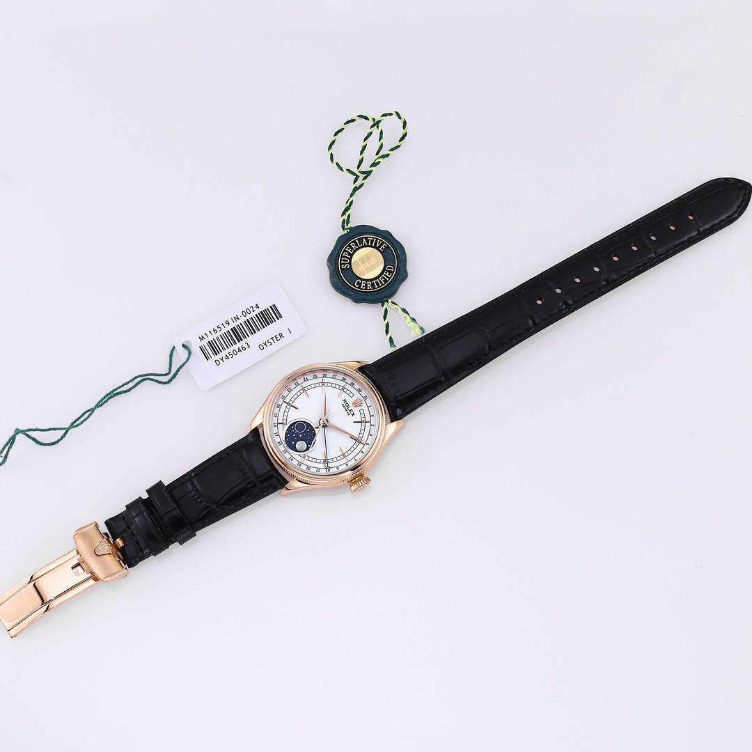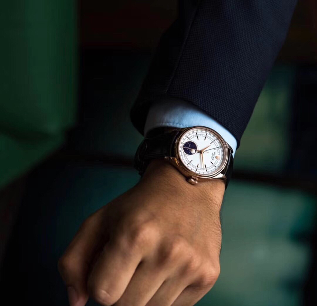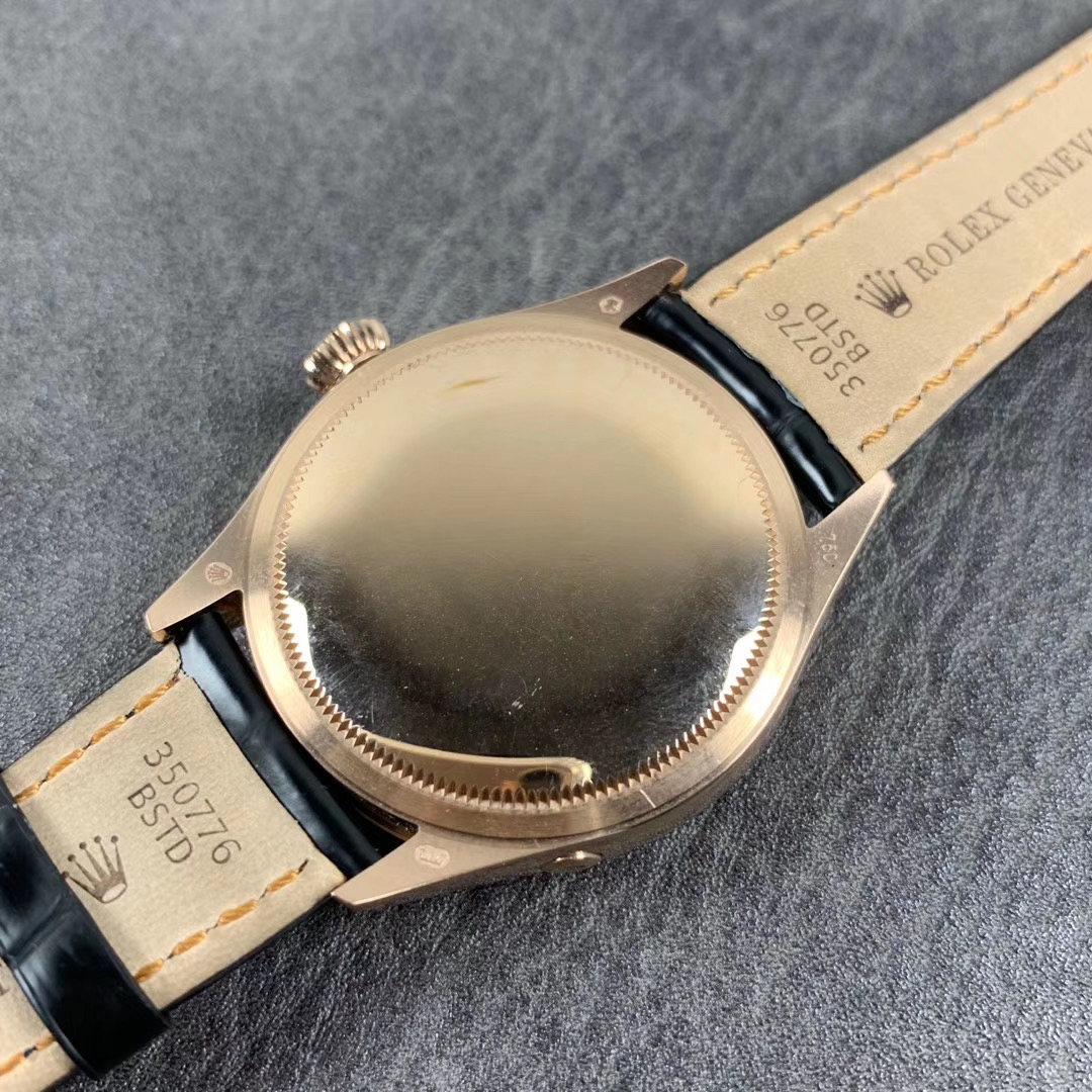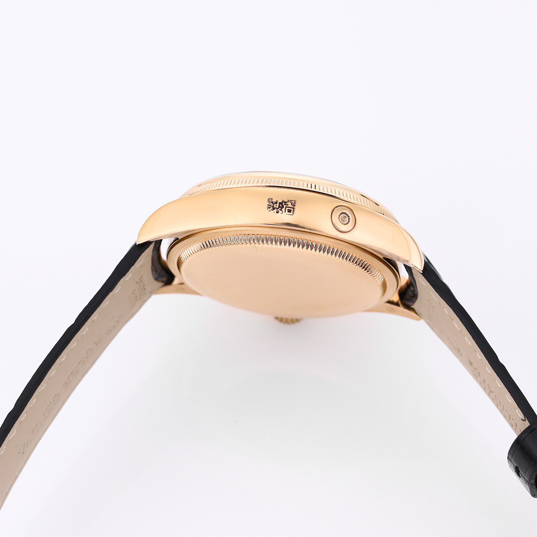 ZZ 劳力士 切利尼系列50535 月相腕表全玫瑰金,红金技术。厚度达到包金一般的标准。独家定制机芯,功能做到和原装一致。可以单独调节时针,来调节日历。8点位有一个按钮,来调节月相。同样,月相上的陨石