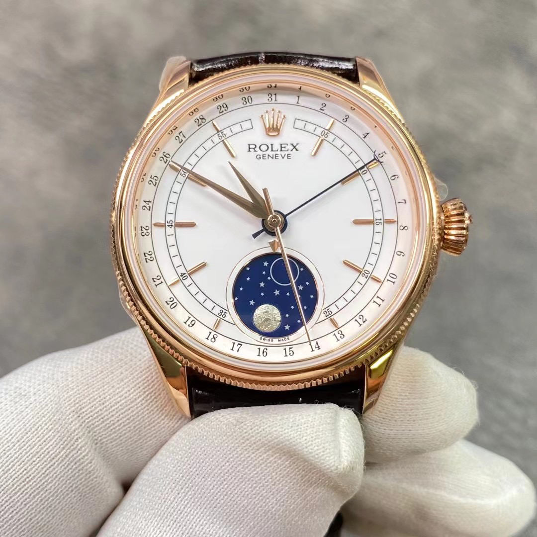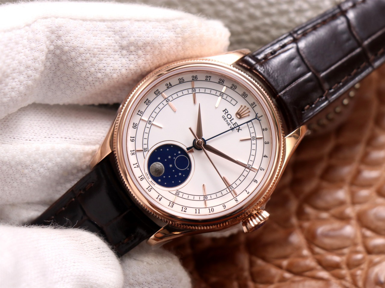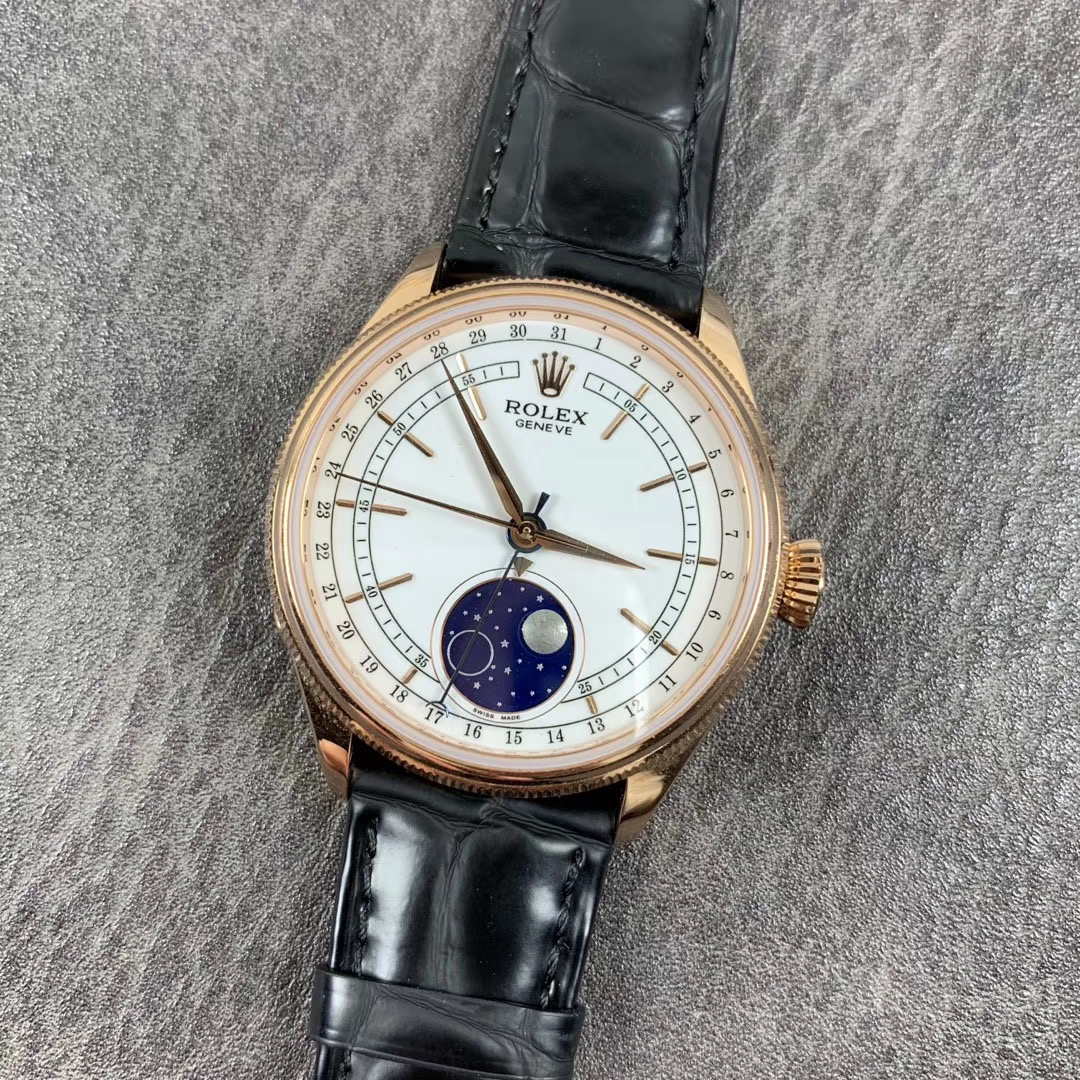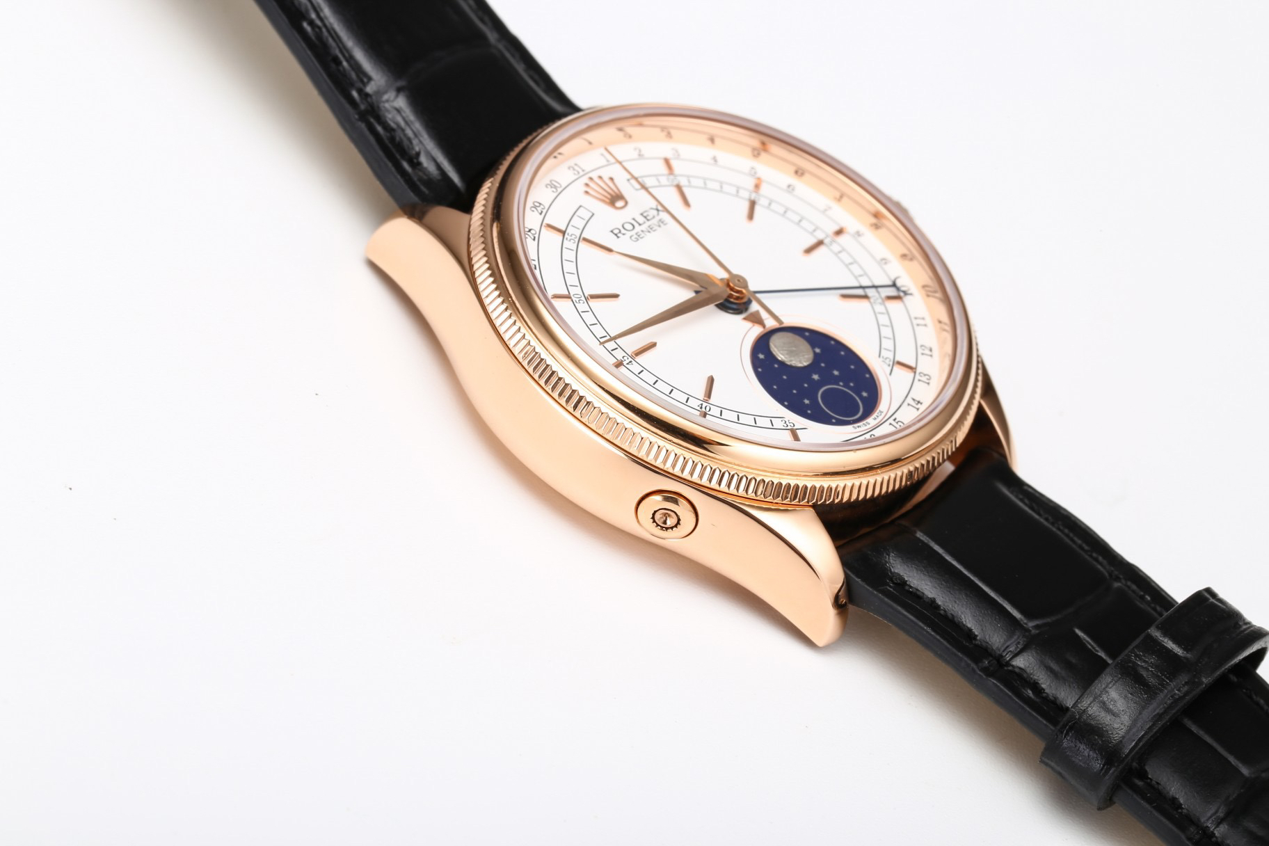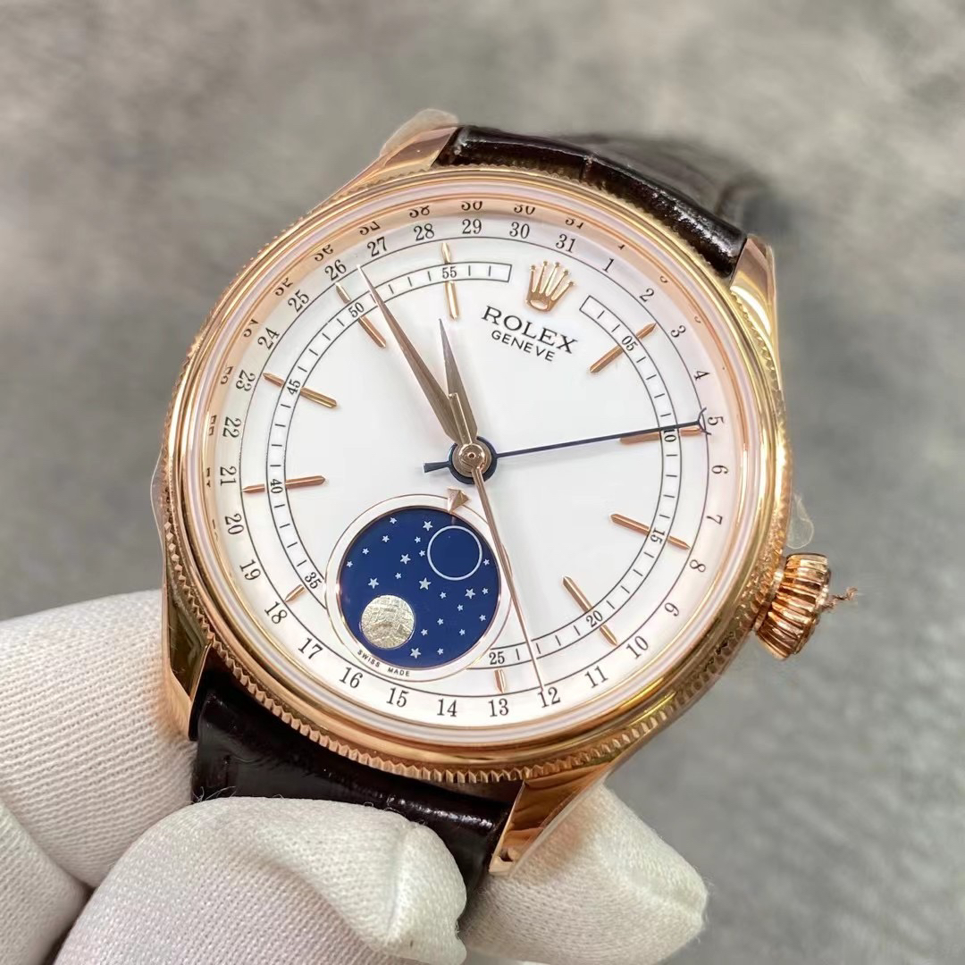 ZZ 劳力士 切利尼系列50535 月相腕表全玫瑰金,红金技术。厚度达到包金一般的标准。独家定制机芯,功能做到和原装一致。可以单独调节时针,来调节日历。8点位有一个按钮,来调节月相。同样,月相上的陨石也为真陨石。