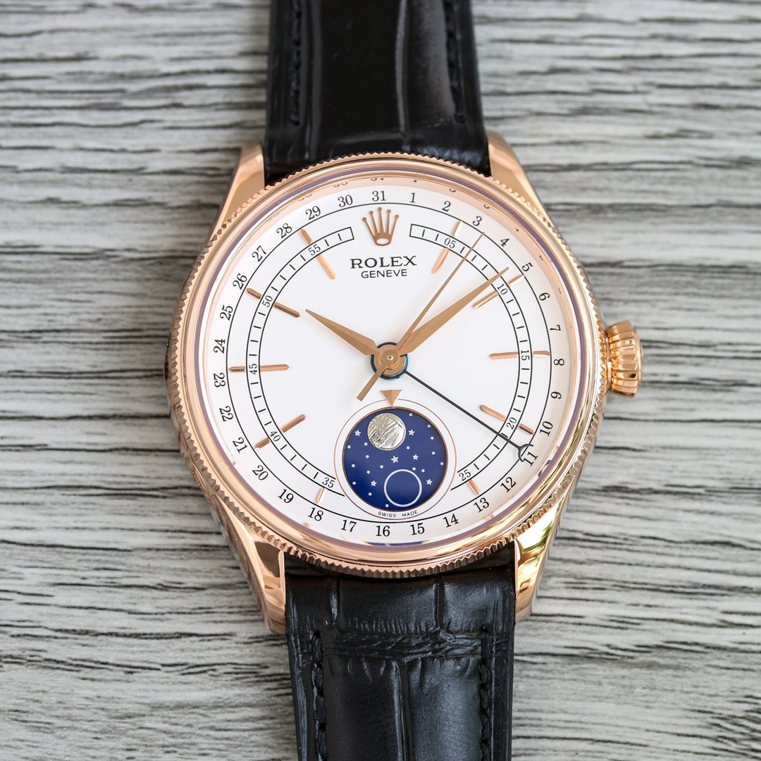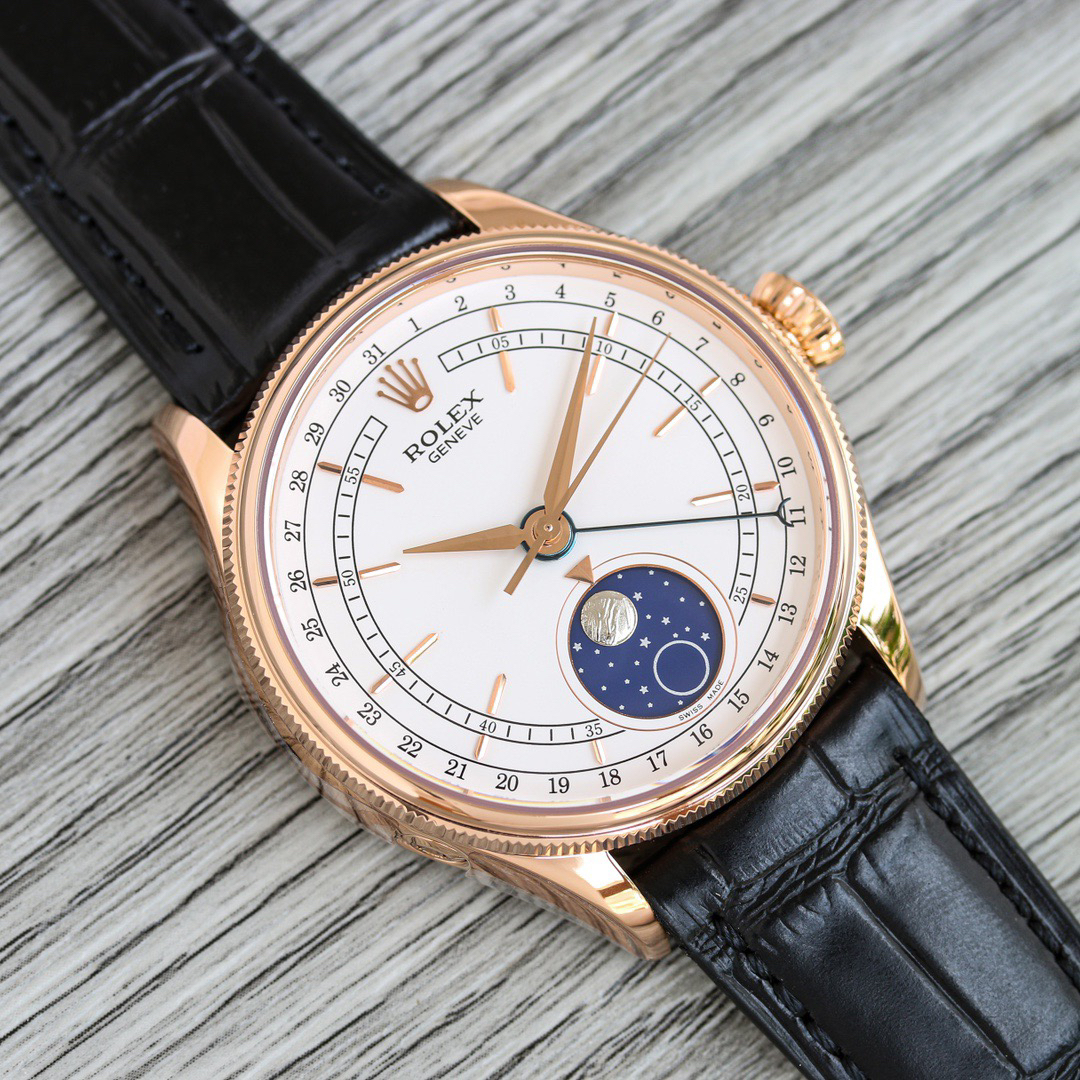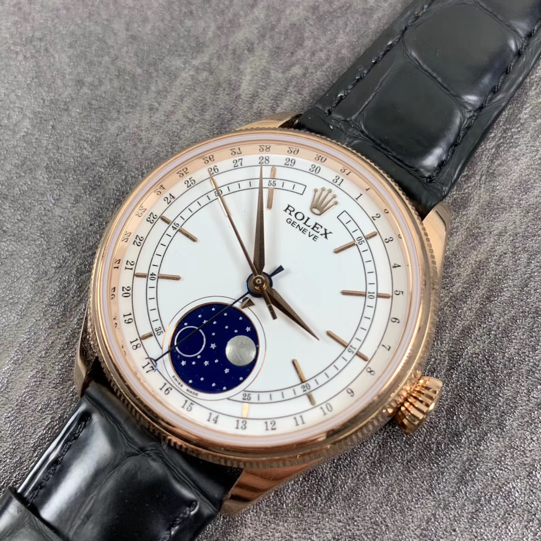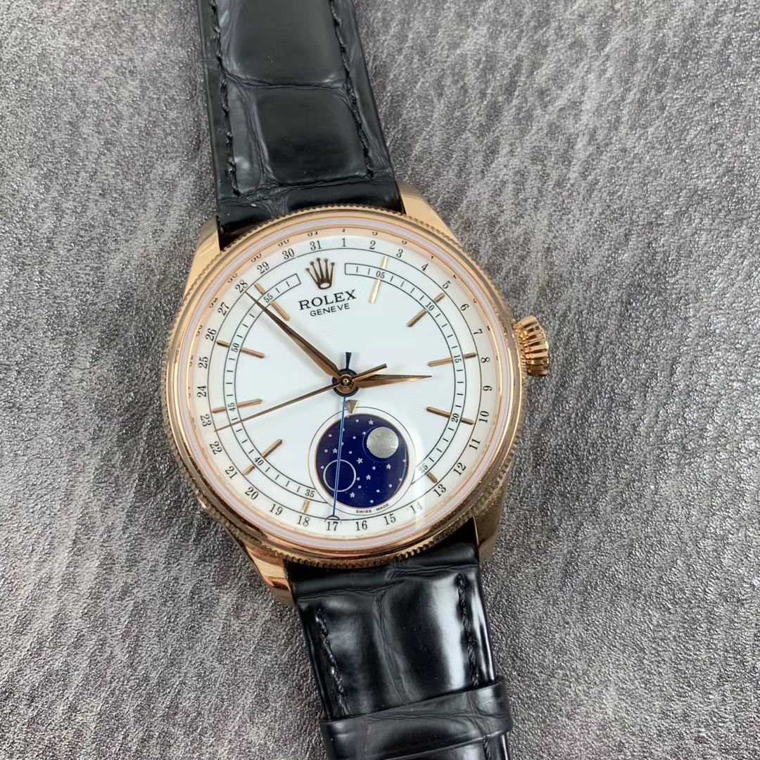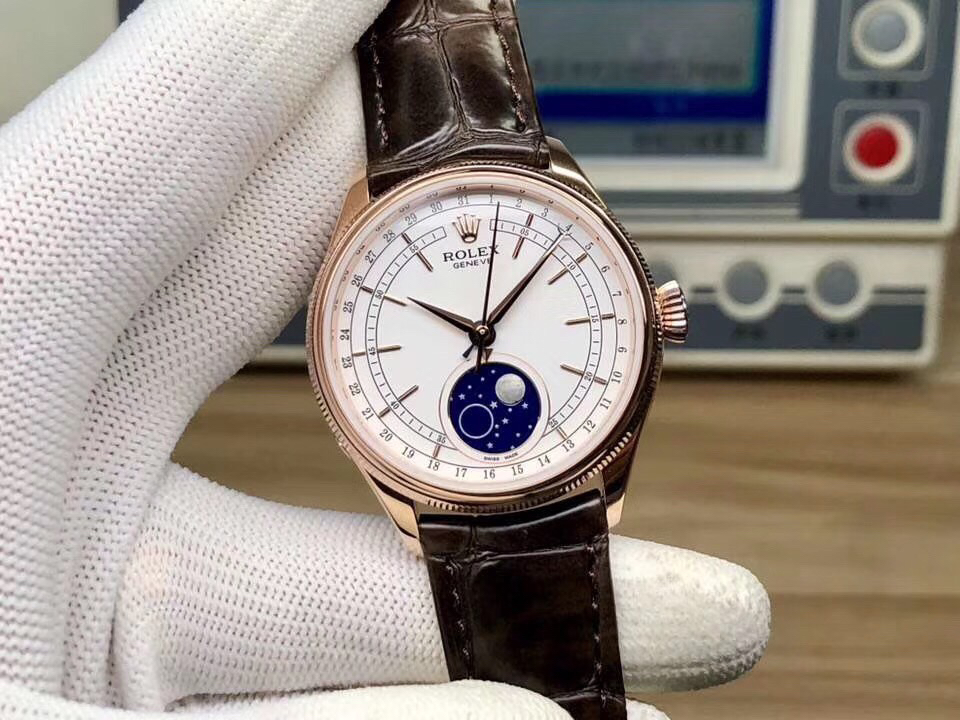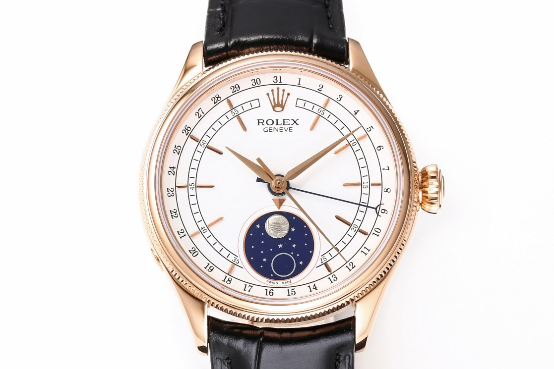 ZZ 劳力士 切利尼系列50535 月相腕表全玫瑰金,红金技术。厚度达到包金一般的标准。独家定制机芯,功能做到和原装一致。可以单独调节时针,来调节日历。8点位有一个按钮,来调节月相。同样,月相上的陨石也为真陨石。