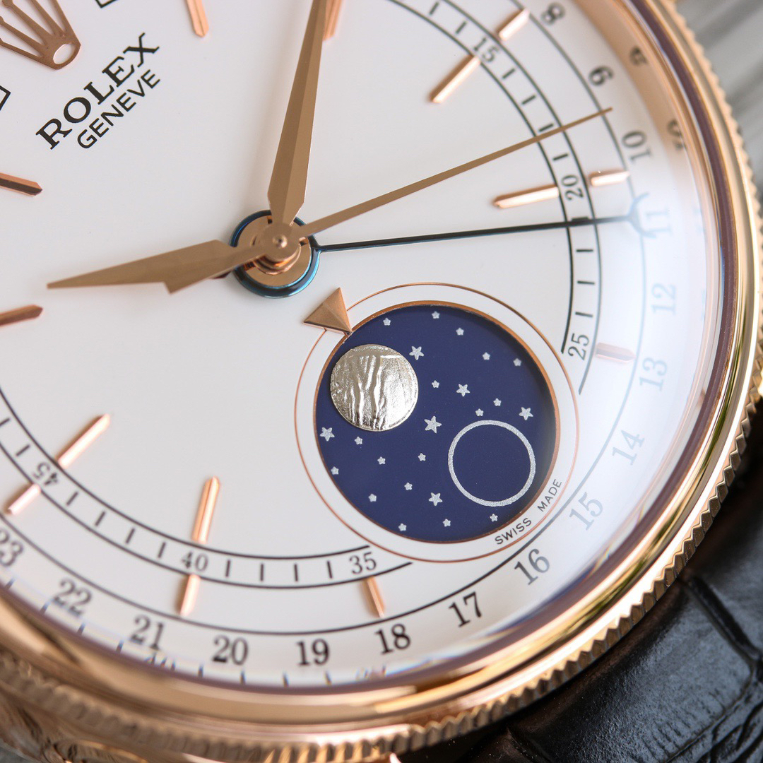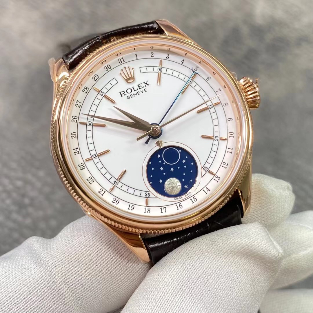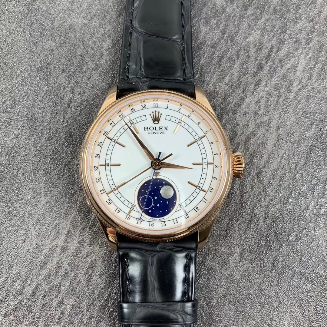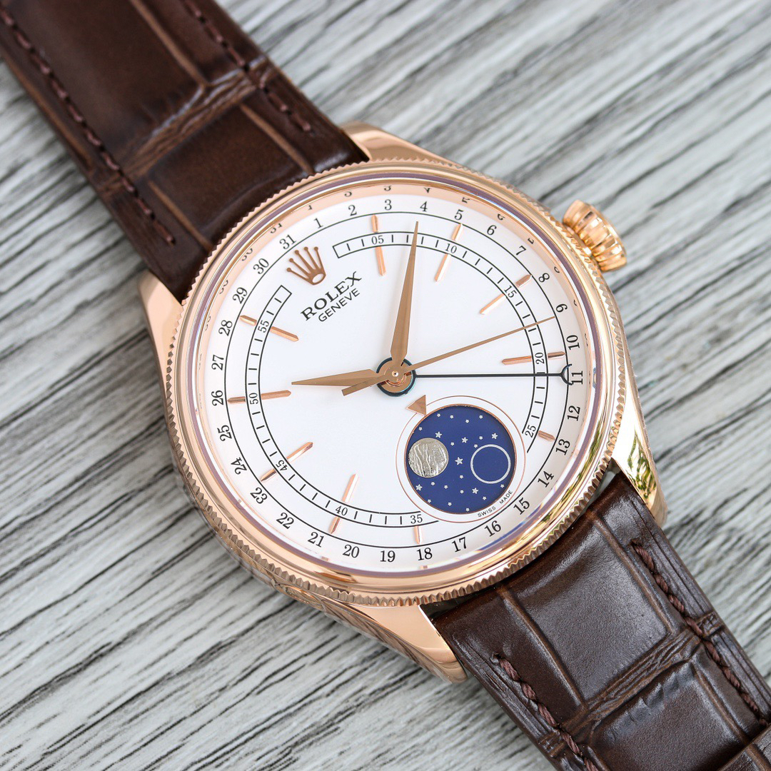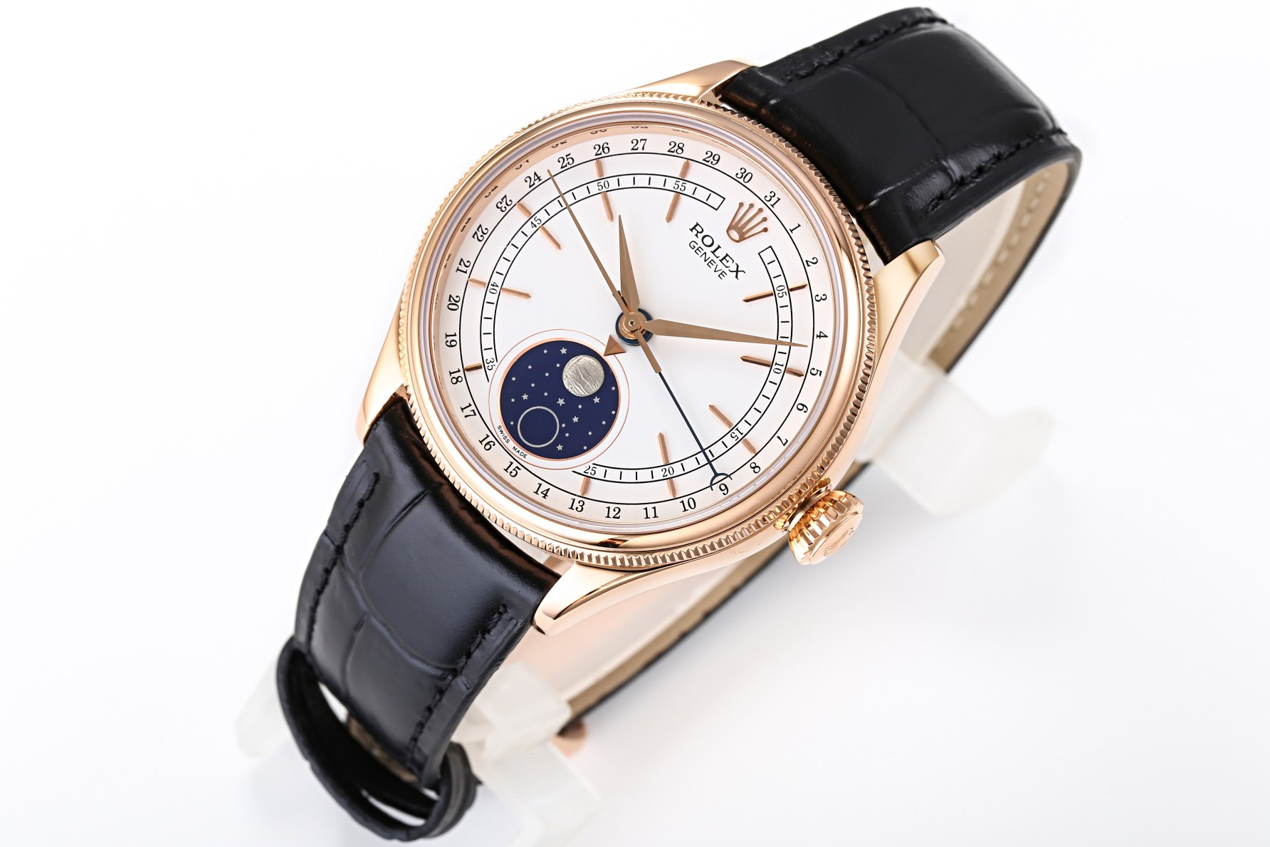 ZZ 劳力士 切利尼系列50535 月相腕表全玫瑰金,红金技术。厚度达到包金一般的标准。独家定制机芯,功能做到和原装一致。可以单独调节时针,来调节日历。8点位有一个按钮,来调节月相。同样,月相上的陨石也为真陨石。