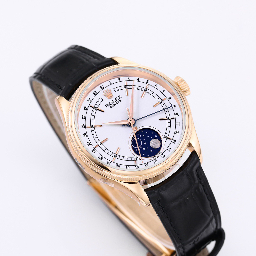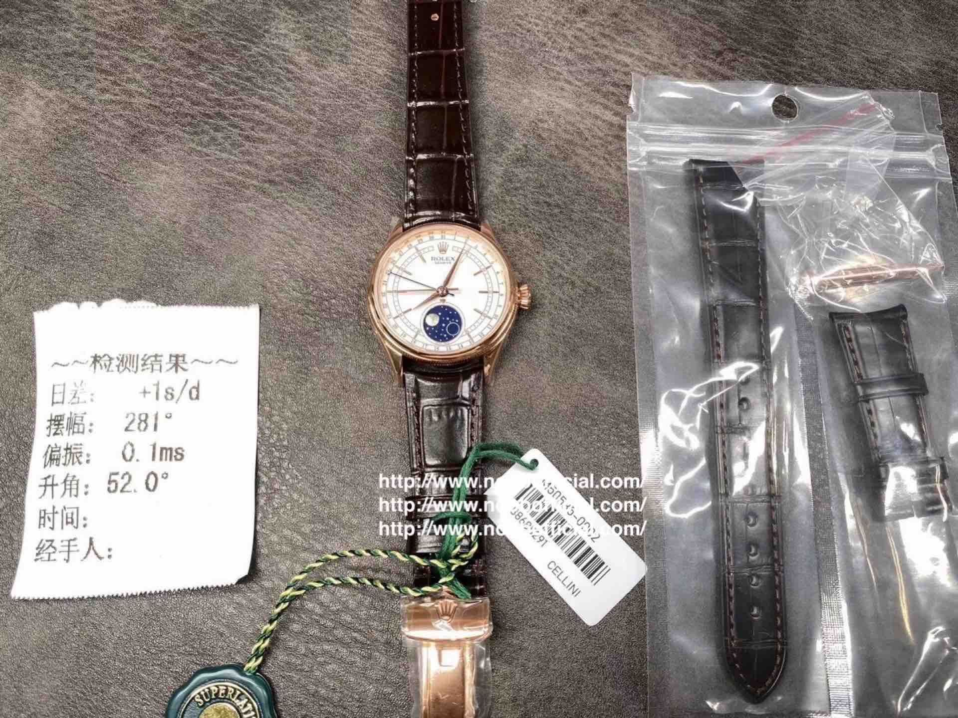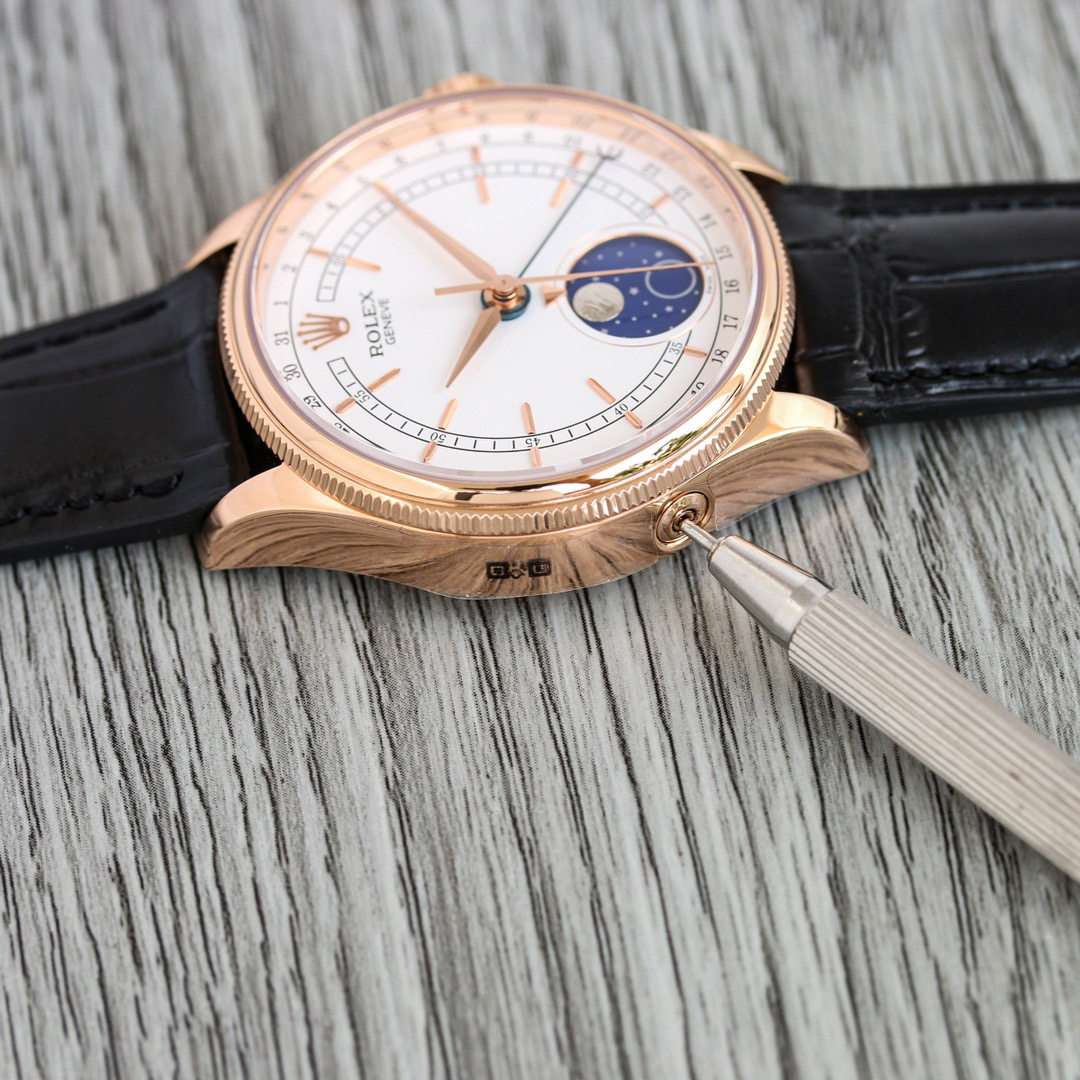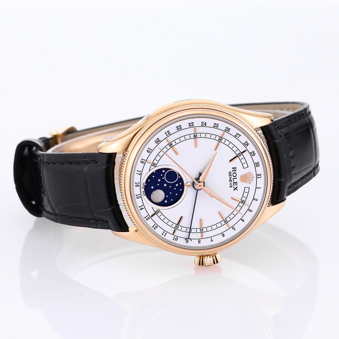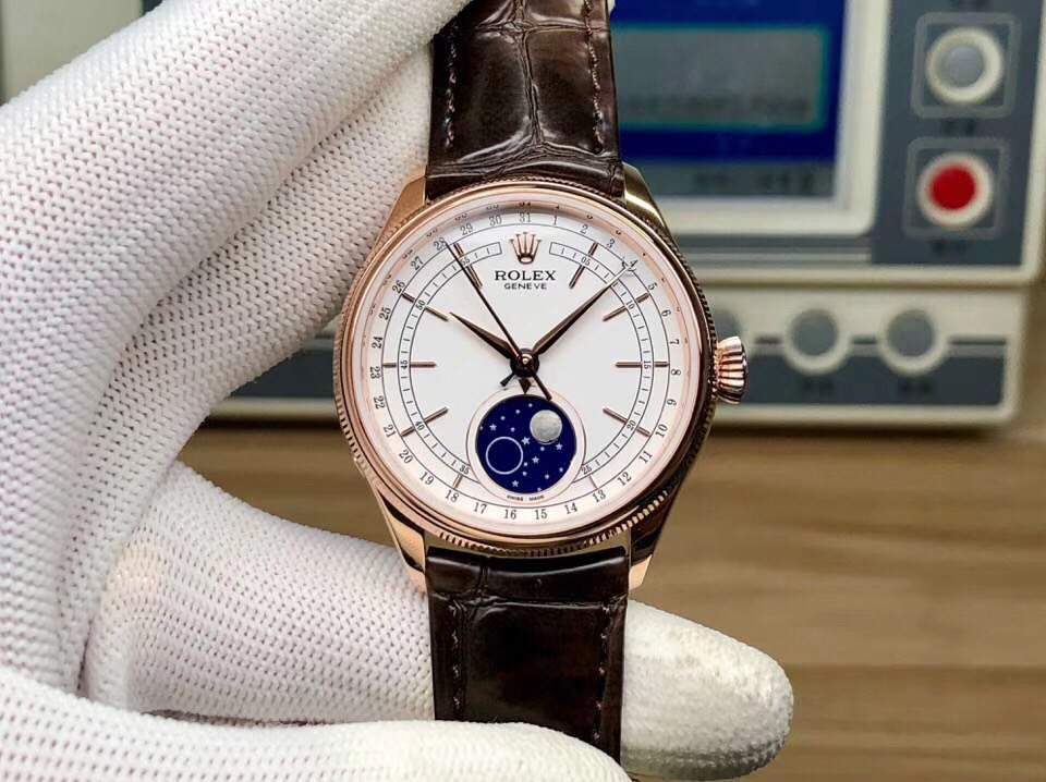 ZZ 劳力士 切利尼系列50535 月相腕表全玫瑰金,红金技术。厚度达到包金一般的标准。独家定制机芯,功能做到和原装一致。可以单独调节时针,来调节日历。8点位有一个按钮,来调节月相。同样,月相上的陨石也为真陨石。