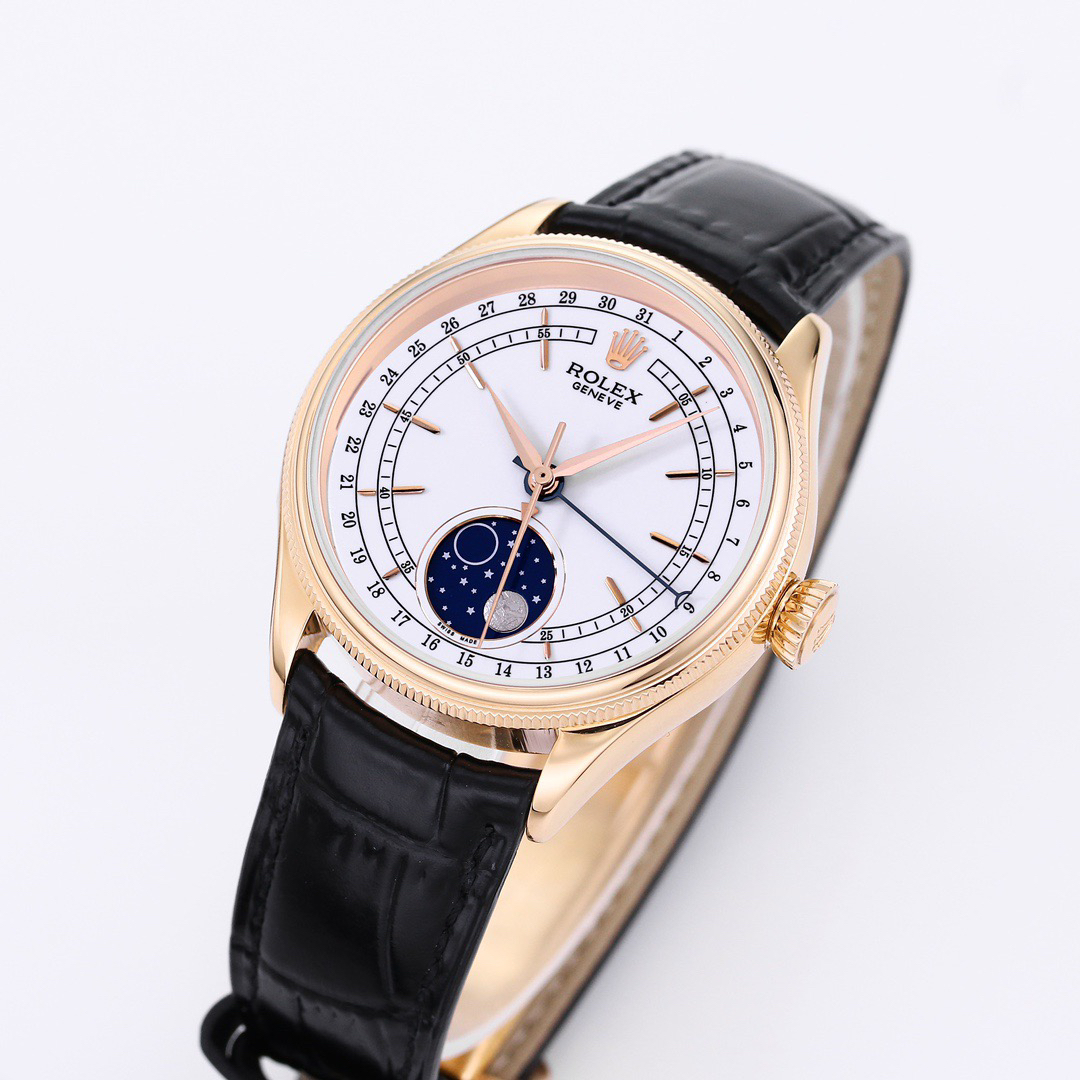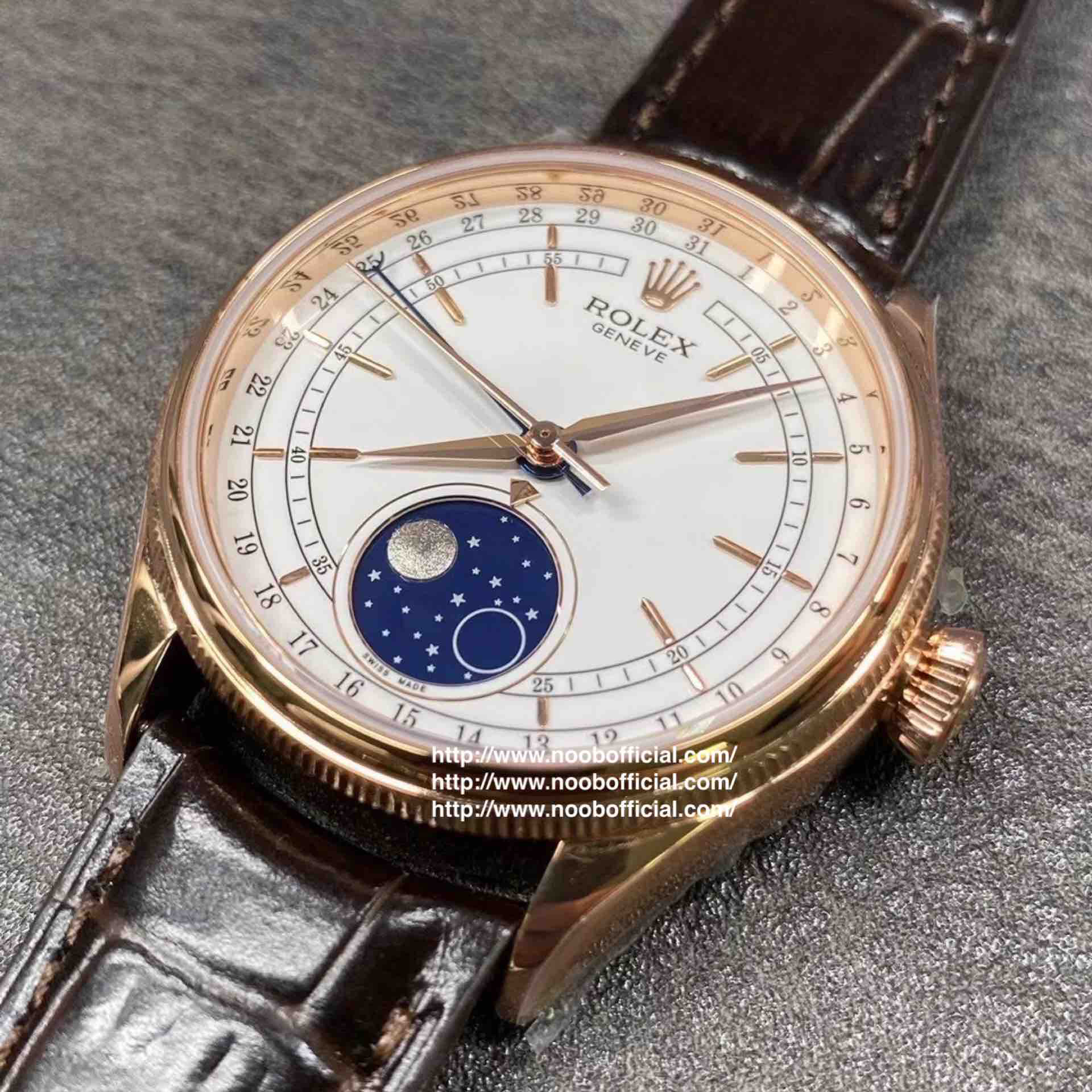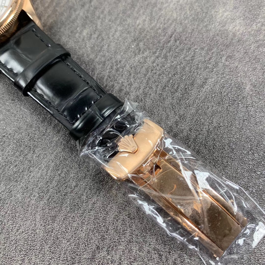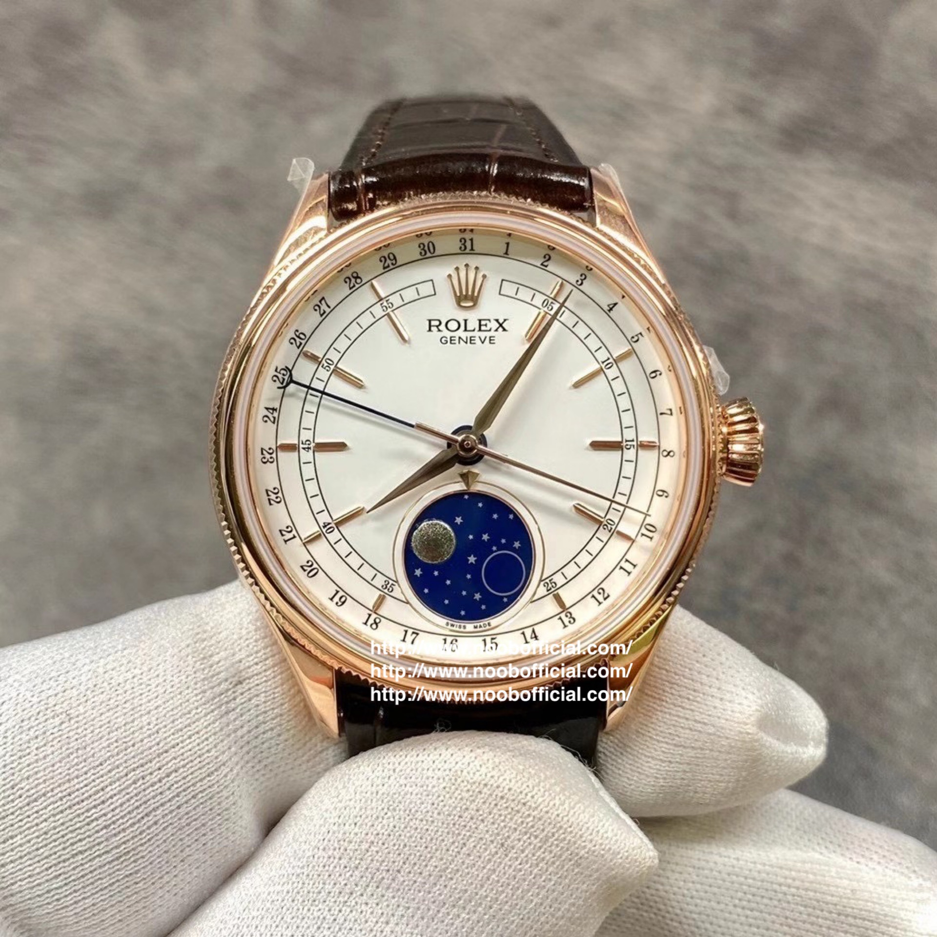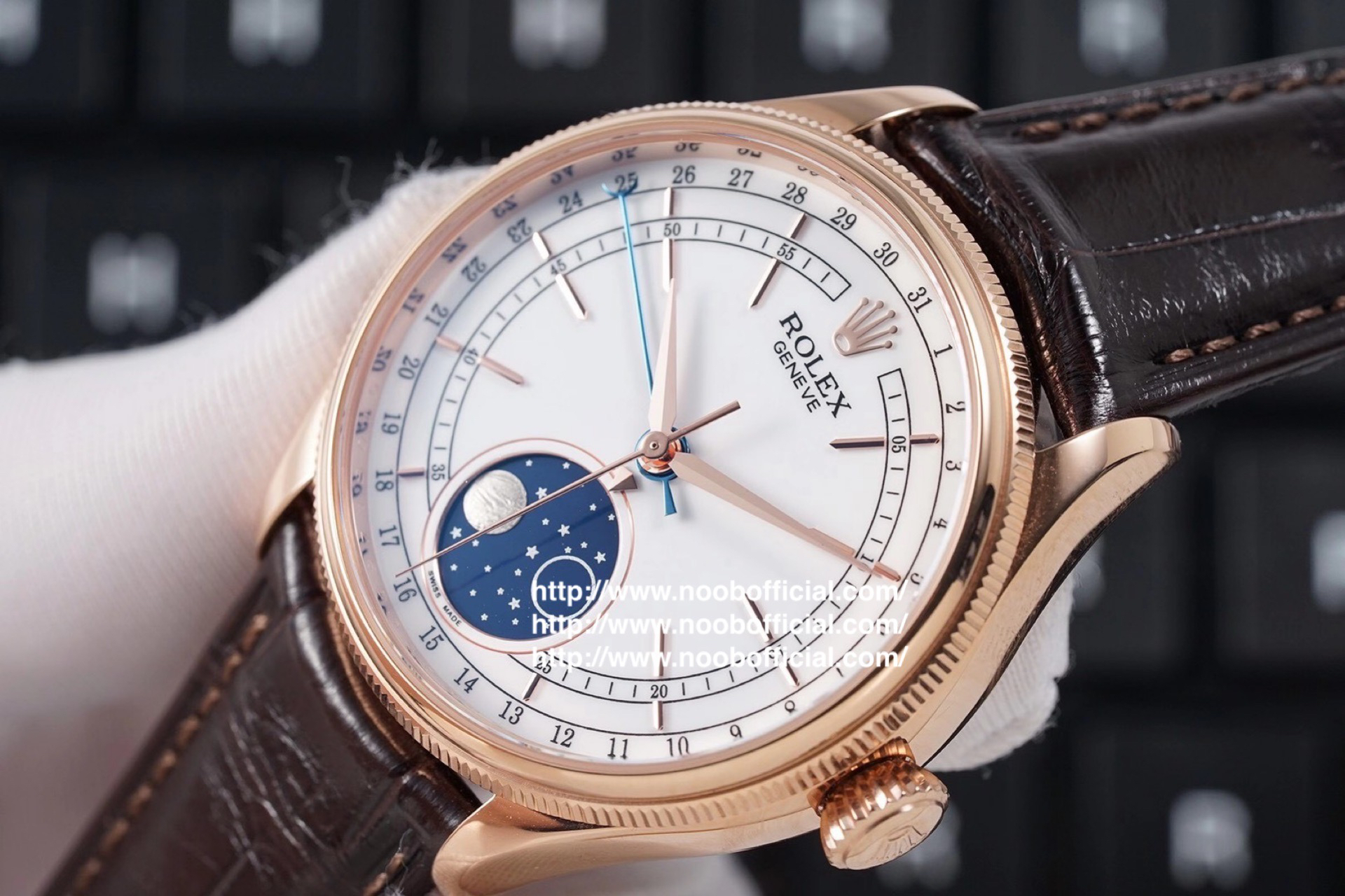 ZZ 劳力士 切利尼系列50535 月相腕表全玫瑰金,红金技术。厚度达到包金一般的标准。独家定制机芯,功能做到和原装一致。可以单独调节时针,来调节日历。8点位有一个按钮,来调节月相。同样,月相上的陨石也为真陨石。