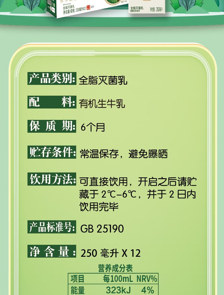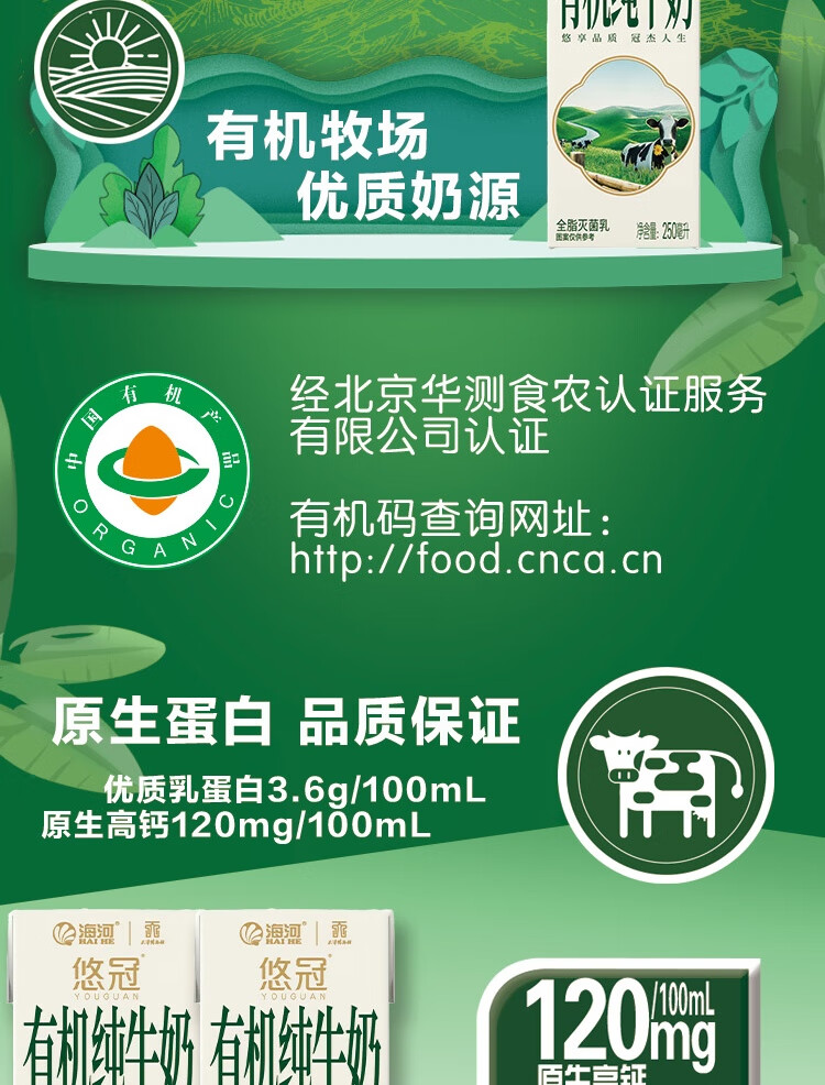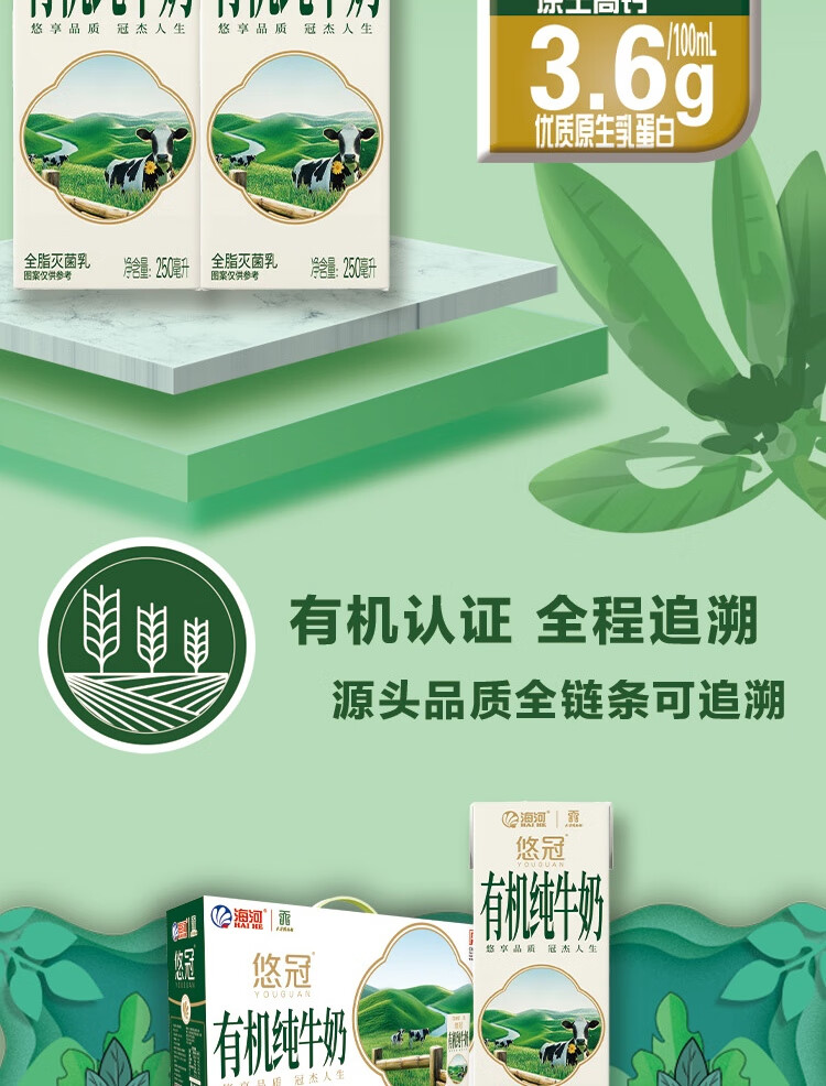 海河无菌砖悠冠有机纯牛奶250ml*12