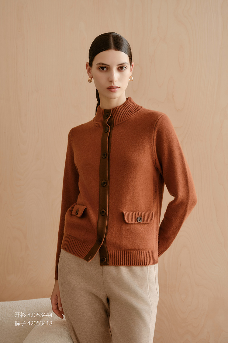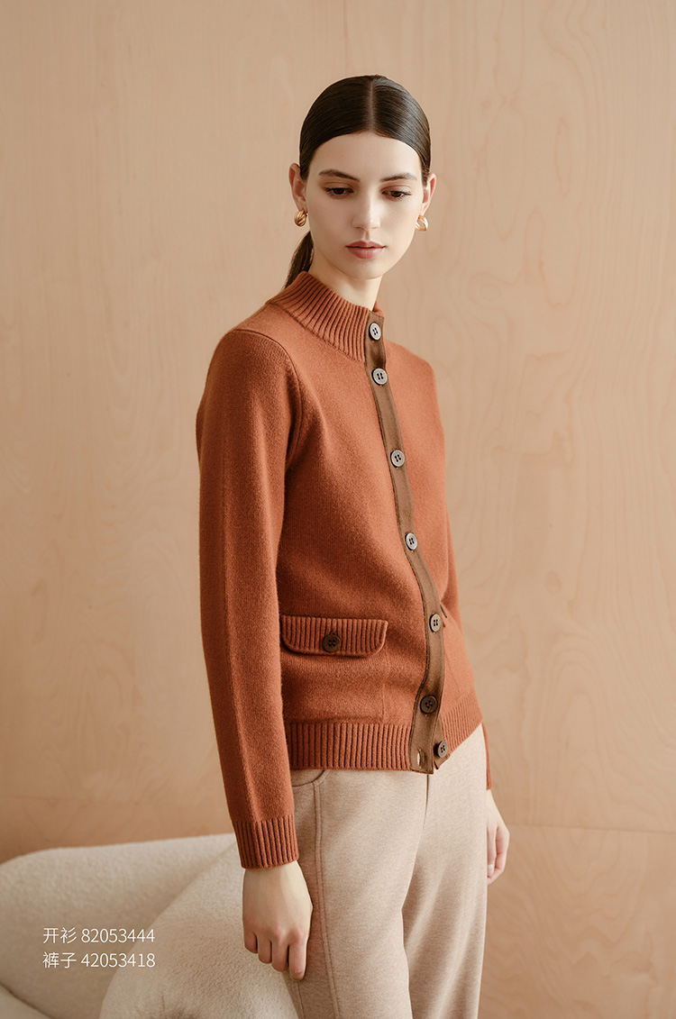 【条纹撞色针织开衫】羊绒世家秋冬新品女士100%山羊绒半高领撞色开衫