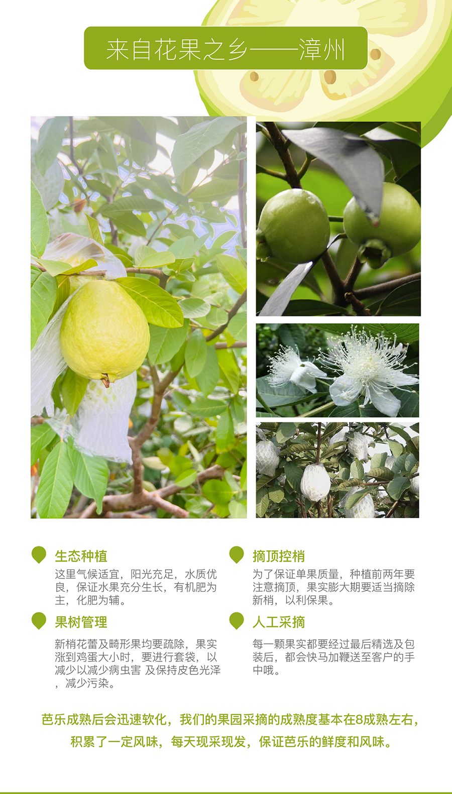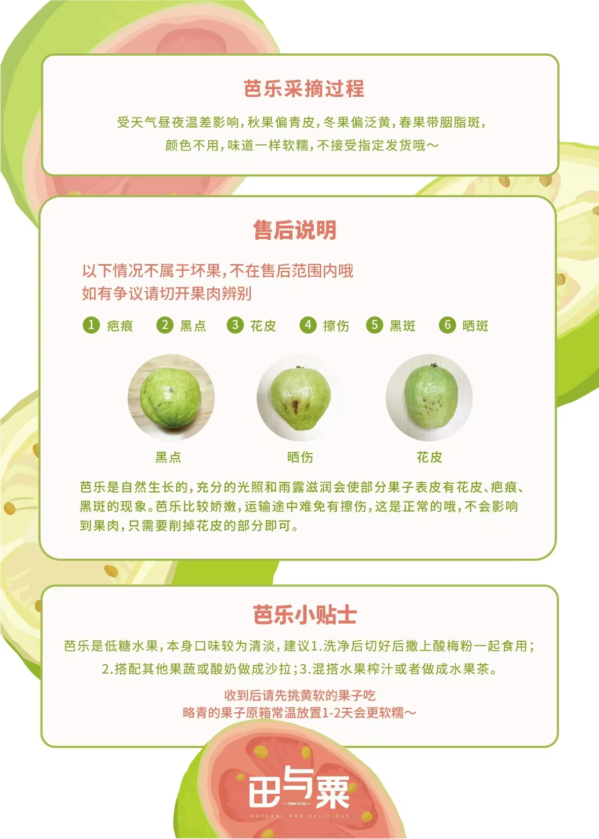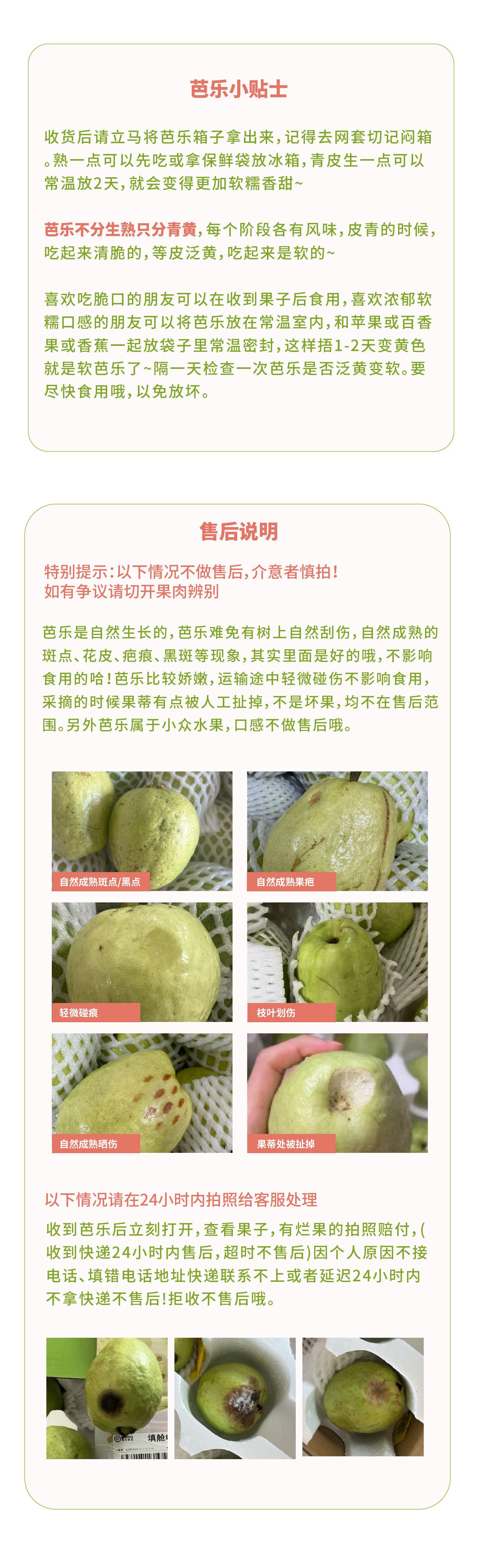 1.为了保证芭乐的鲜度和风味,果子8成熟左右发货。收到后,可以选择表皮发黄、香气浓郁的芭乐先食用或冰箱冷藏;偏青的芭乐可以在常温下放置几天,发黄、软熟后再放入冰箱冷藏。