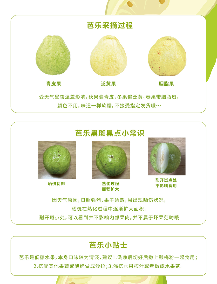 2.芭乐表皮的黑点,是日照强烈而导致的晒斑,并不影响内部果肉,请放心食用。