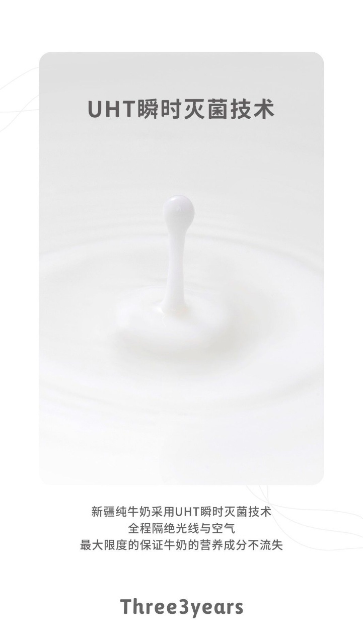 先进的加工技术:三个三年新疆纯牛奶采用UHT瞬时灭菌技术,全程隔绝光线与空气,低于欧盟菌落指数,进口奶菌落数20万,三个三年菌落数2.9万,也最大限度保留了营养成分。