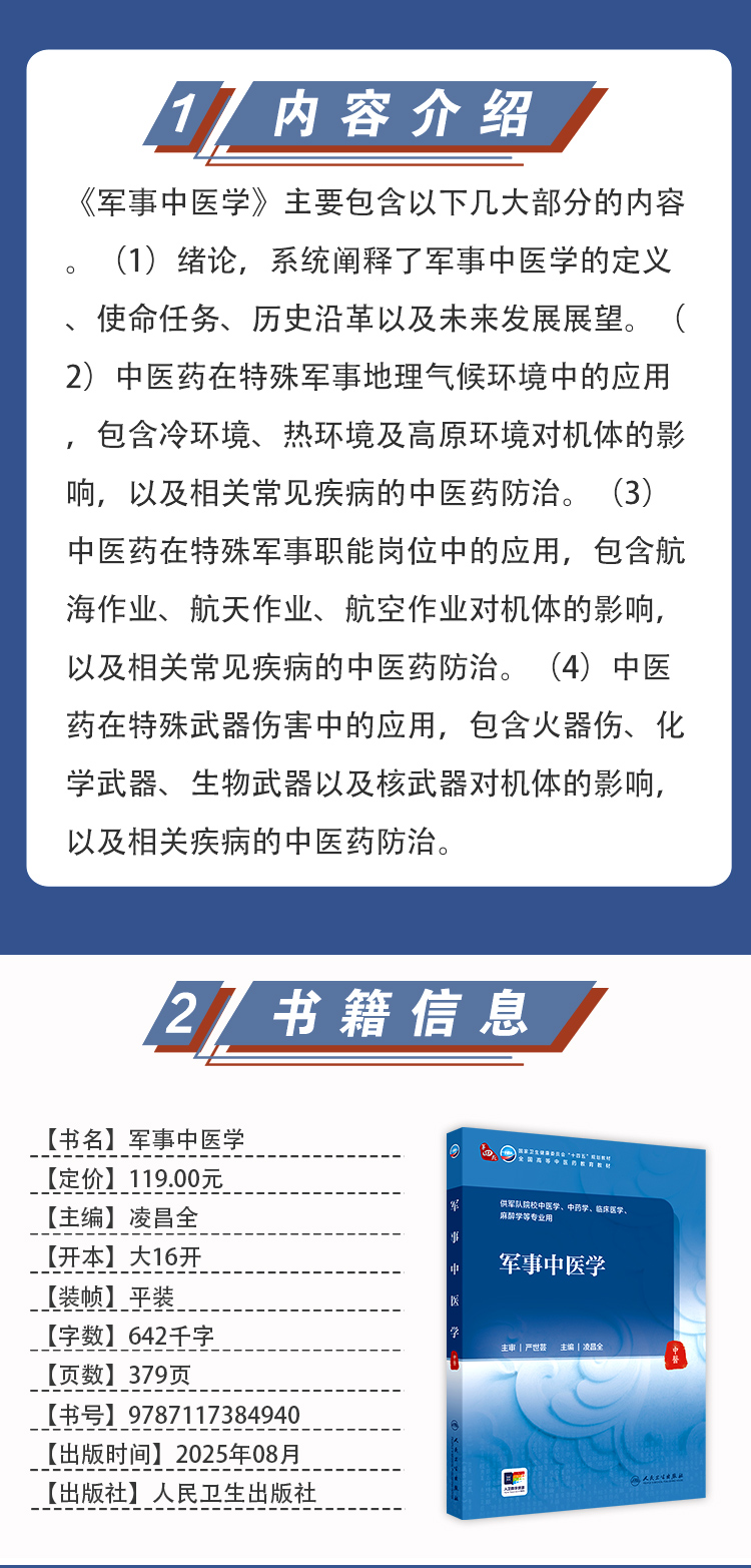 军事中医学 十四五规划教材 全国高等中医药教育教材 凌昌全 主编 供军队院校中医学中药学临床医学麻醉学等专业用 人民卫生出版社