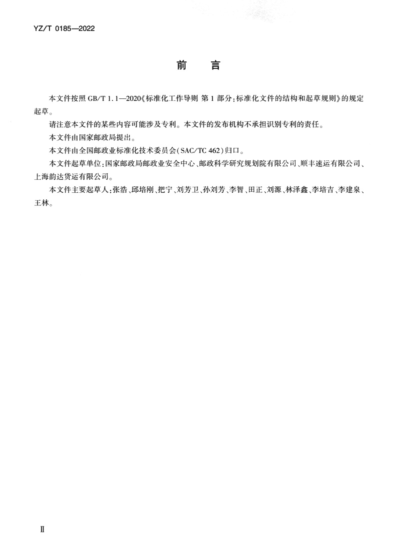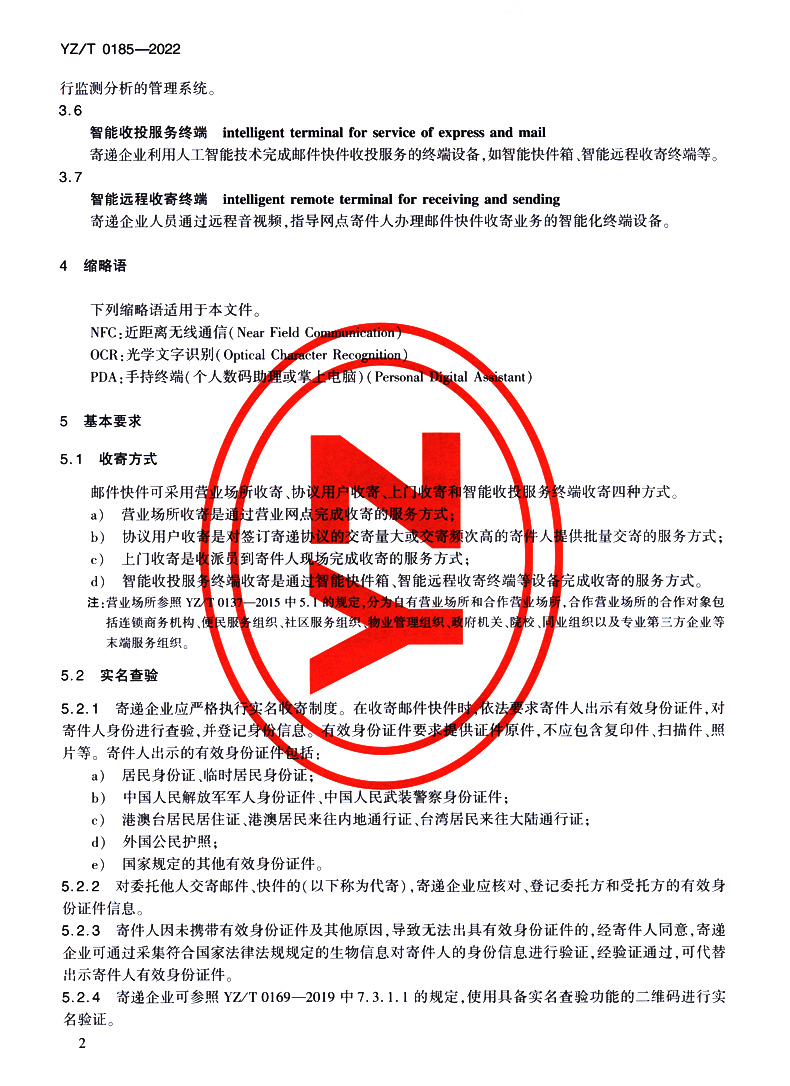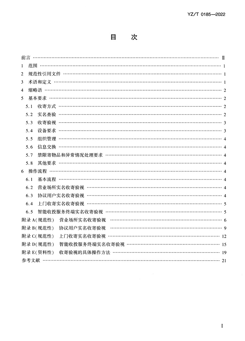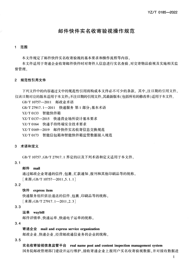 邮件快件实名收寄验视操作规范(YZ/T 0185—2022)
