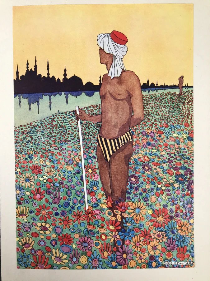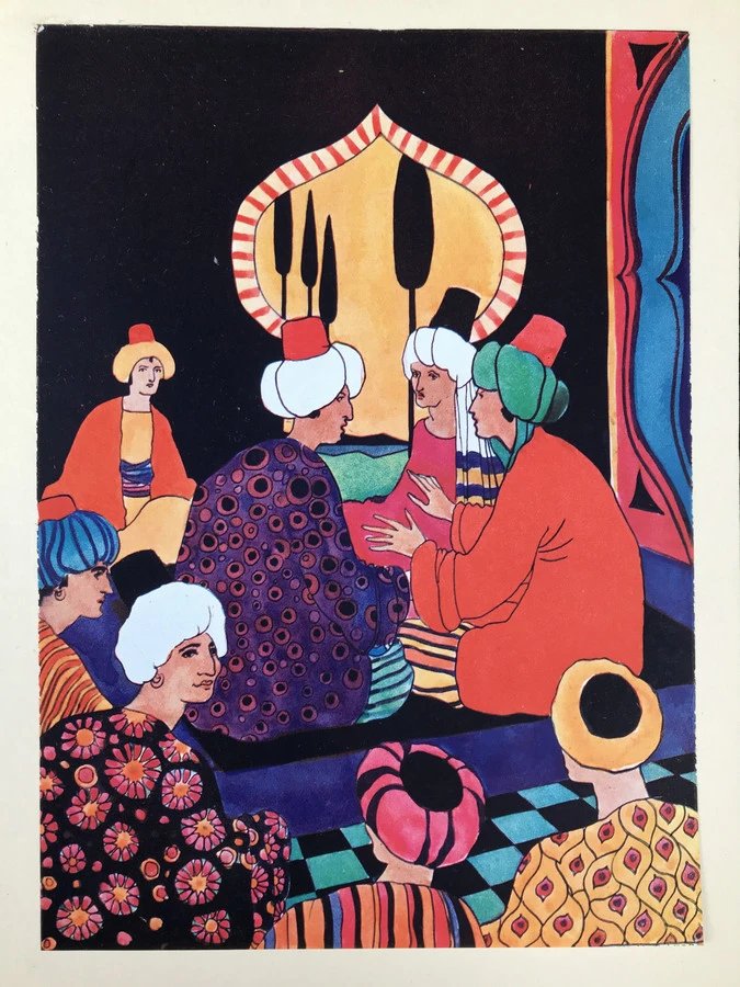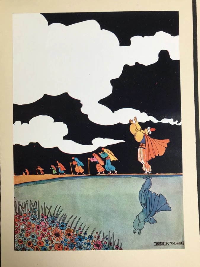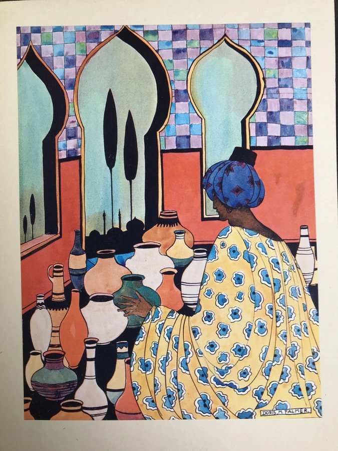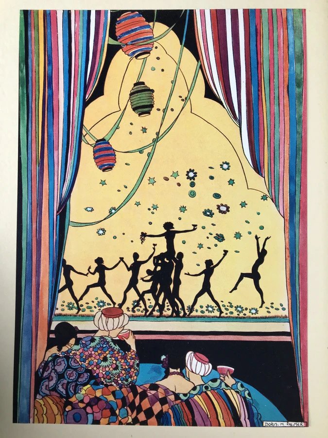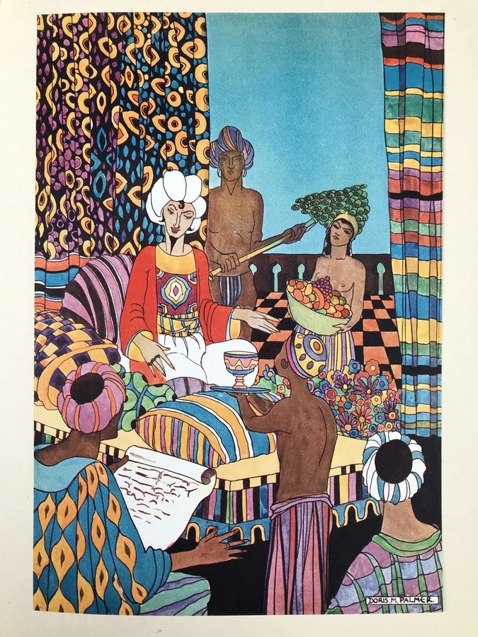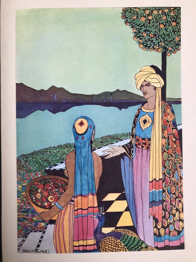 多丽丝·帕尔默的彩色插图为最受欢迎的《鲁拜集》插图版本之一,她的作品充满装饰艺术(Art Deco)风格,构图独特、色彩鲜艳、笔触精致、形象生动,被誉为“美丽而优雅”。