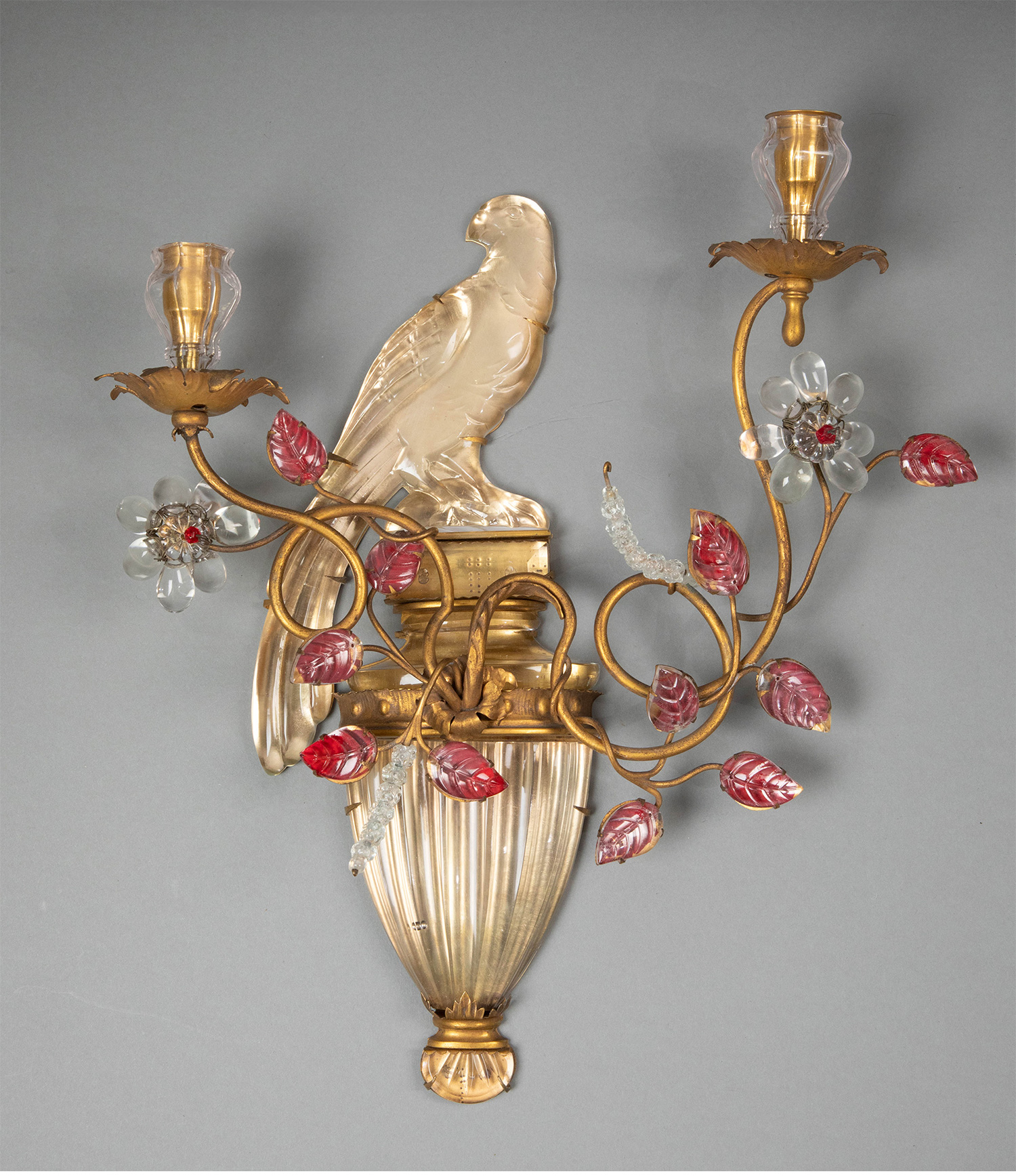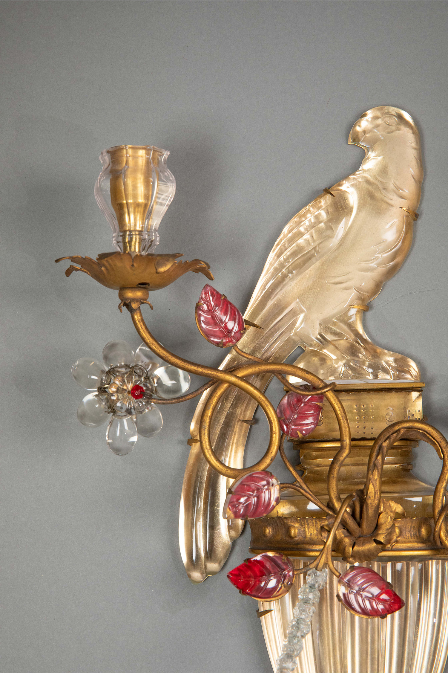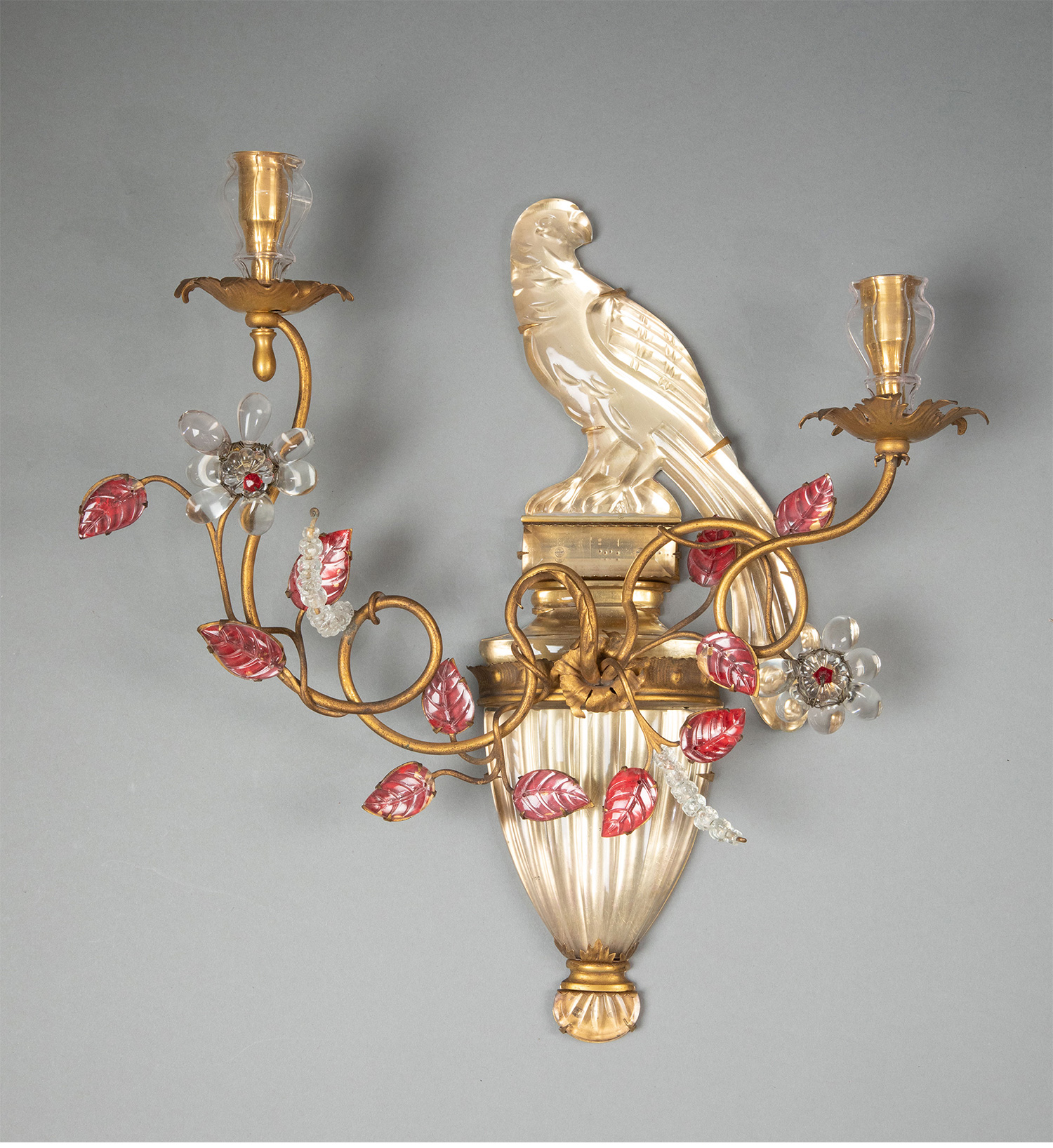 20世纪法国著名灯具工坊Maison Baguès出品鹦鹉与叶蔓主题铜鎏金精雕装饰多色水晶壁挂烛台/壁灯一对