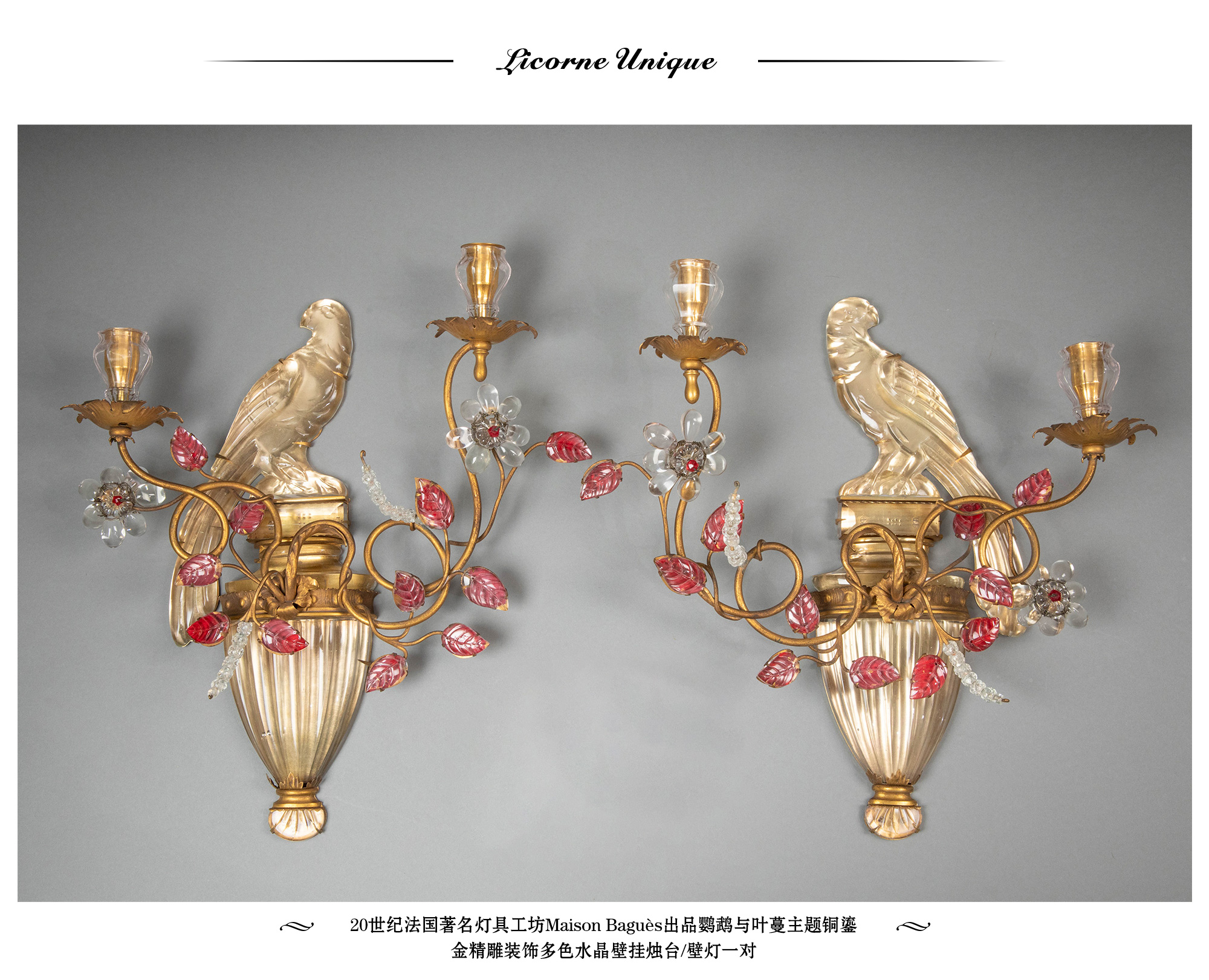 独角鹿西洋古董20世纪法国著名灯具工坊Maison Baguès出品鹦鹉与叶蔓主题铜鎏金精雕装饰多色水晶壁挂烛台/壁灯一对