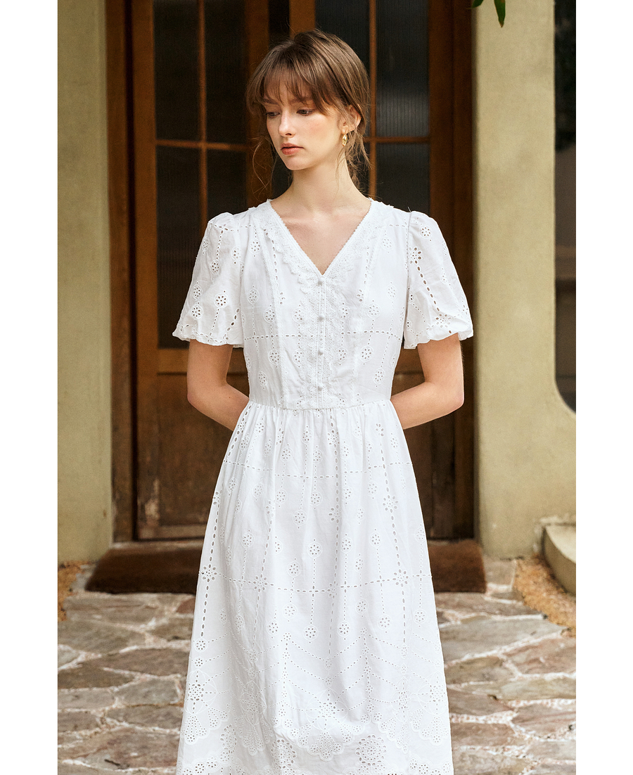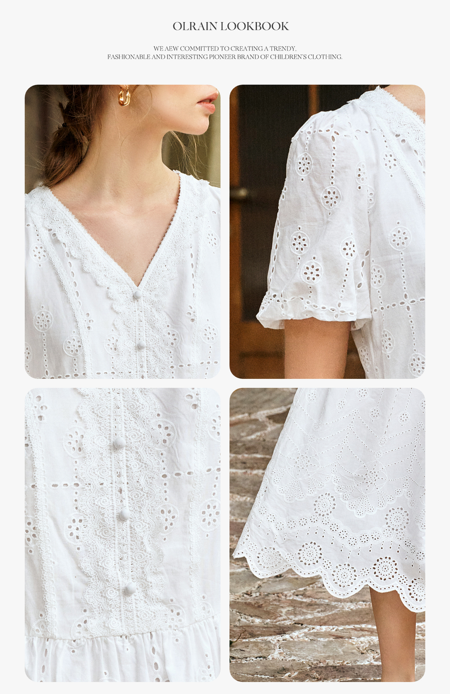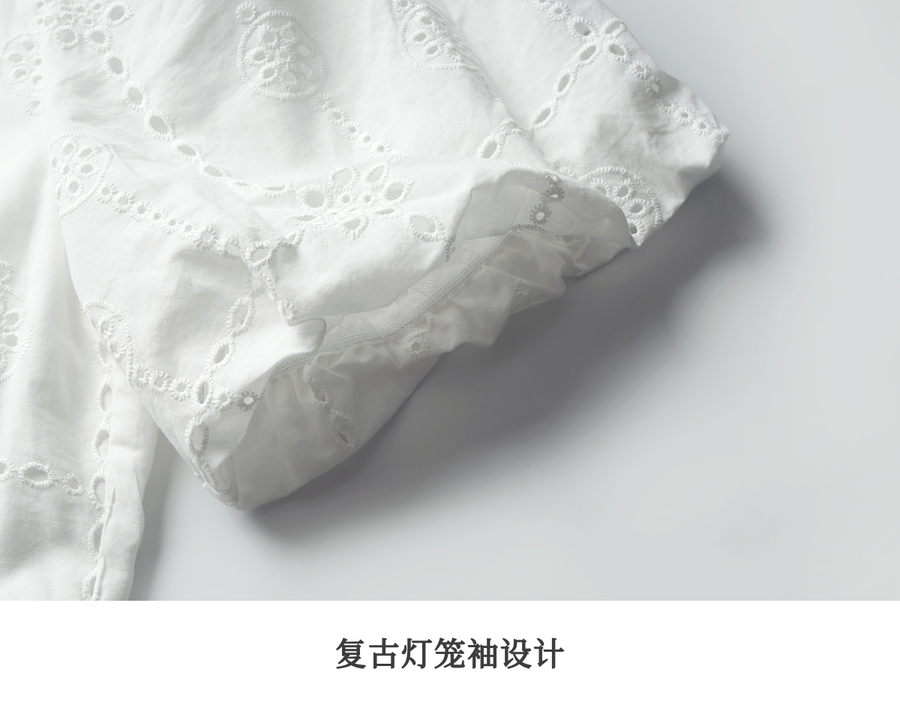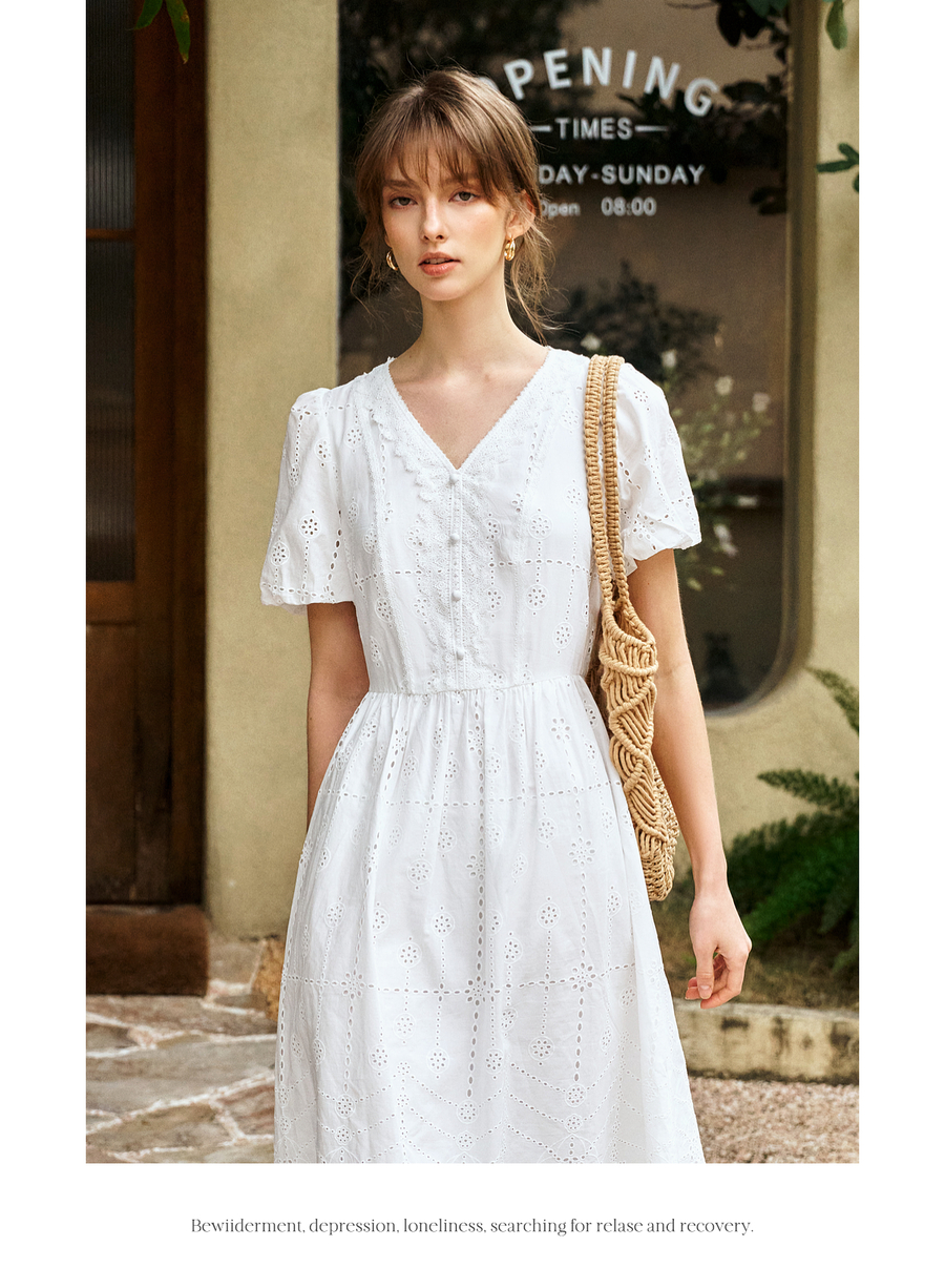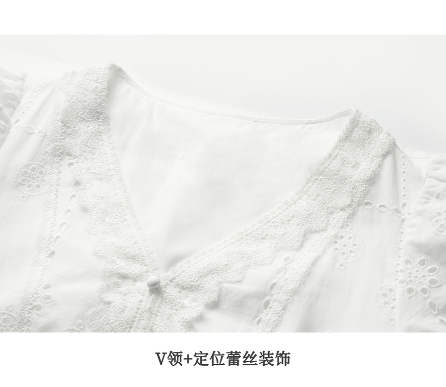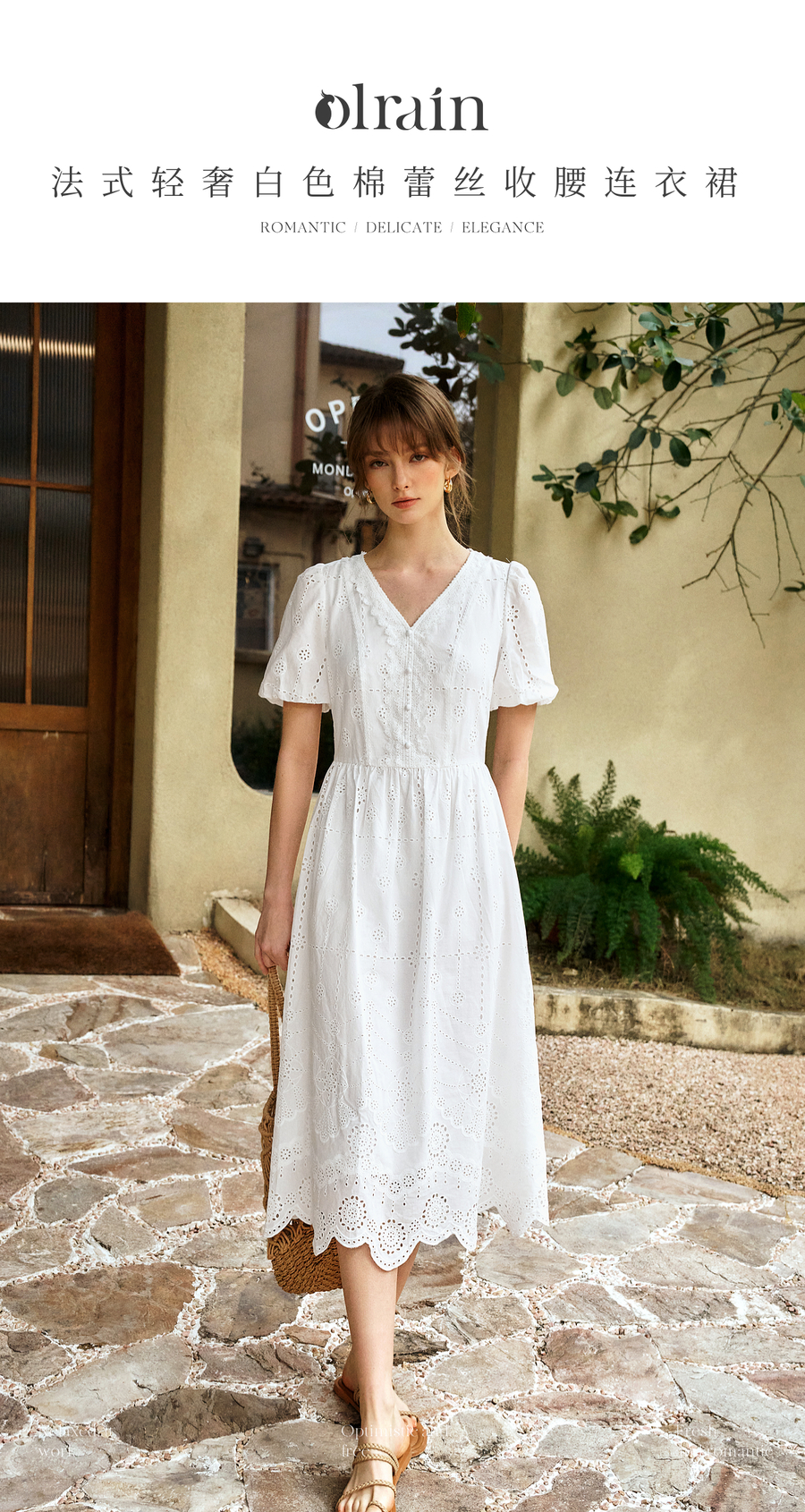 Olrain欧芮儿2025夏季法式棉蕾丝短袖V领复古灯笼袖设计连衣裙