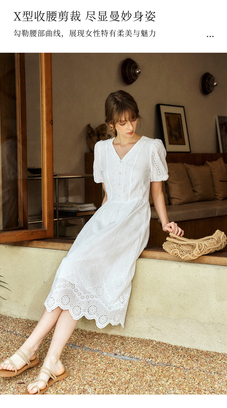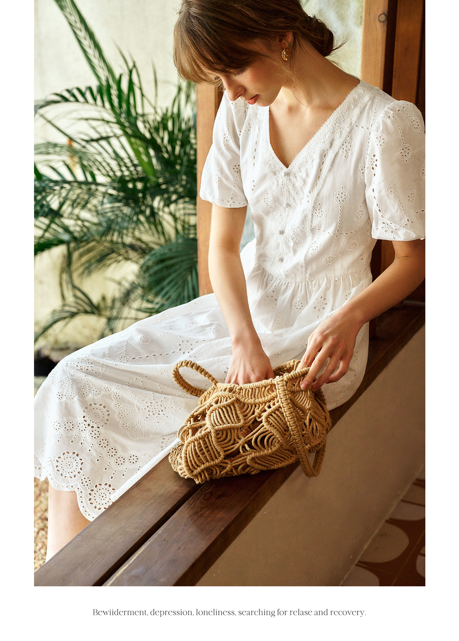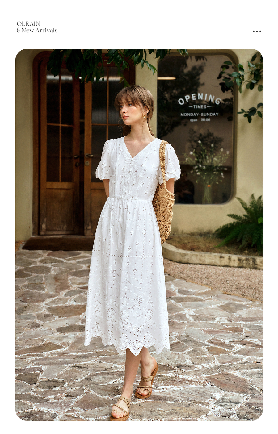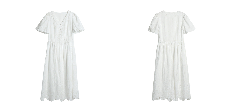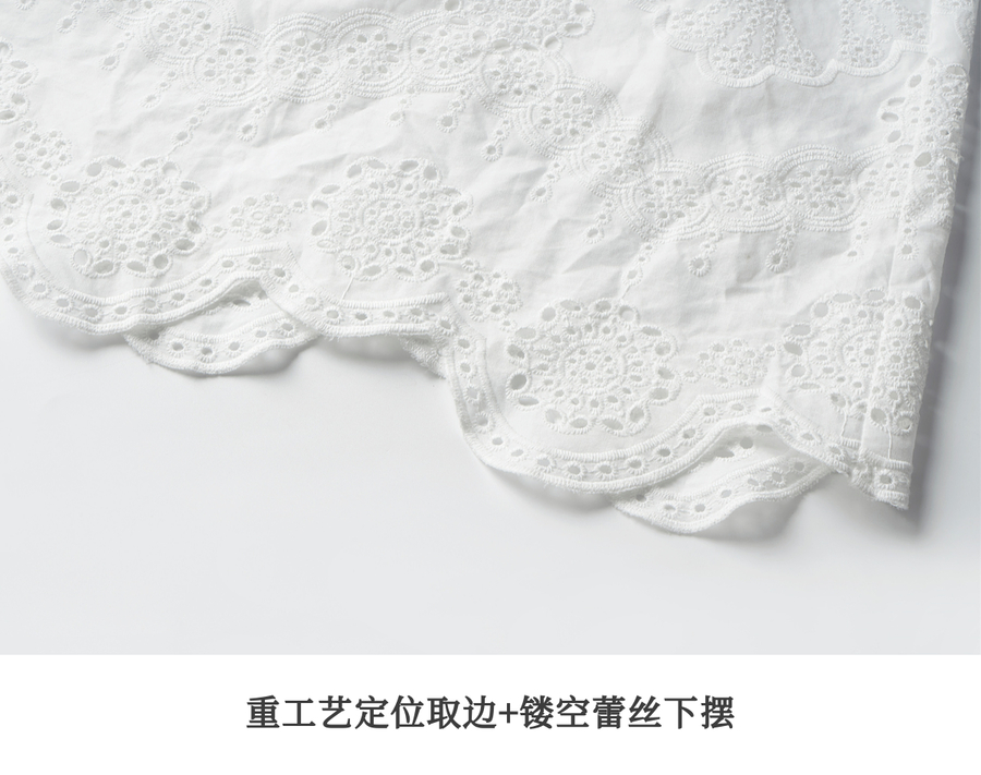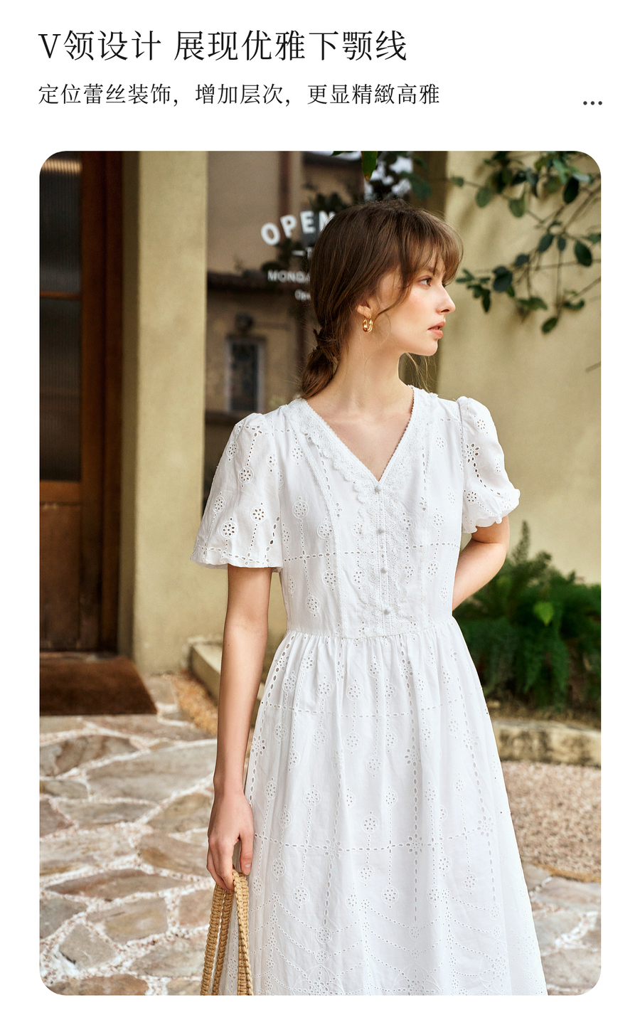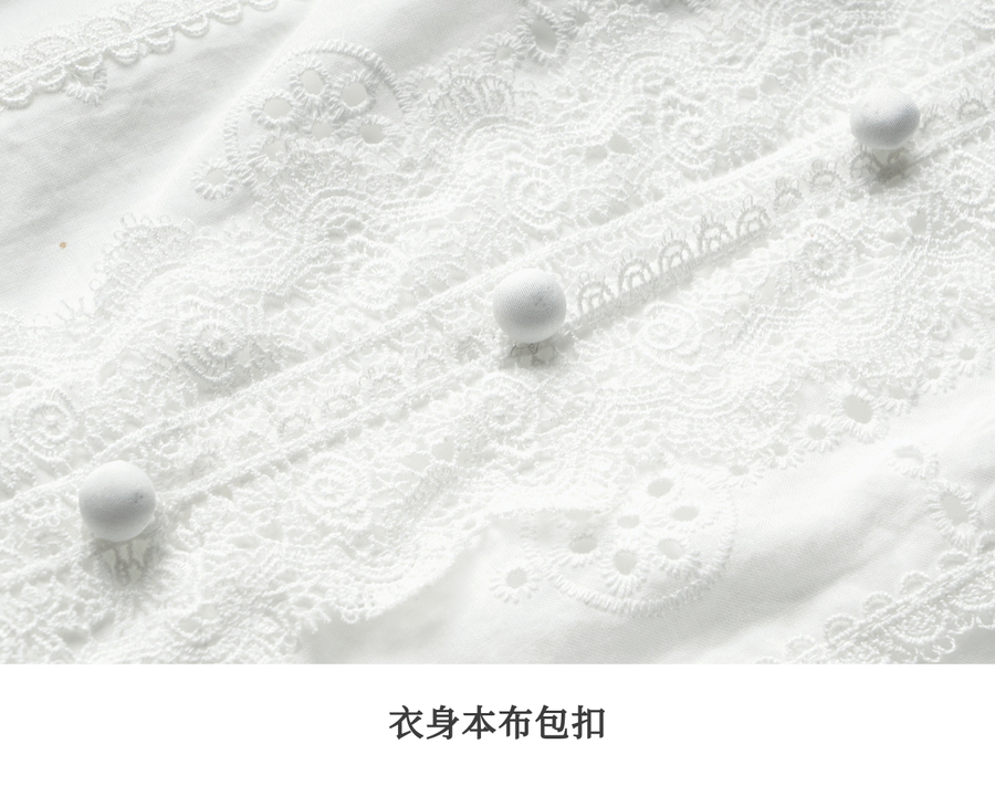 Olrain欧芮儿2025夏季法式棉蕾丝短袖V领复古灯笼袖设计连衣裙