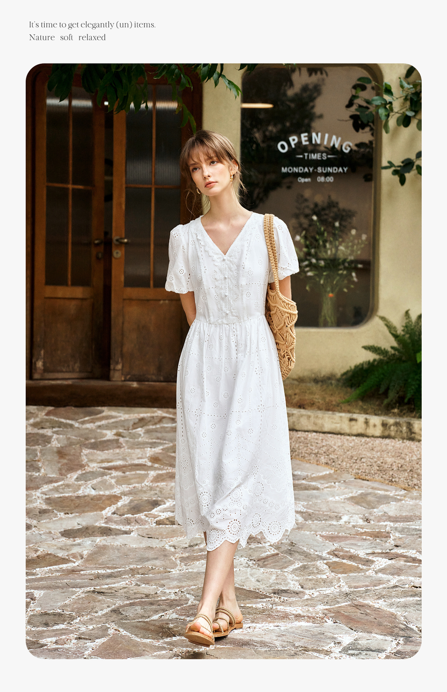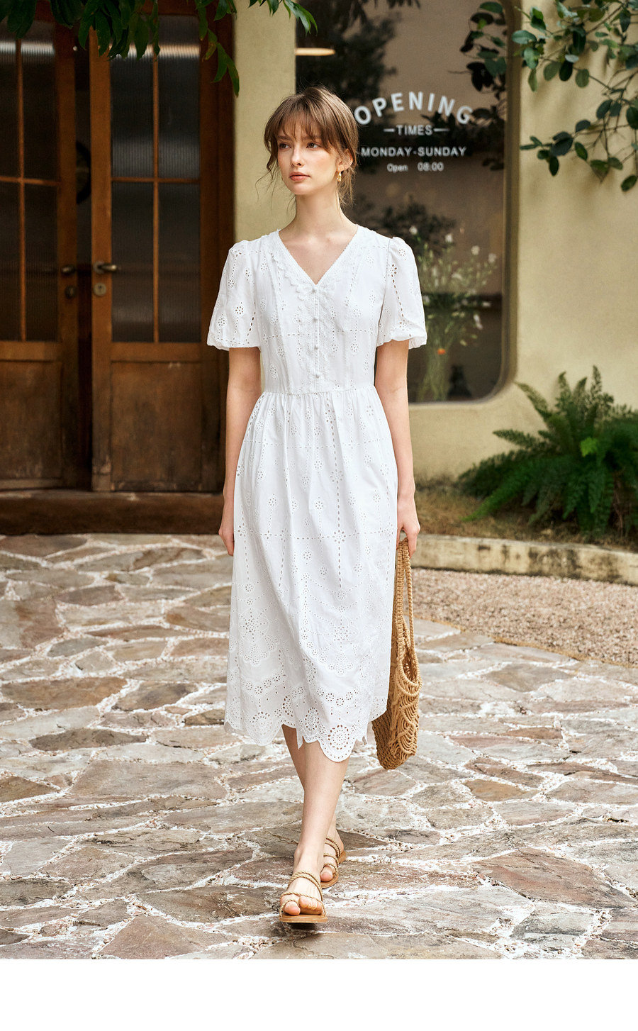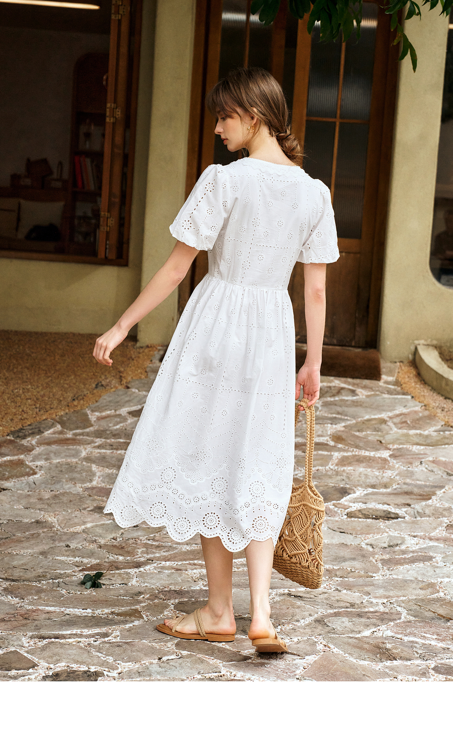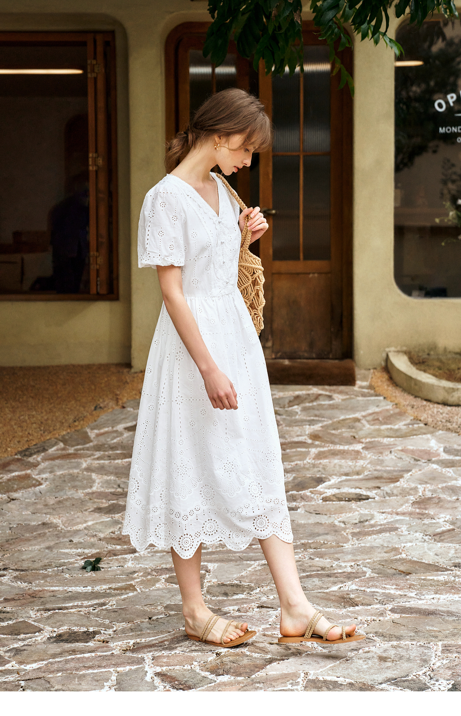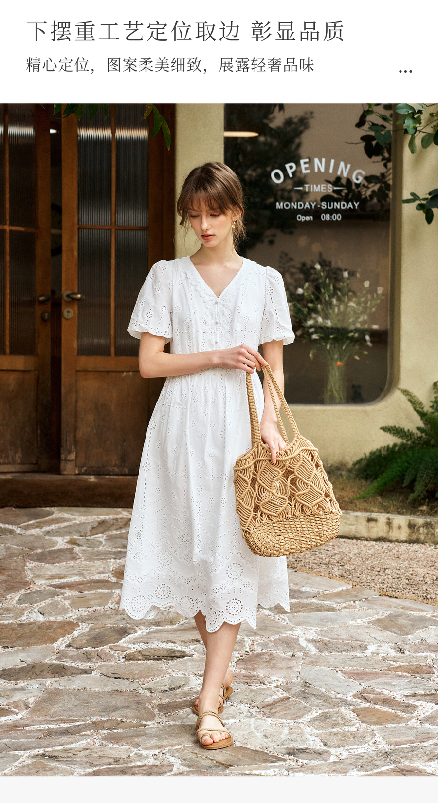 Olrain欧芮儿2025夏季法式棉蕾丝短袖V领复古灯笼袖设计连衣裙