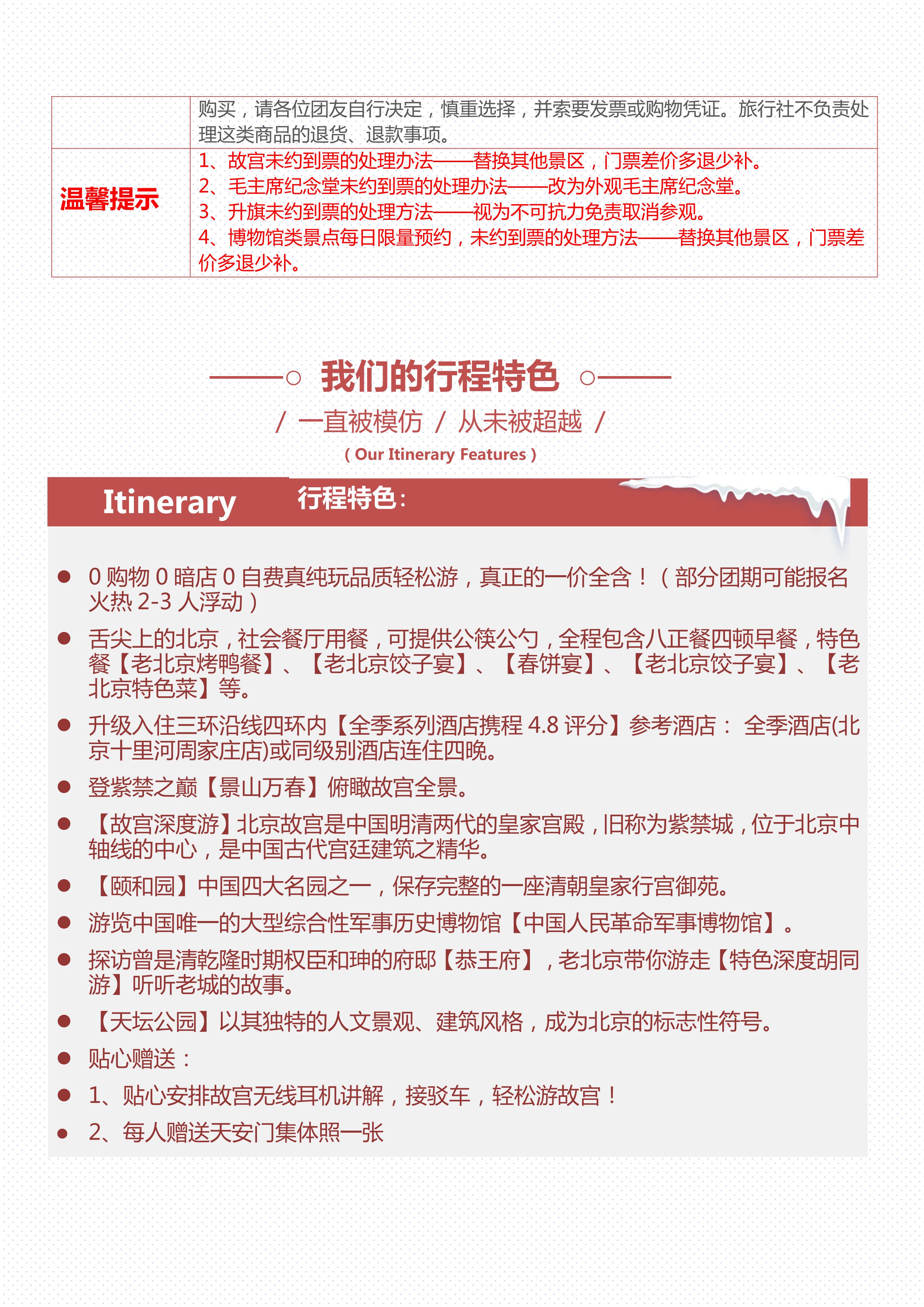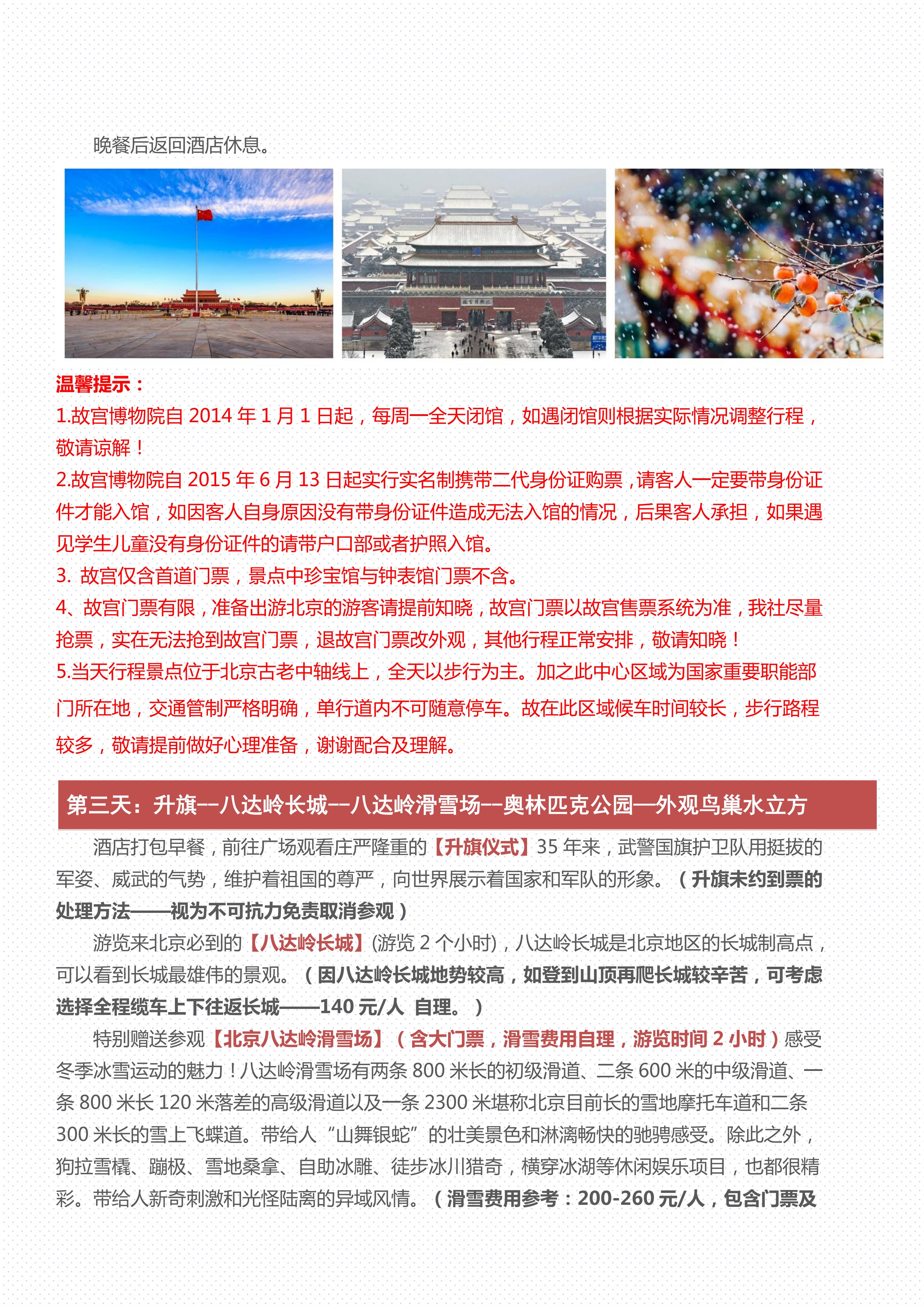 【元旦、圣诞】<北京5天双飞20人精品小团>天坛、前门大街、天安门广场、故宫、景山公园、升旗仪式、八达岭长城、北京八达岭滑雪场、奥林匹克公园、军事博物馆、恭王府、什刹海、颐和园、圆明园