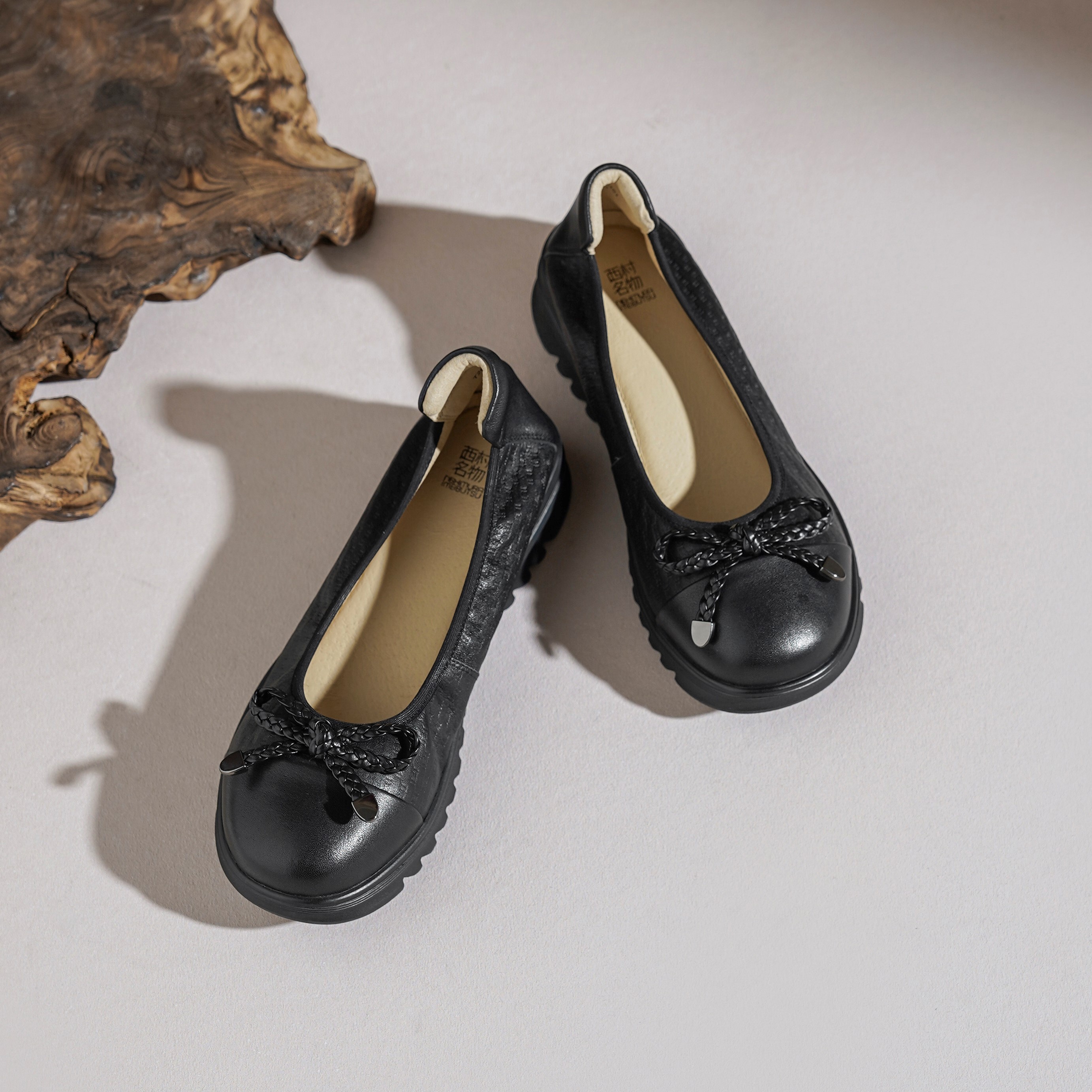 【牛皮革】西村名物2026年春季新款舒适平底软底软面蝴蝶结饰扣浅口单鞋妈妈鞋T26AE18151