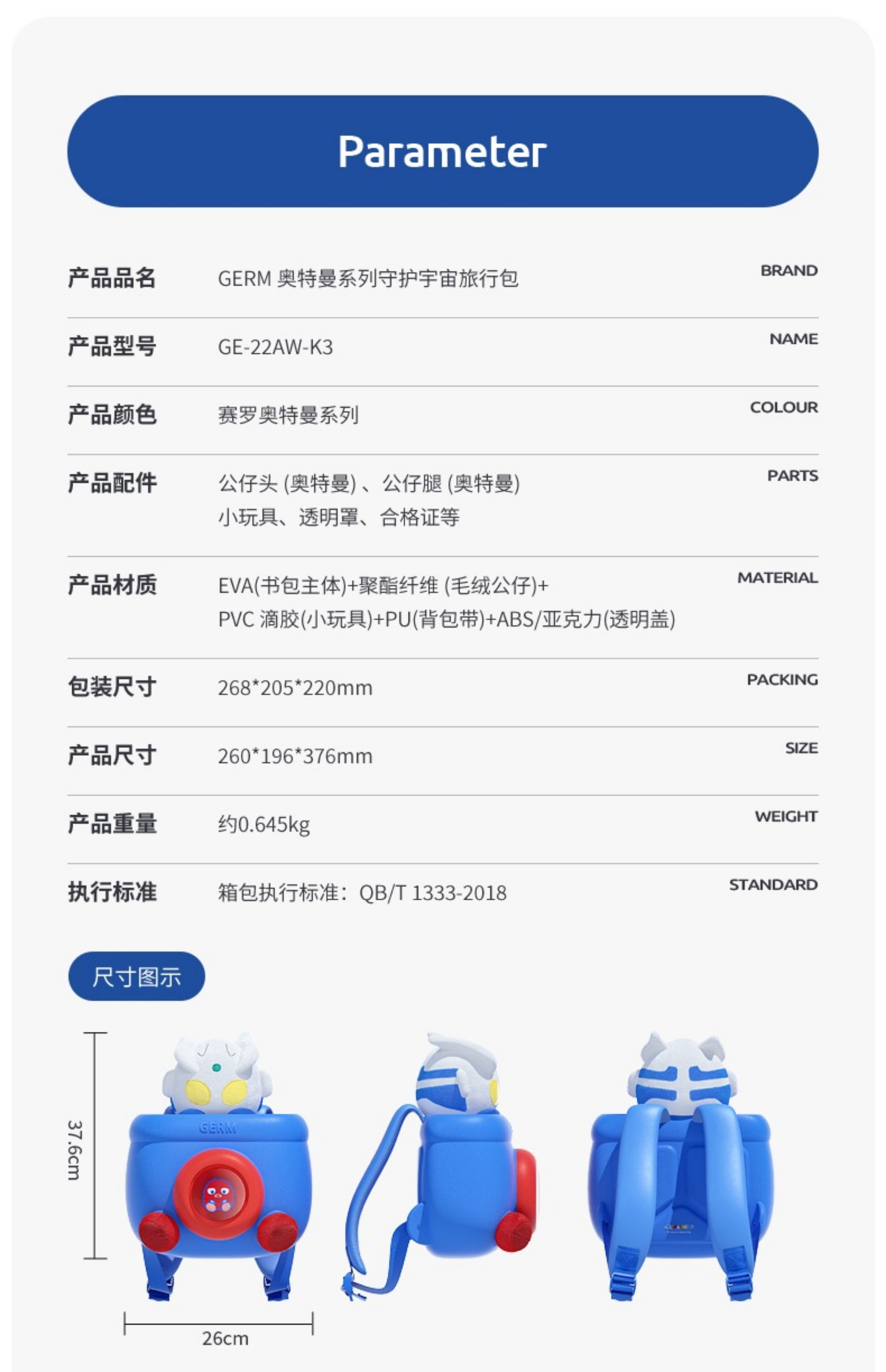 GERM奥特曼儿童背包幼儿园双肩包旅行包 AY