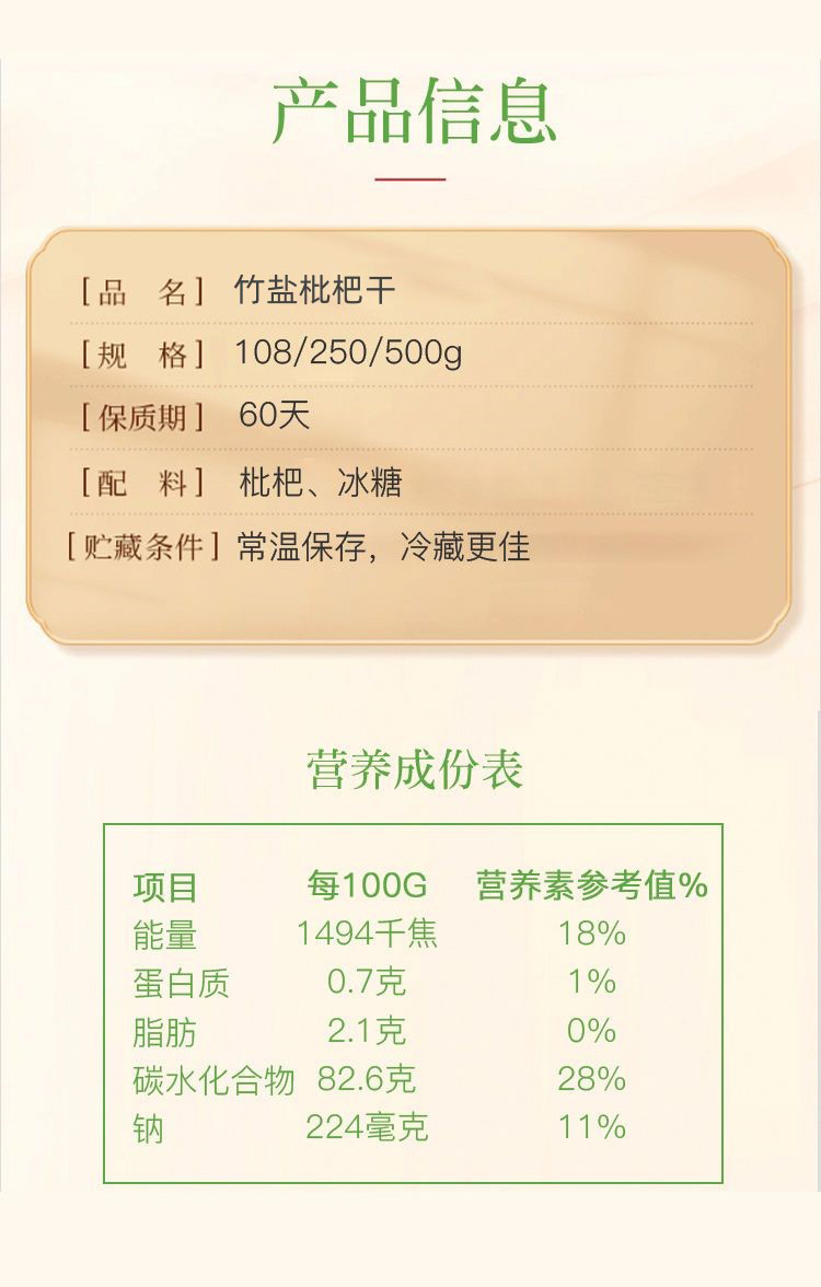 【品名】川知贝 竹盐枇杷干 咽喉伴侣 鲜果烘干 3袋/6袋 【规格】100g/袋 【产地】国内 【保质期】6个月 【发货包装】独立包装盒 【发货地】福建 【发货快递】极兔,中通 【不发货区域】新疆,西藏,港澳台 【补邮费地区】深圳+0.3元,黑吉辽,北京上海,海南+0.5元,内蒙古,甘肃,青海,宁夏+3.7元 【发货时效】48-72小时,周末节假日顺延 |