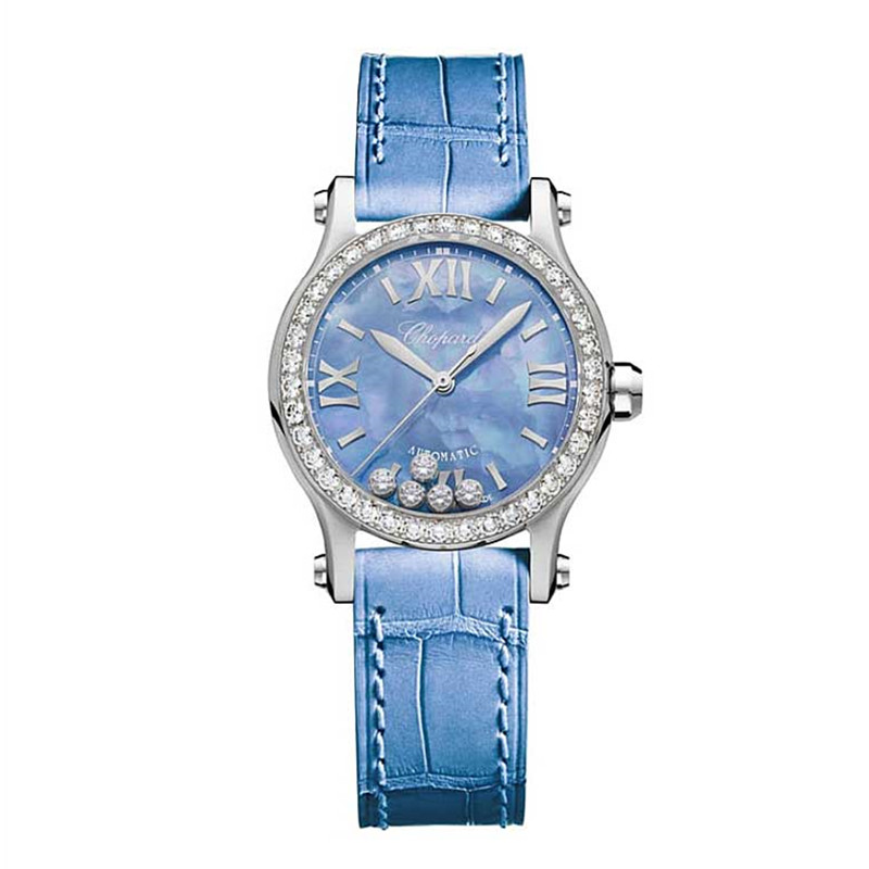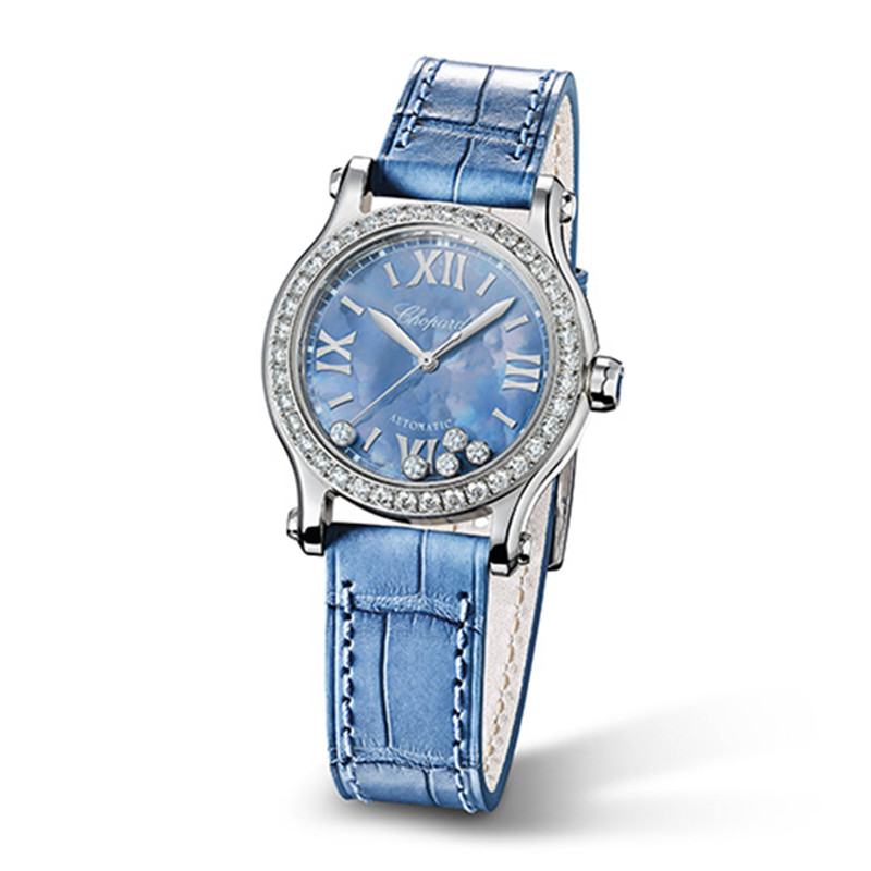镜面材质 | 蓝宝石水晶玻璃 | 表盘 | 精钢镶钻表壳 镶钻表圈 薰衣草蓝色珍珠母贝表盘,白色移印元件,5颗旋动钻石,镀铑罗马数字和时标,镀铑锥形时针和分针,镀铑中央秒针 背透,开放式表底盖通过螺丝固定,带有Happy Sport标志和防眩光蓝宝石水晶镜面 |