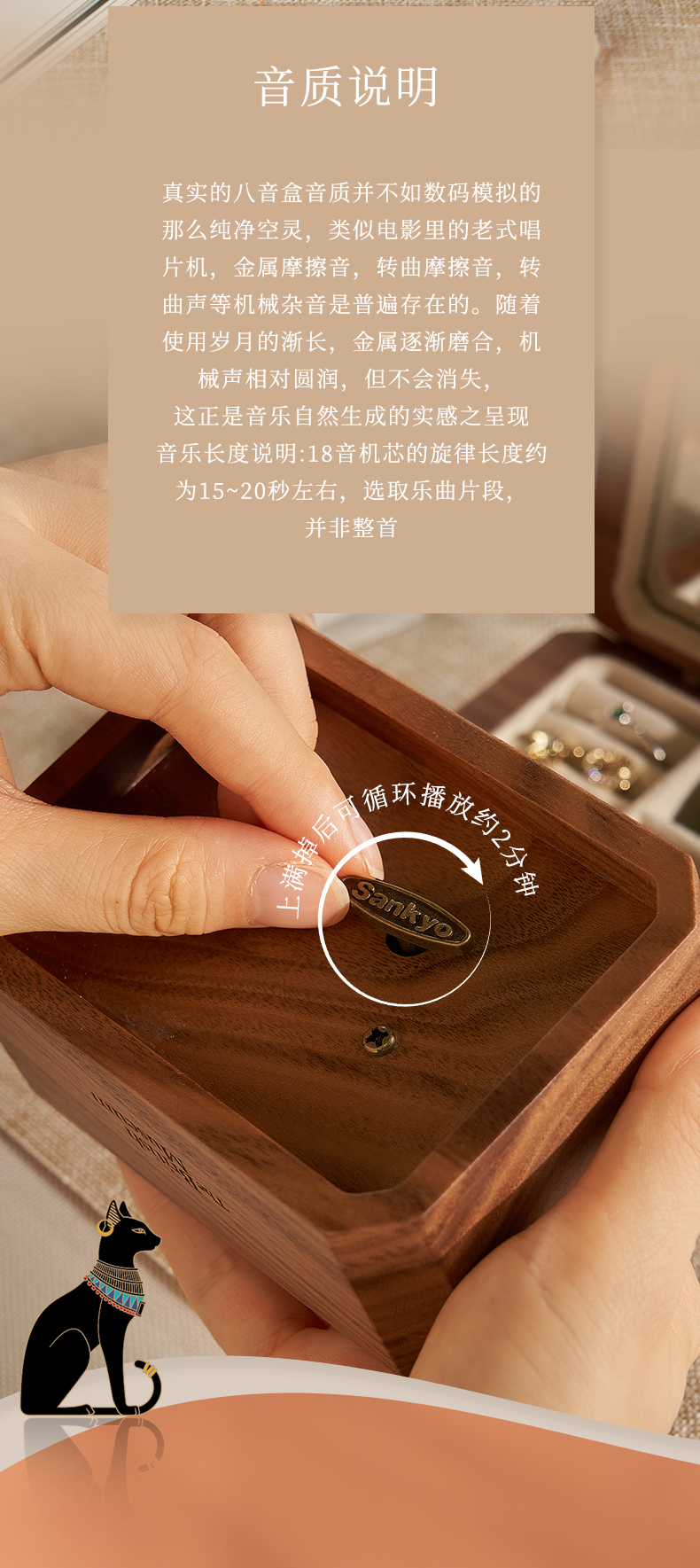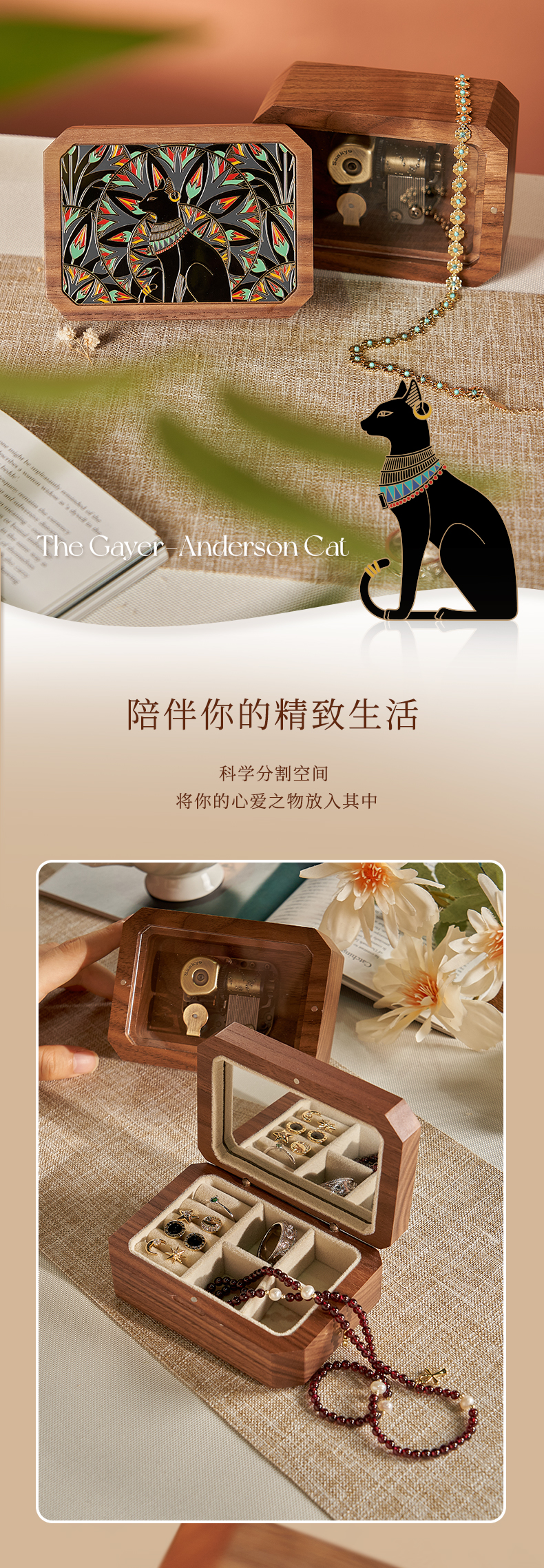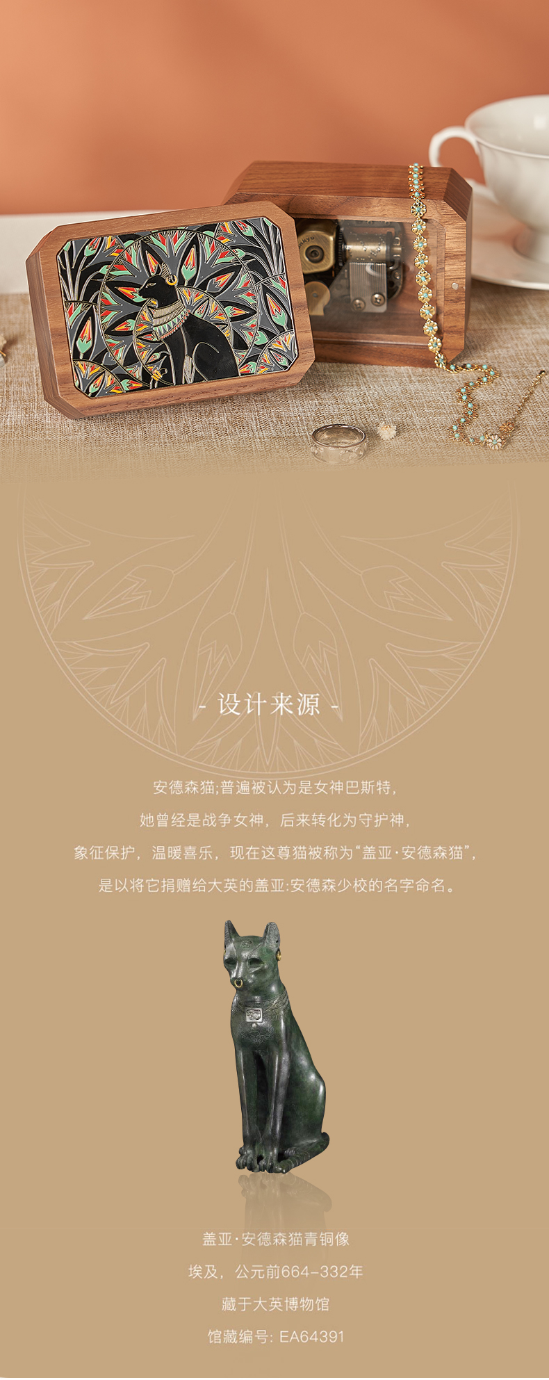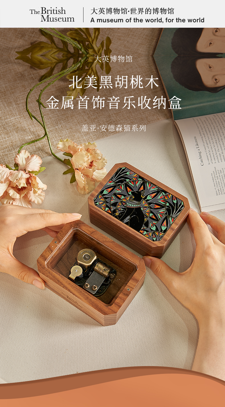 大英博物馆 盖亚·安德森猫系列 北美黑胡桃木金属首饰音乐收纳盒