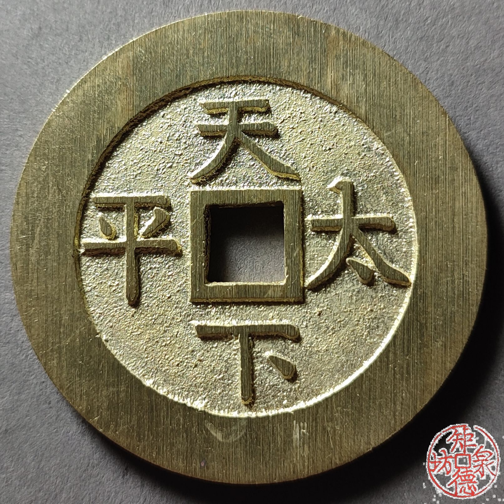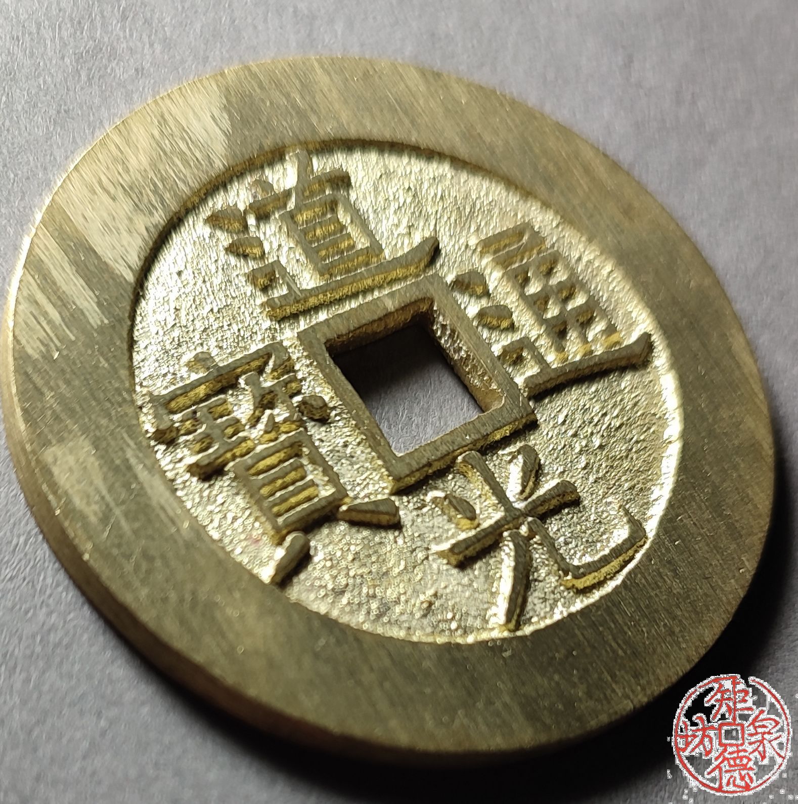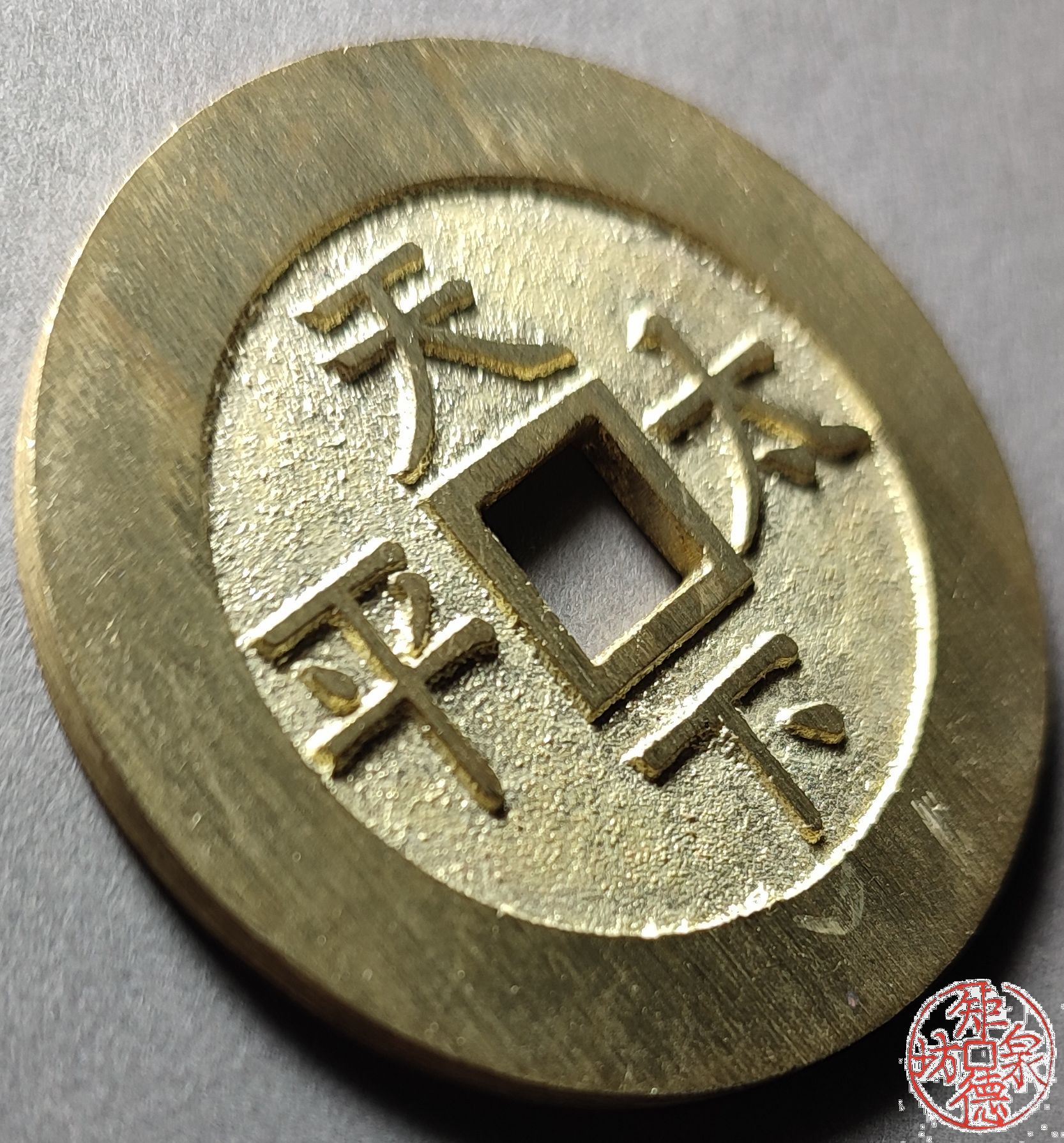 为了尽量还原古代钱币的文字神韵与时代铸造特征,每一枚都进行手工修刀、打磨。会有打磨痕迹、刻刀痕迹,铸造气孔或者微小沙眼,这正是手工与机器制作的区别,并非瑕疵。