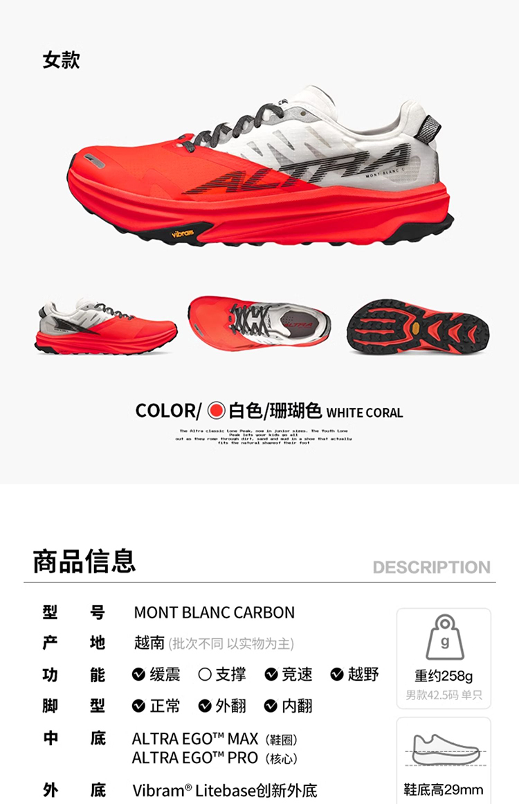 ALTRA奥创 MONT BLANC CARBON 男女款越野竞速防滑耐磨减震跑步运动鞋