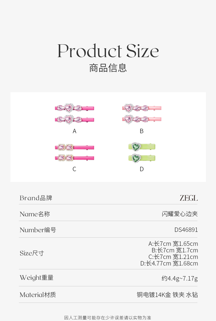 ZEGL爱心y2k多巴胺发夹女后脑勺一字夹鸭嘴夹侧边可爱发饰头饰品