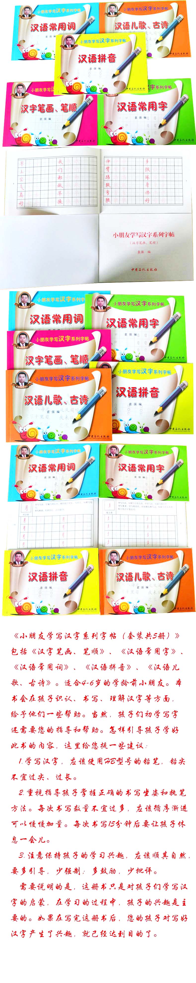 《小朋友学写汉字系列字帖(套装共5册)》括《汉字笔画、笔顺》、《汉语常用字》、《汉语常用词》、《汉语拼音》、《汉语儿歌、古诗》。《小朋友学写汉字系列字帖(套装共5册)》适合4-6岁的学龄前小朋友。《小朋友学写汉字系列字帖(套装共5册)》会在孩子识认、书写、理解汉字等方面,给予他们一些帮助。当然,孩子们初学写字还需要您的指导和帮助。怎样引导孩子学好《小朋友学写汉字系列字帖(套装共5册)》的内容,这里给您提一些建议:1.学写汉字,应该使用HB型号的铅笔,铅尖不宜过尖、过长。