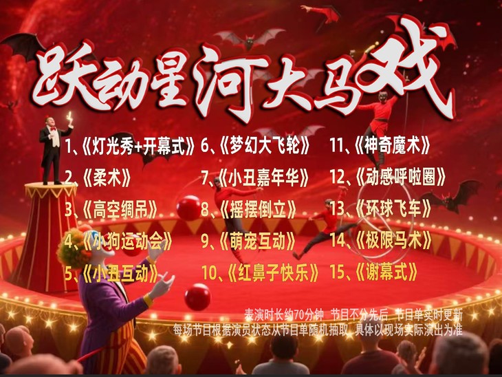 ·每天实际演出节目,会根据演员及动物和设备状态,从节目单中选取,每场演出70分钟左右