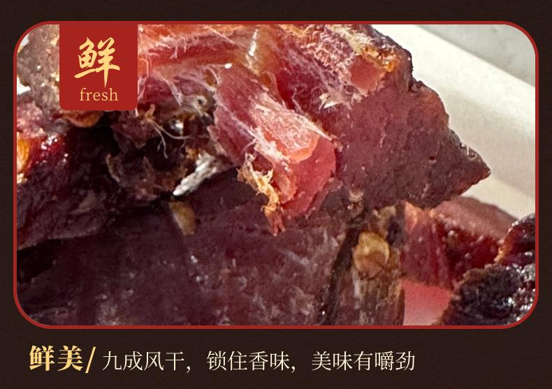 真空包装,开袋即食。其肉质饱满紧实,味道咸鲜醇香,每块肉干纹理清晰可见,软硬适中有嚼劲,吃了还想吃!
