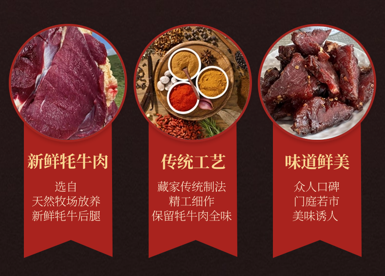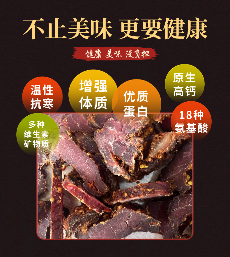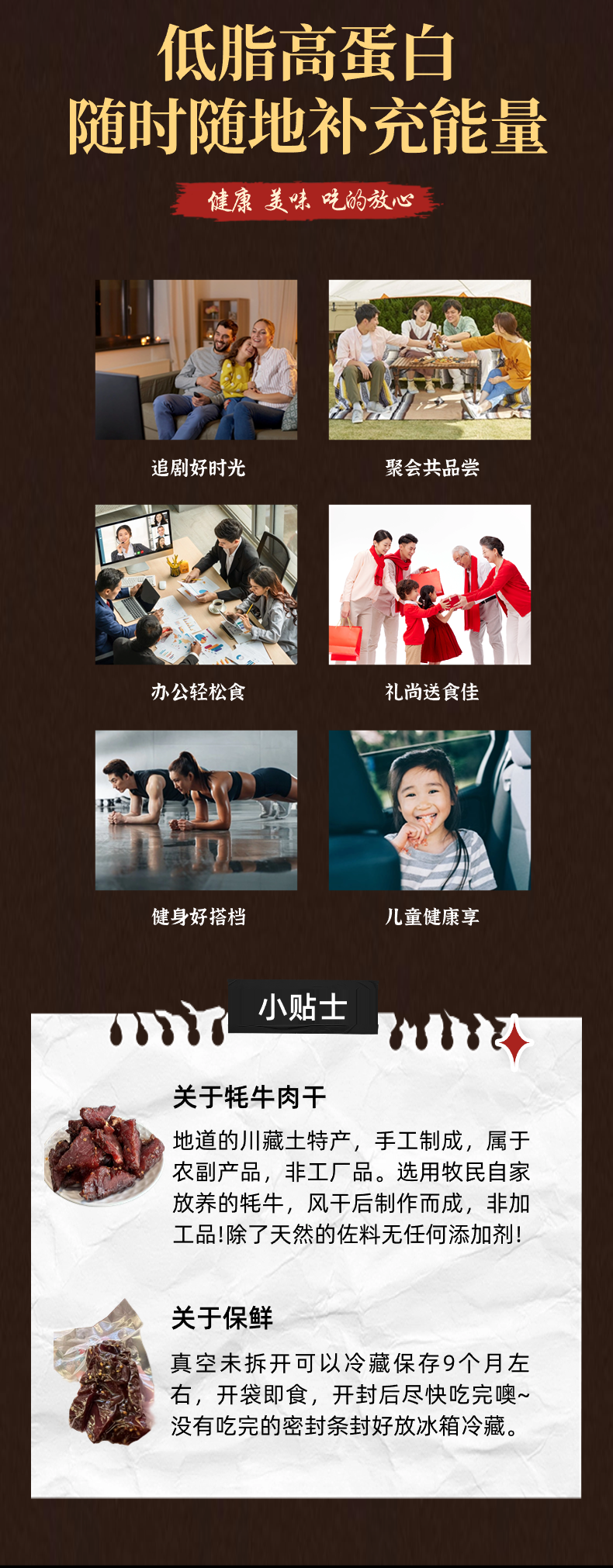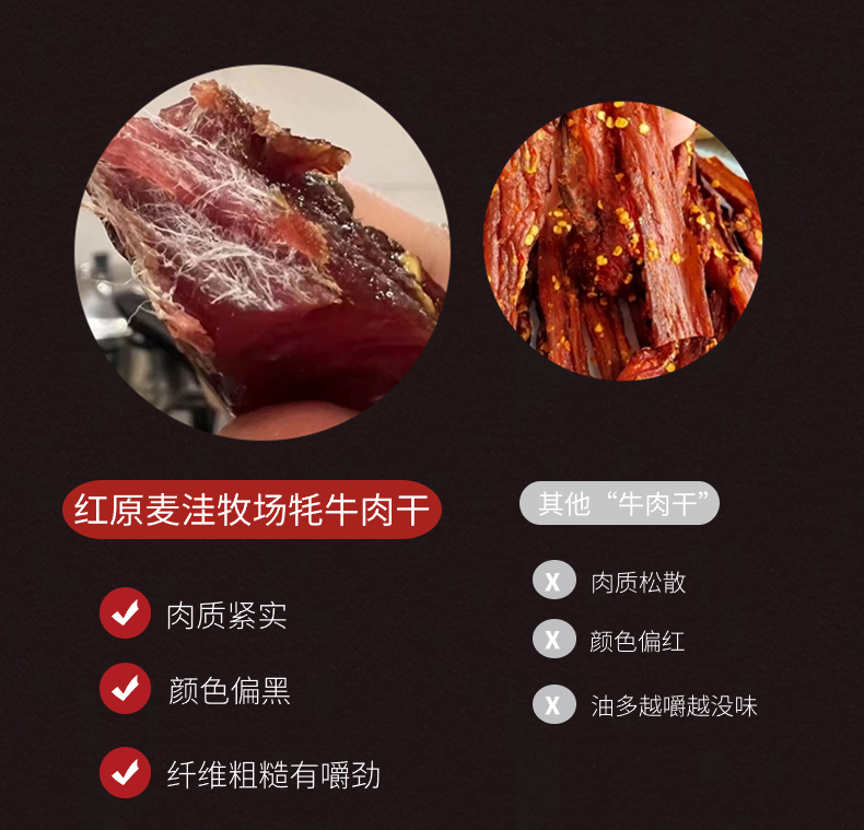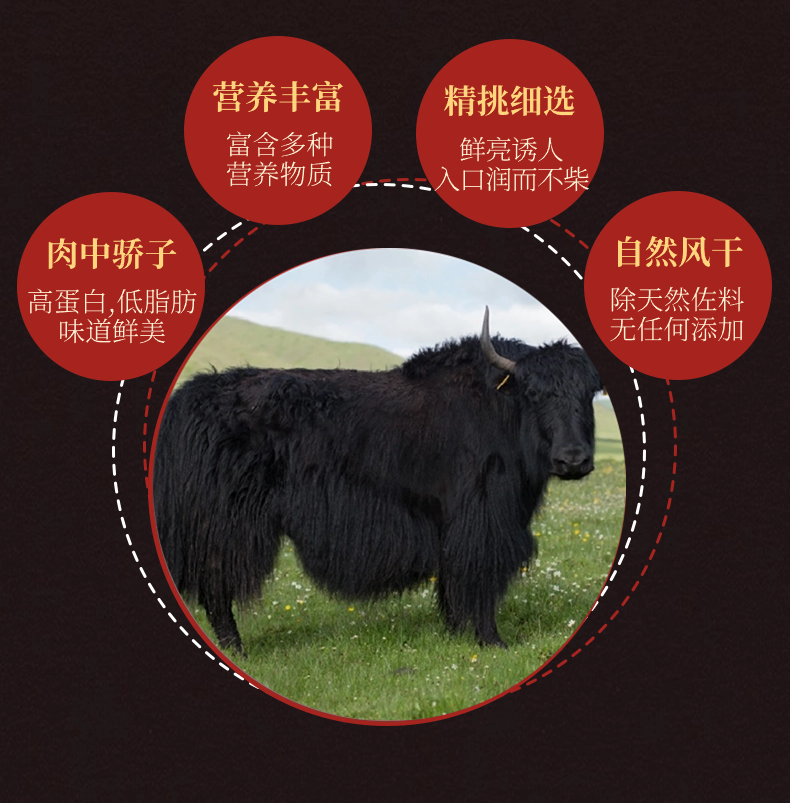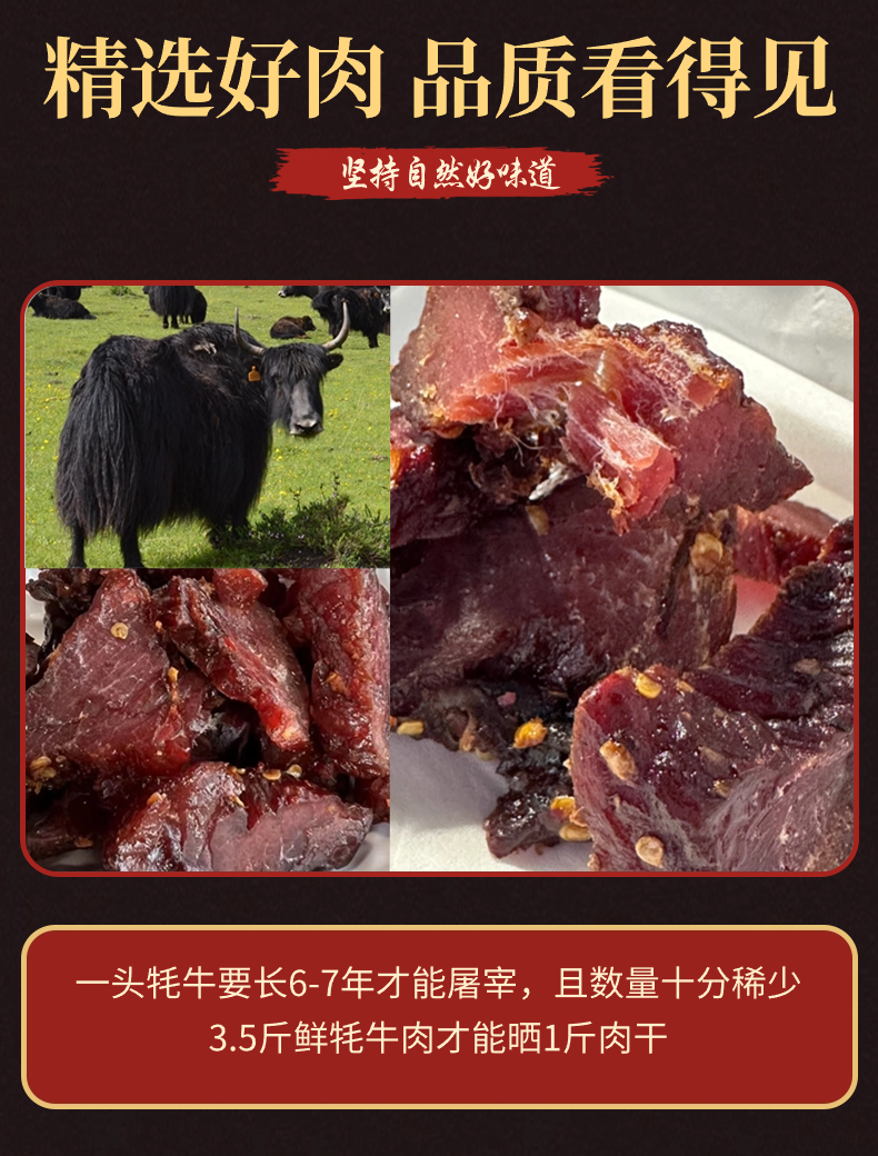 同时,身为勇士的铁骑,它们在自然原始的生长过程中,每天满山地跑,锻炼出一身强健的肌肉。这也是这款牦牛肉干这么紧实耐嚼的“秘方”。