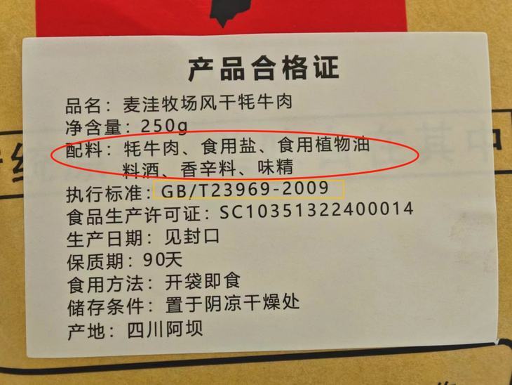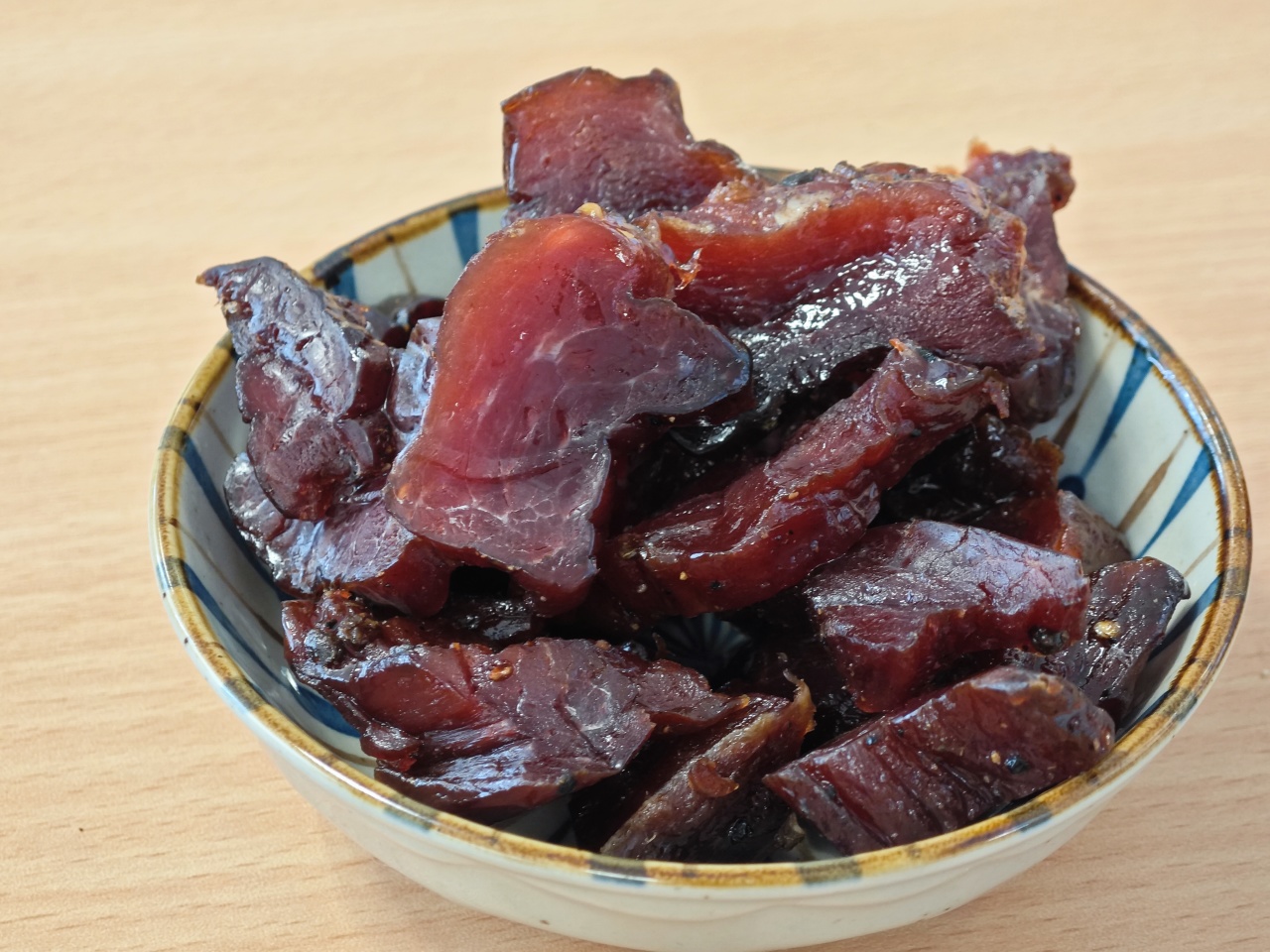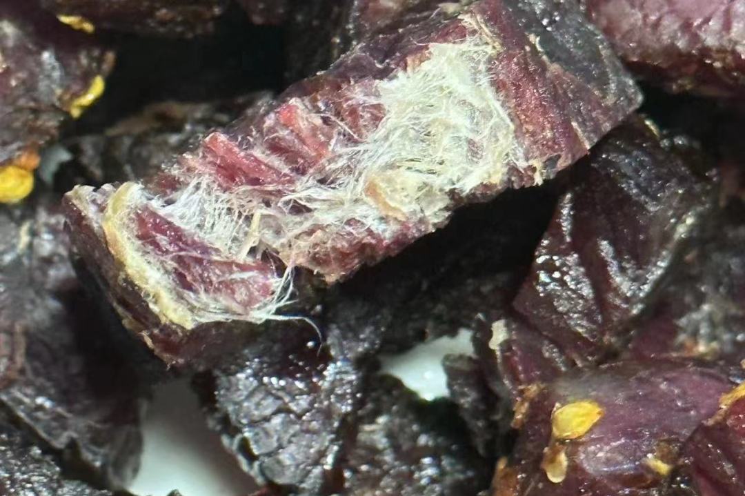 正宗的高原牦牛肉干,切断面没有明显的颗粒感,肉质紧实,不易散开。