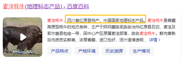 四川阿坝红原的麦洼牧场牦牛,也是中国国家地理标志产品。作为青藏高原型牦牛的地方良种之一,肉质密实鲜美,浓厚香醇,适口性好。