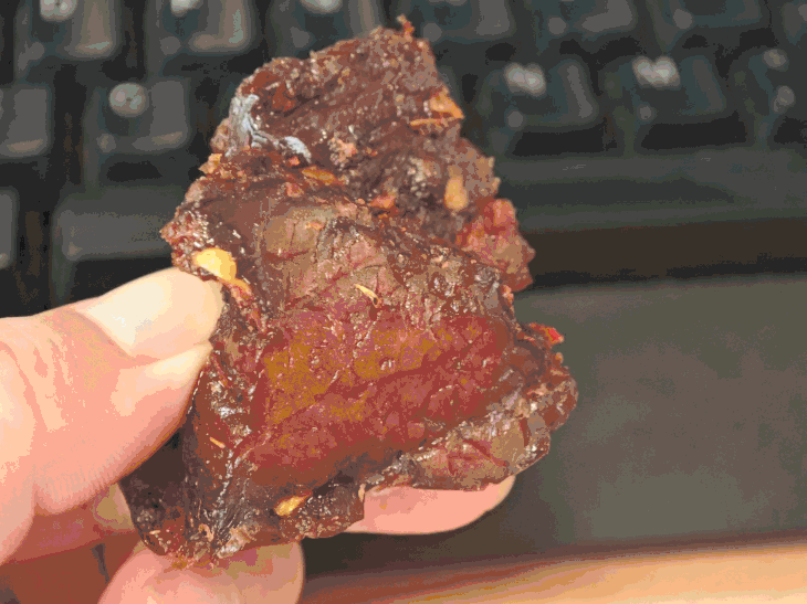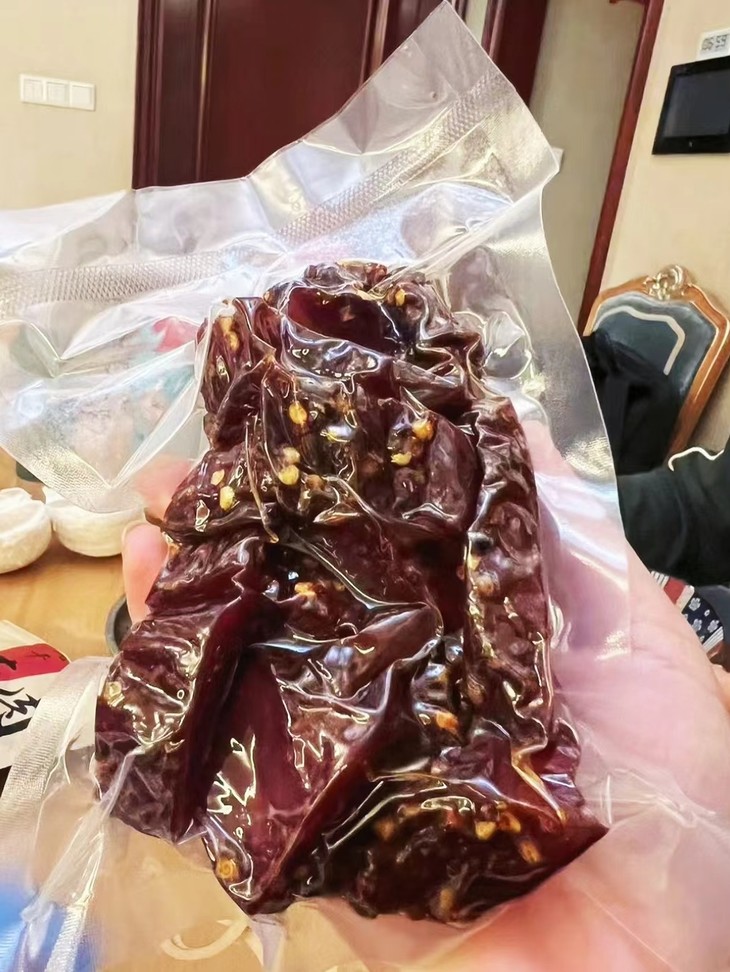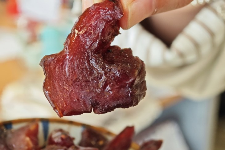 ▲八妹实拍,虽然是风干的,但是油润感十足,口感上软硬适中,特别有嚼劲!