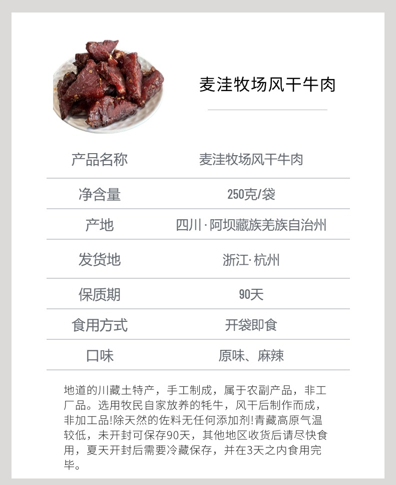 【分销】巨好吃回购王!麦洼牧场风干牦牛肉250g/袋,3斤半鲜牦牛肉才能风干成1斤牦牛肉干,低脂高蛋白