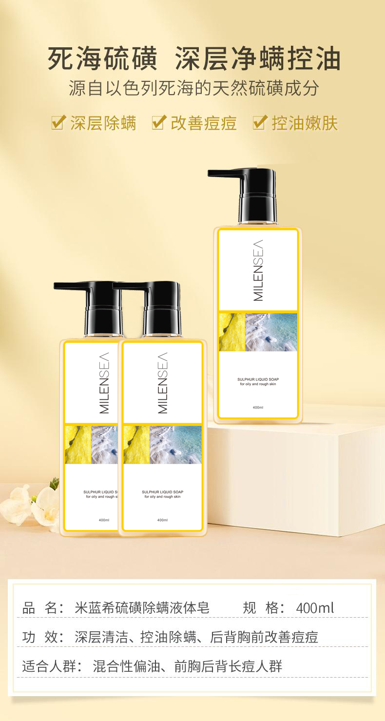 【专柜】米蓝希液体硫磺皂硫黄香皂洗脸沐浴露洗发水三合一除螨改善后背痘400ml/瓶