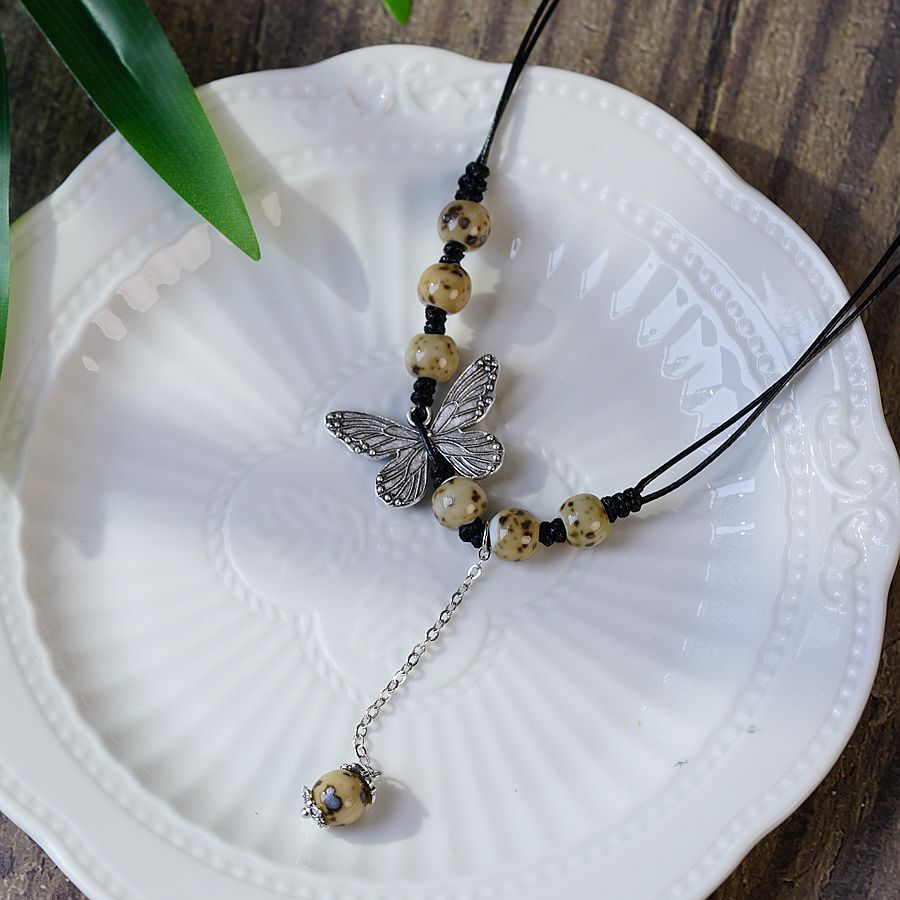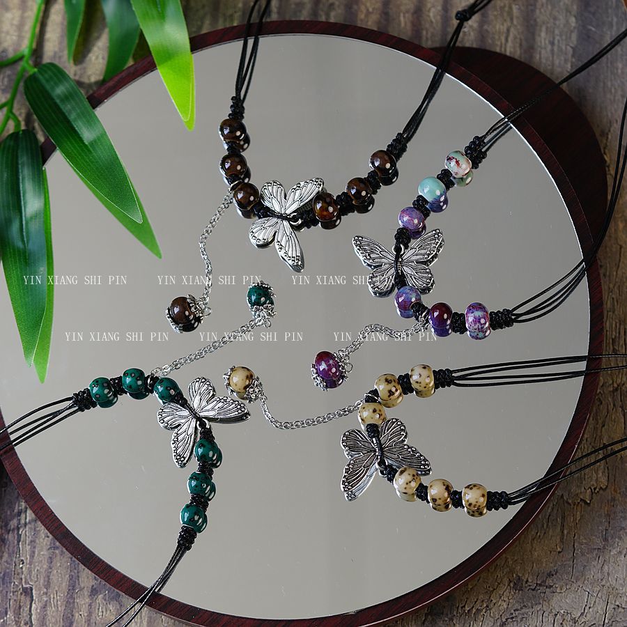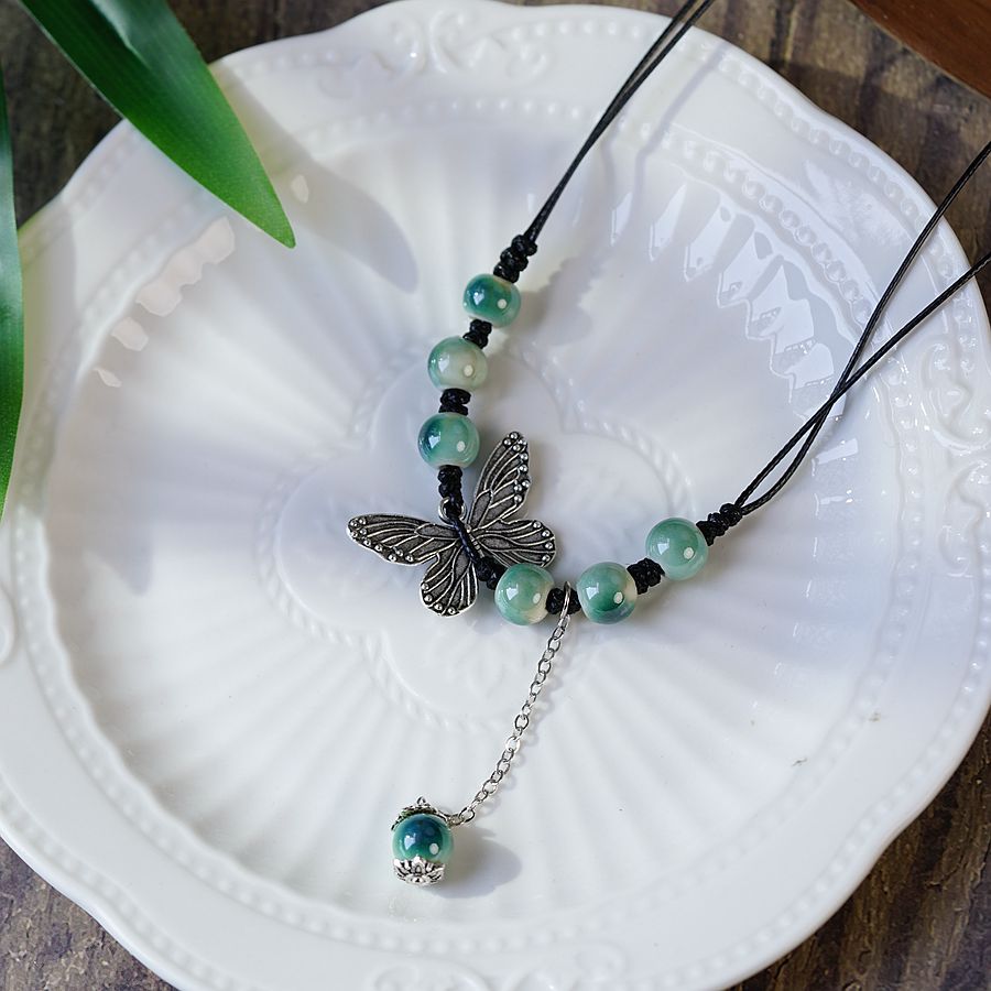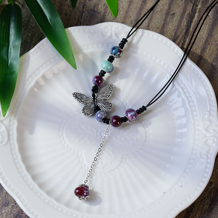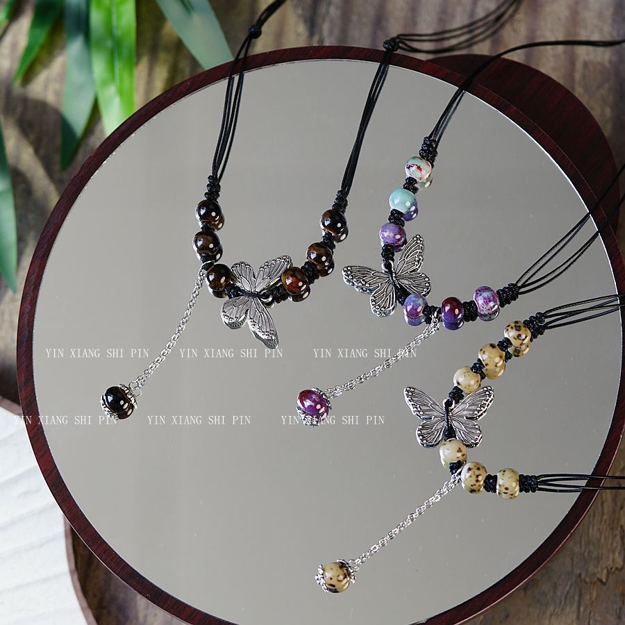 【手作新中式 复古陶瓷蝴蝶项链女】民族风国潮古风锁骨链 抽绳颈链