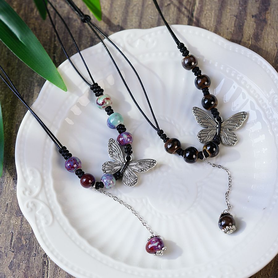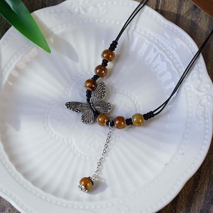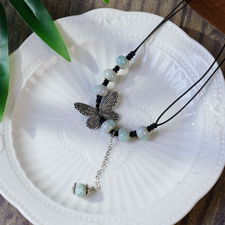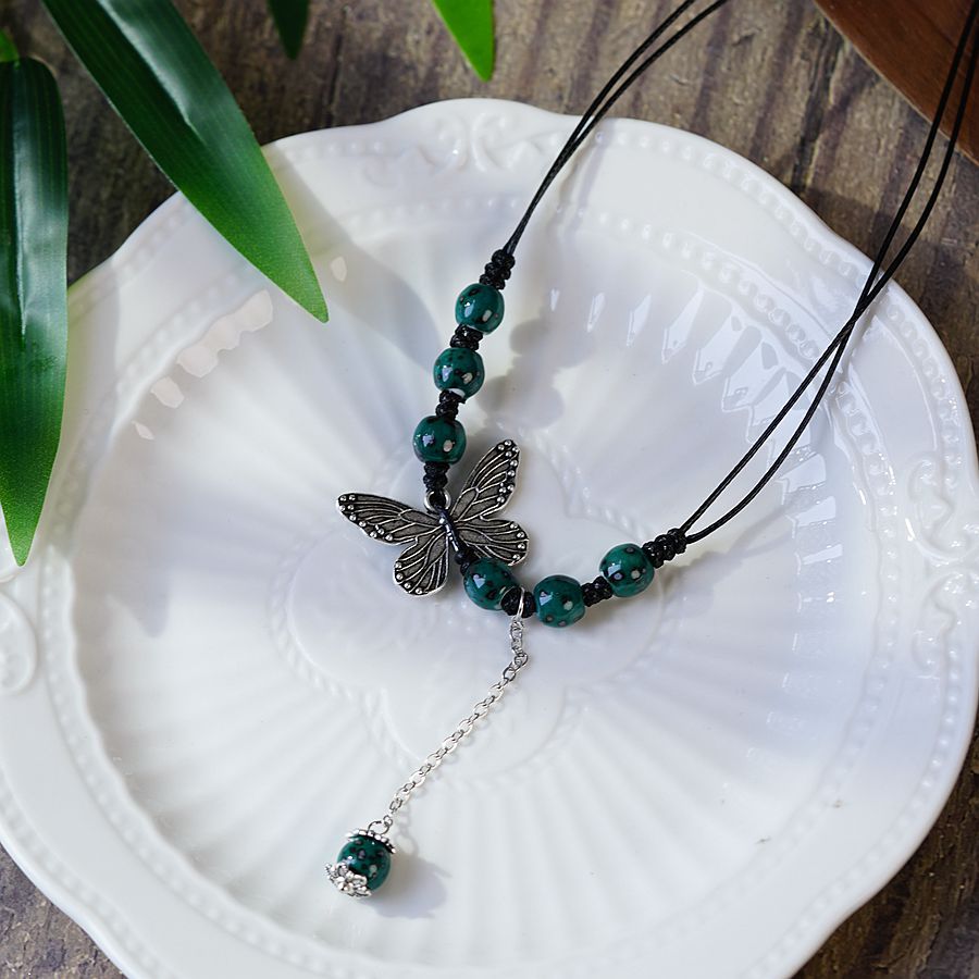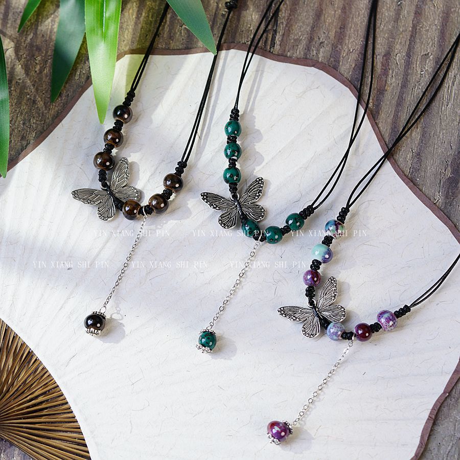 【手作新中式 复古陶瓷蝴蝶项链女】民族风国潮古风锁骨链 抽绳颈链