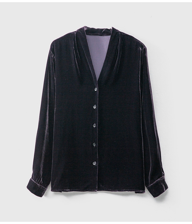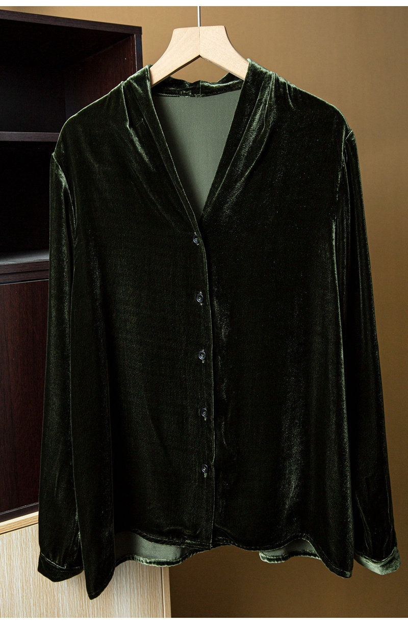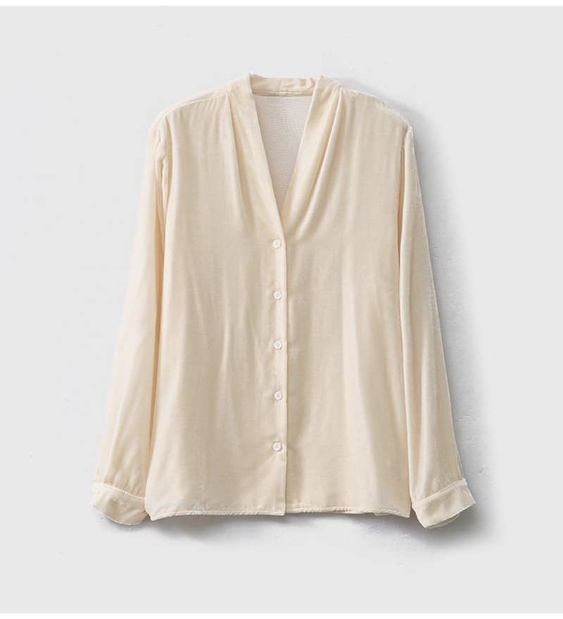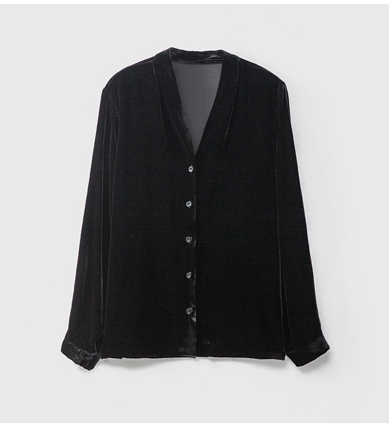 2026春优雅气质V领长袖单排扣真丝丝绒衬衫