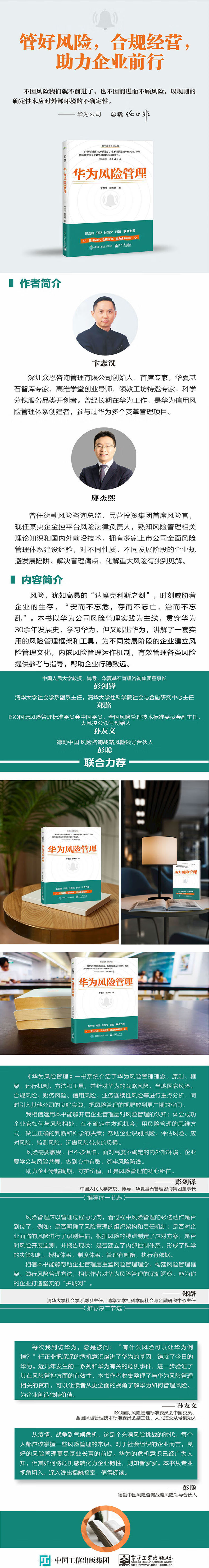 风险,犹如高悬的“达摩克利斯之剑”,时刻威胁着企业的生存,“安而不忘危,存而不忘亡,治而不忘乱”。本书以华为公司风险管理实践为主线,贯穿华为30余年发展史,学习华为,但又跳出华为,讲解了一套实用的风险管理框架和工具,为不同发展阶段的企业建立风险管理文化,内嵌风险管理运作机制,有效管理各类风险提供参考与指导,帮助企业行稳致远。