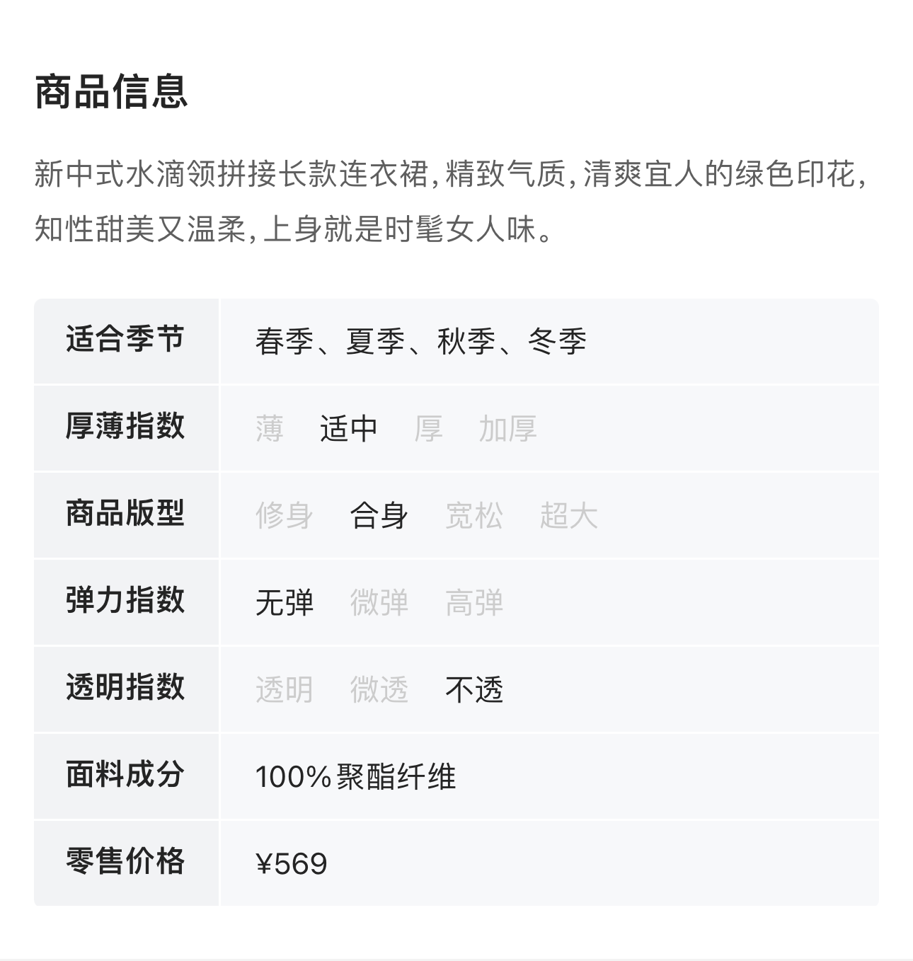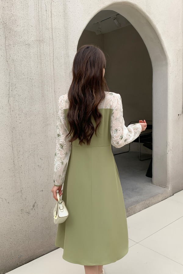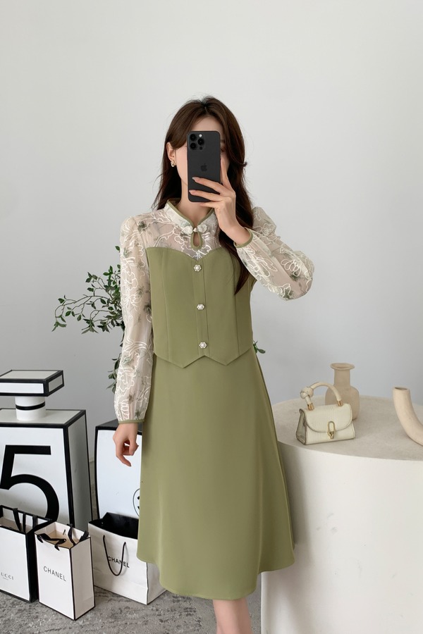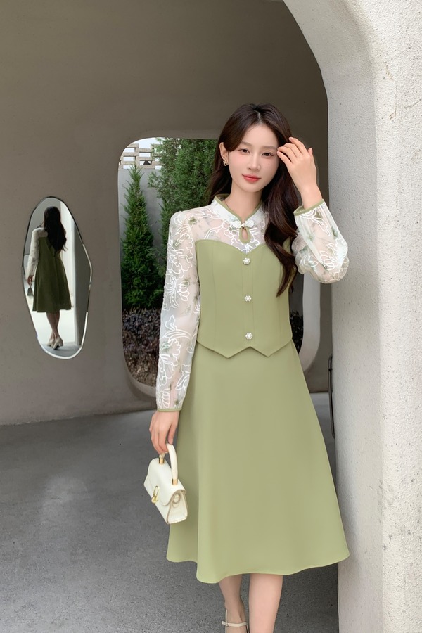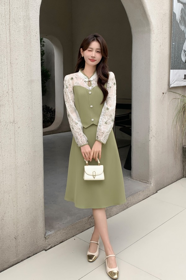 Le Malene 绿色新中式水滴领拼接式连衣裙 19783