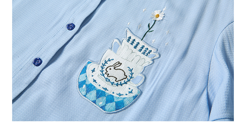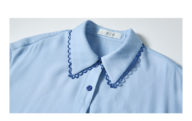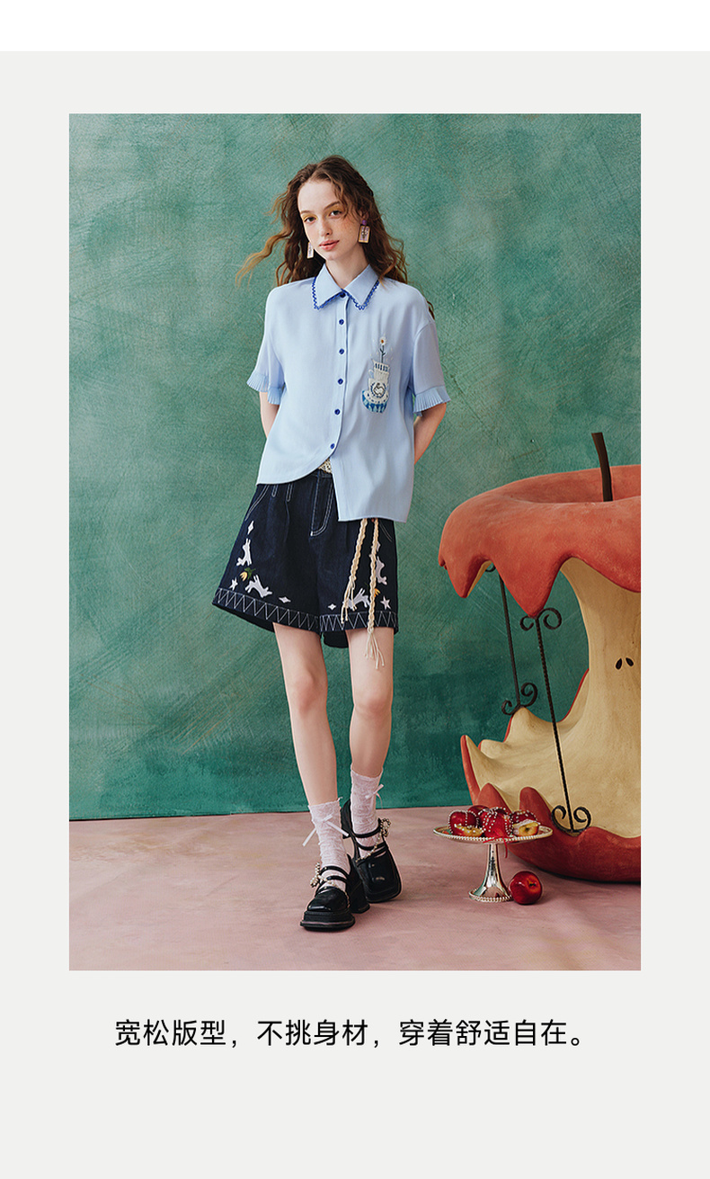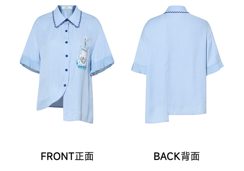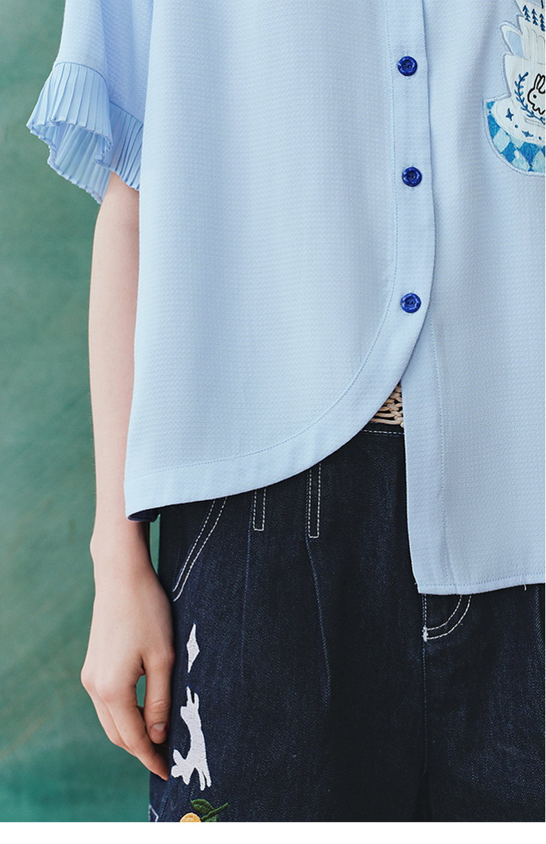 两三事蓝兔风铃2025夏季新款小清新刺绣印花不对称下摆衬衫女宽松