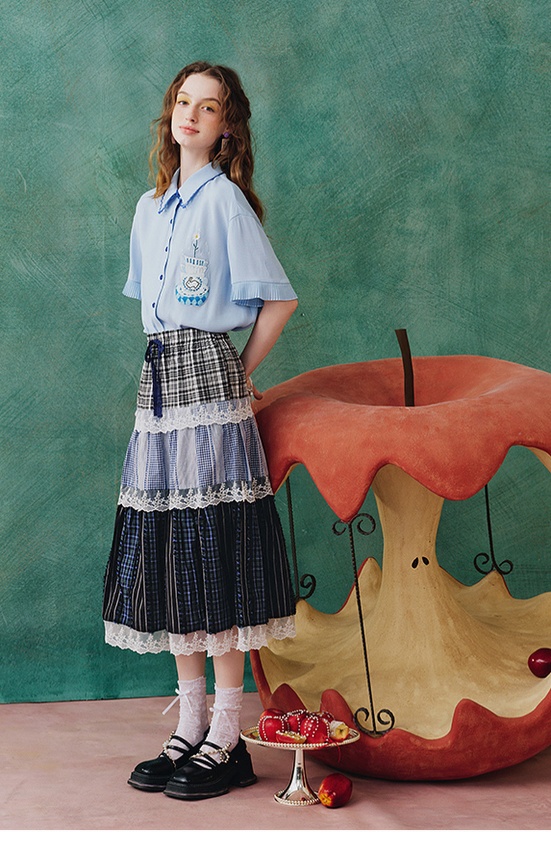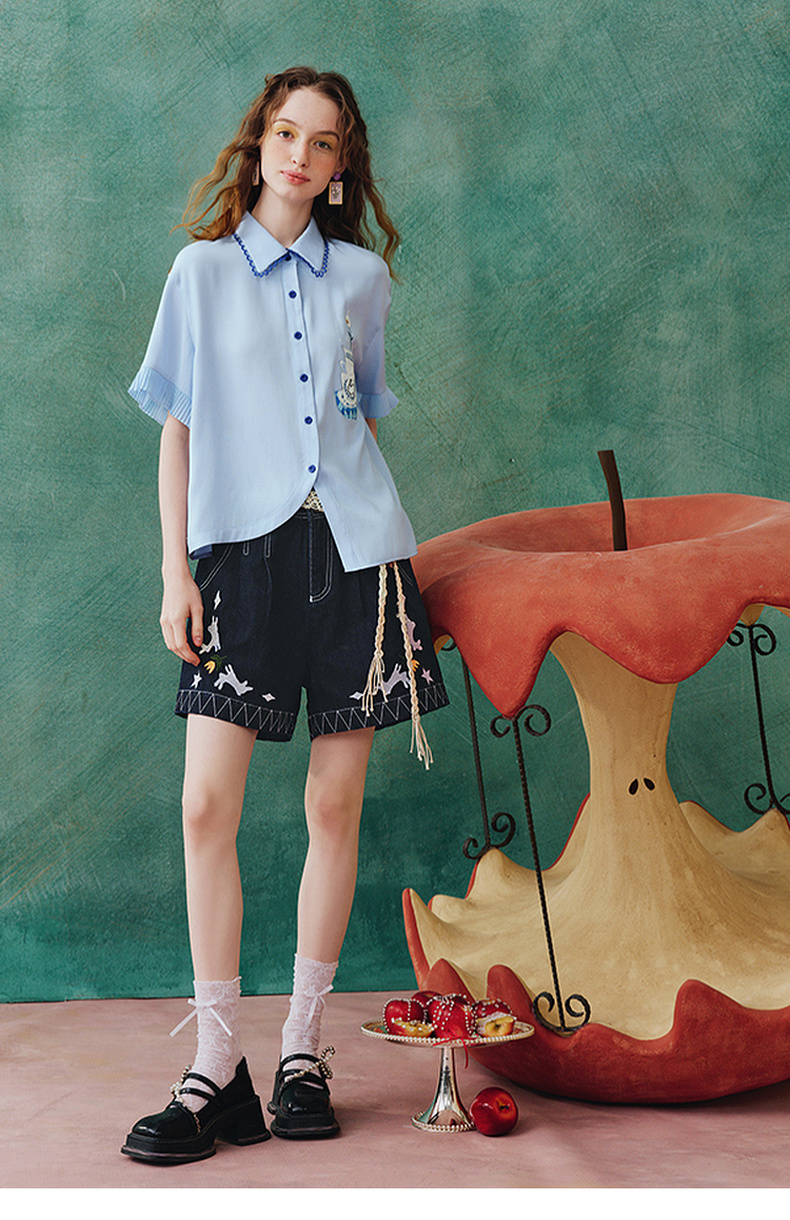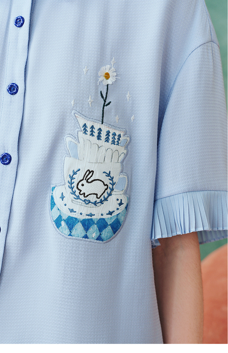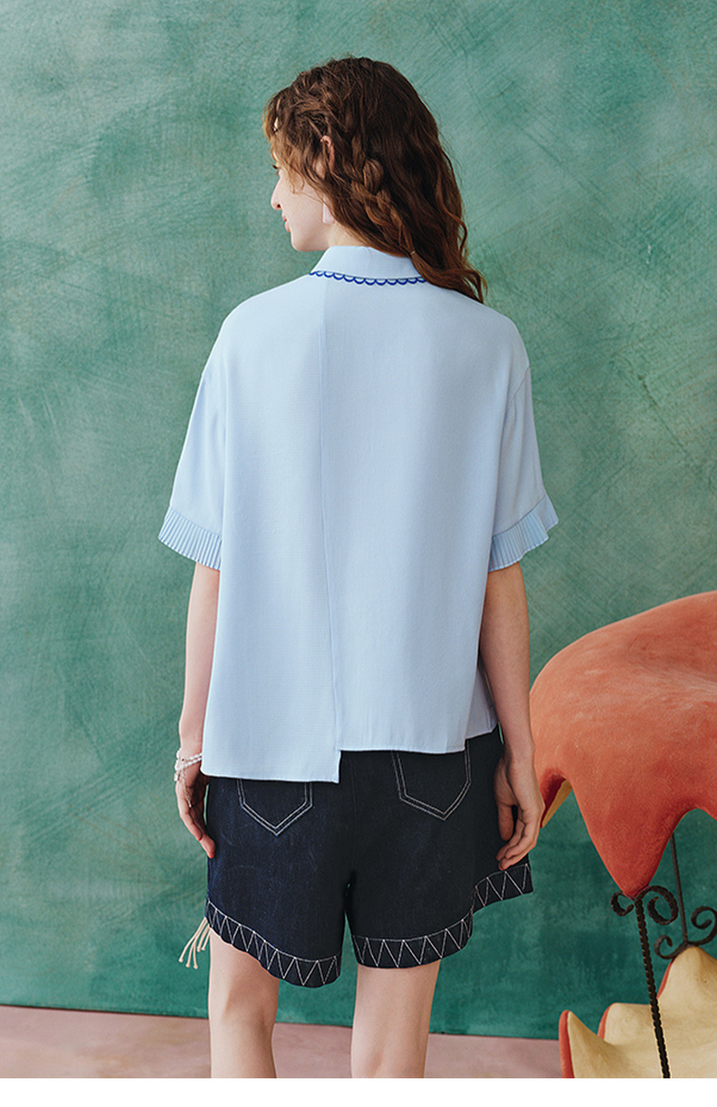 两三事蓝兔风铃2025夏季新款小清新刺绣印花不对称下摆衬衫女宽松